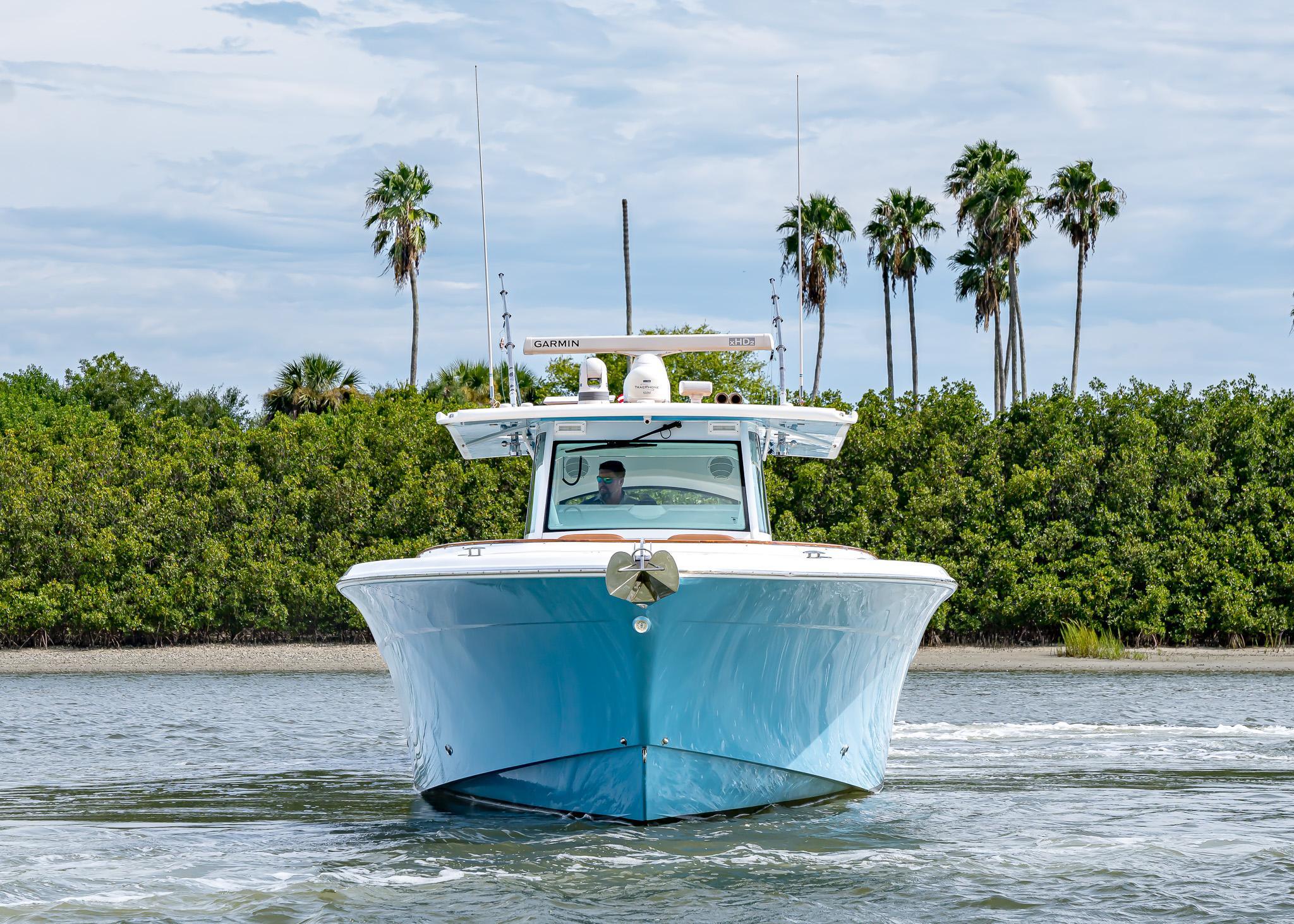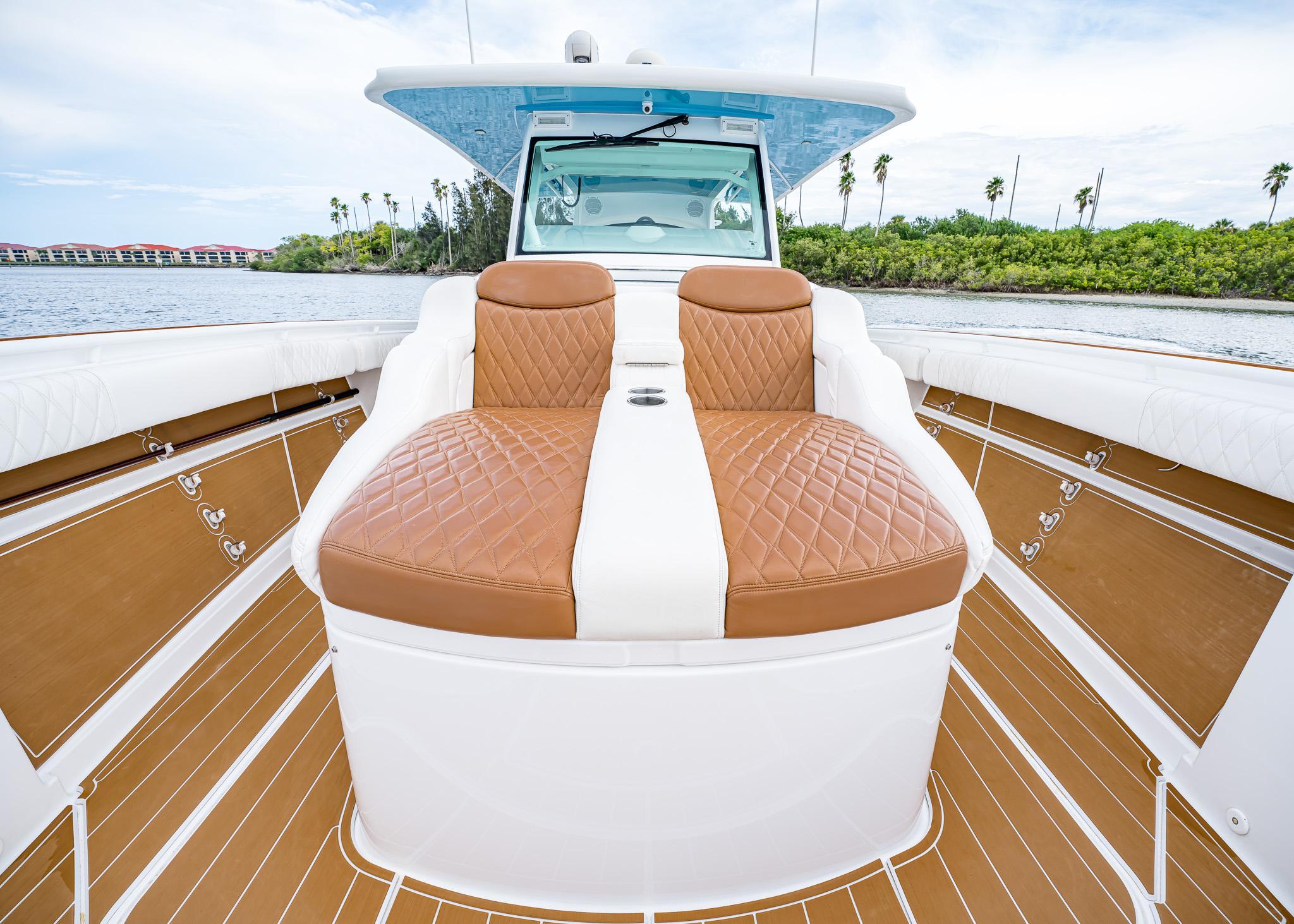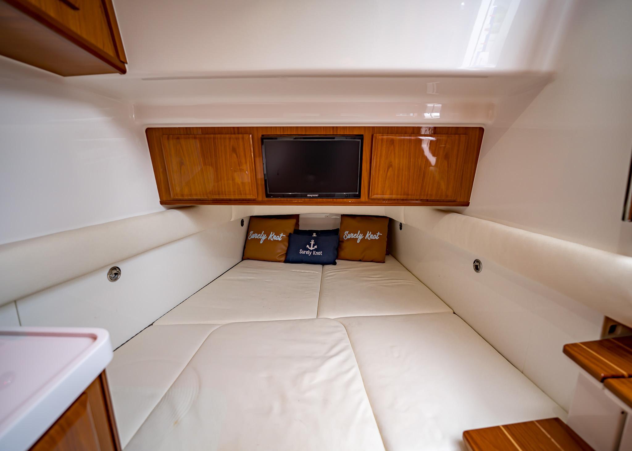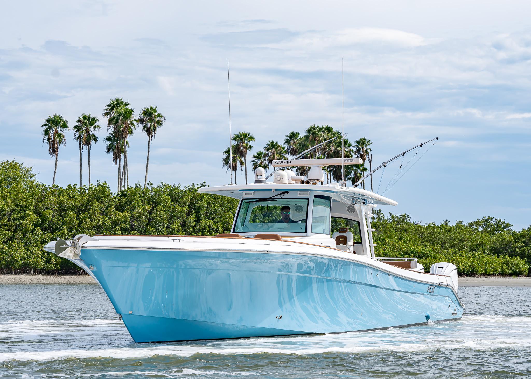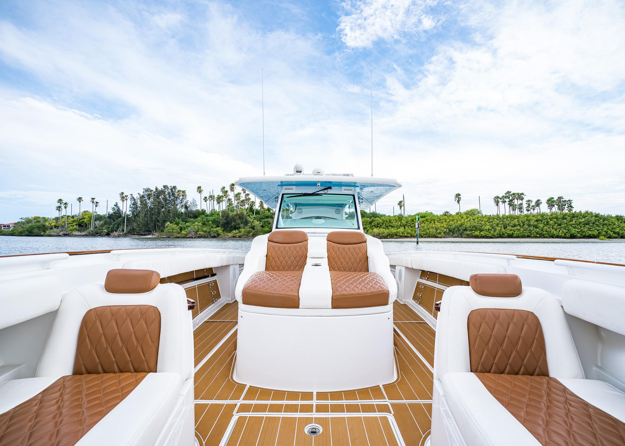 Finally, a large center console yacht with the sophisticated design to perfectly balance speed, ride, comfort, and all of the luxury of your “dream” yacht. The bow area is dual purpose with seating to accommodate guests on the forward-facing lounger or around bow seats and table that convert to a large sun pad for lazy days catching rays; or remove the cushions for a fully functional fishing platform. The luxuriously functional cabin with queen sized berth, storage galore, galley kitchen, and separate head/shower compartment is the perfect place for air-conditioned comfort on hot days as well as longer trips with overnight stays. An automotive inspired helm station allows the captain to be fully aware of the surroundings while staying in tune with the endless functionality on-board including: charts and navigation, Sea Keeper®, generator, ample stereo system, the quad engine package, and more. For the uncompromising, the Sueños will satisfy any experience you can imagine, and take you places few other Center Console Yachts dream to embark.