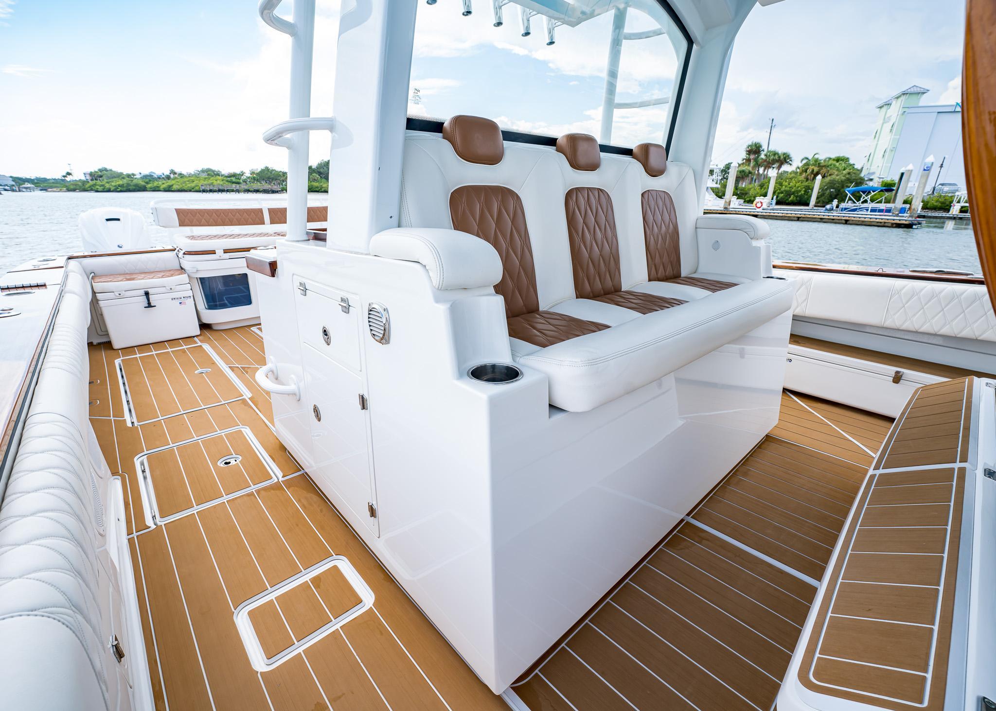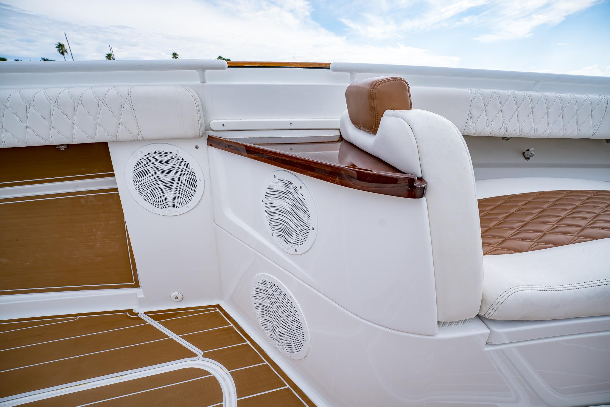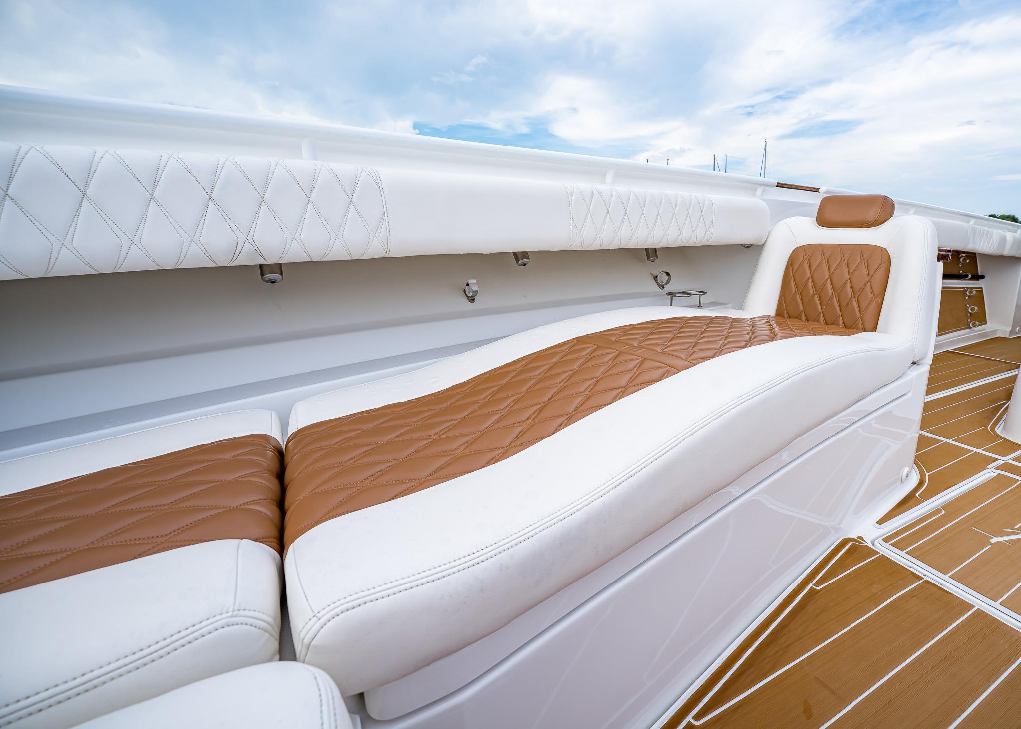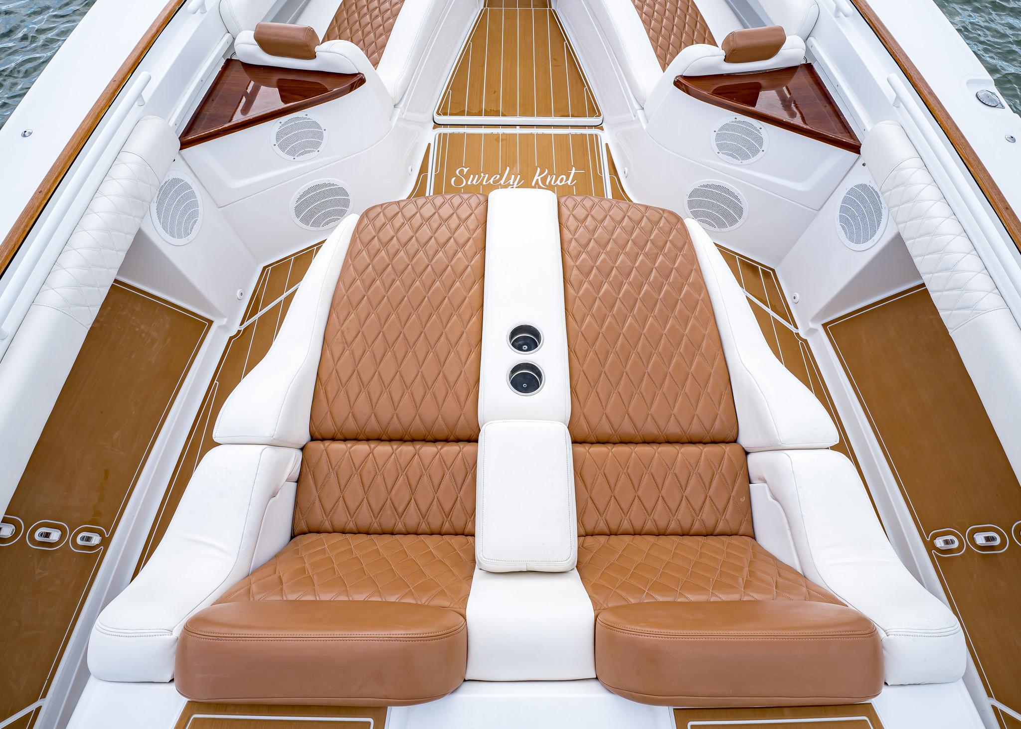 Finally, a large center console yacht with the sophisticated design to perfectly balance speed, ride, comfort, and all of the luxury of your “dream” yacht. The bow area is dual purpose with seating to accommodate guests on the forward-facing lounger or around bow seats and table that convert to a large sun pad for lazy days catching rays; or remove the cushions for a fully functional fishing platform. The luxuriously functional cabin with queen sized berth, storage galore, galley kitchen, and separate head/shower compartment is the perfect place for air-conditioned comfort on hot days as well as longer trips with overnight stays. An automotive inspired helm station allows the captain to be fully aware of the surroundings while staying in tune with the endless functionality on-board including: charts and navigation, Sea Keeper®, generator, ample stereo system, the quad engine package, and more. For the uncompromising, the Sueños will satisfy any experience you can imagine, and take you places few other Center Console Yachts dream to embark.