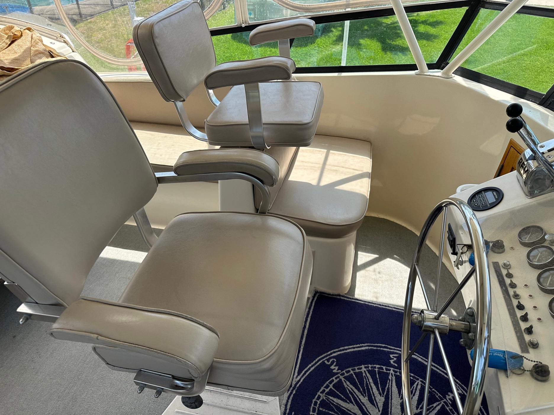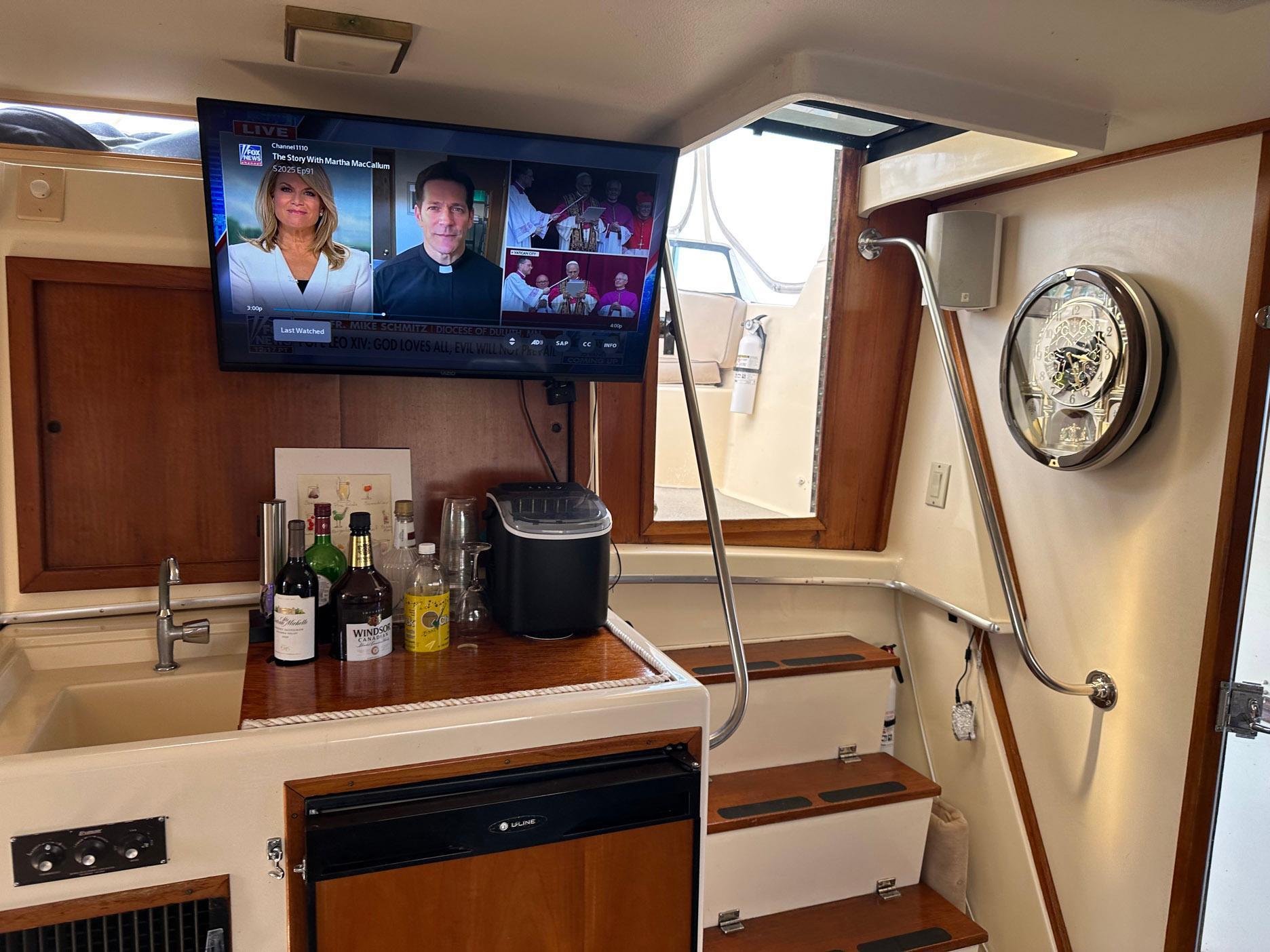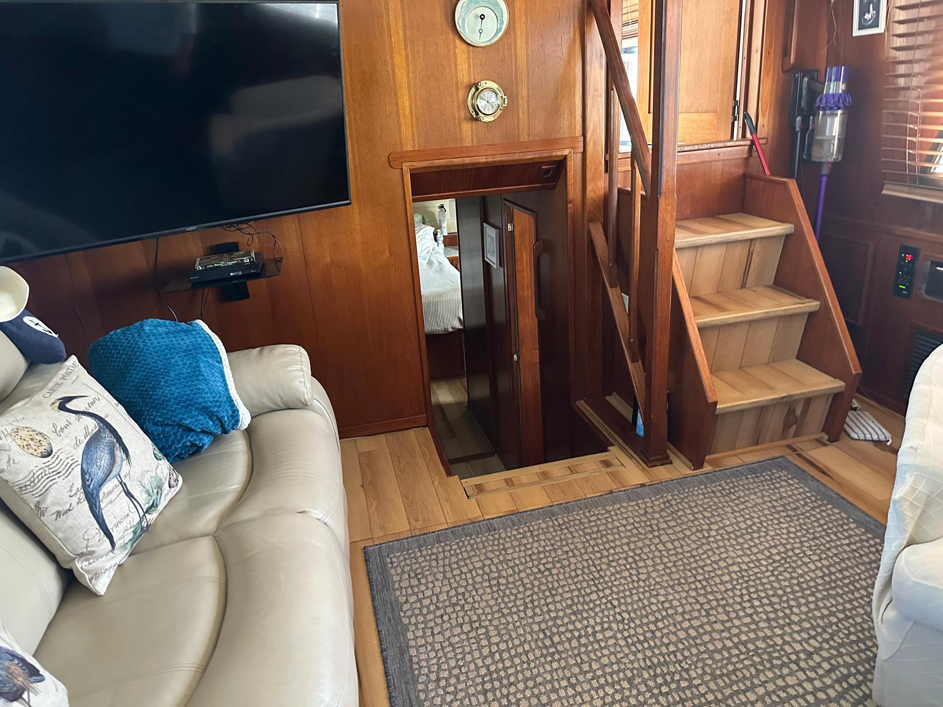 Main salon is down three steps from the fully enclosed aft deck. On the starboard side is a convertible sofa with barrel chair opposite. The large windows give you plenty of brightness and openness, entertainment center has electric fireplace and sound system. Steps from salon to deck and deck to flybridge.