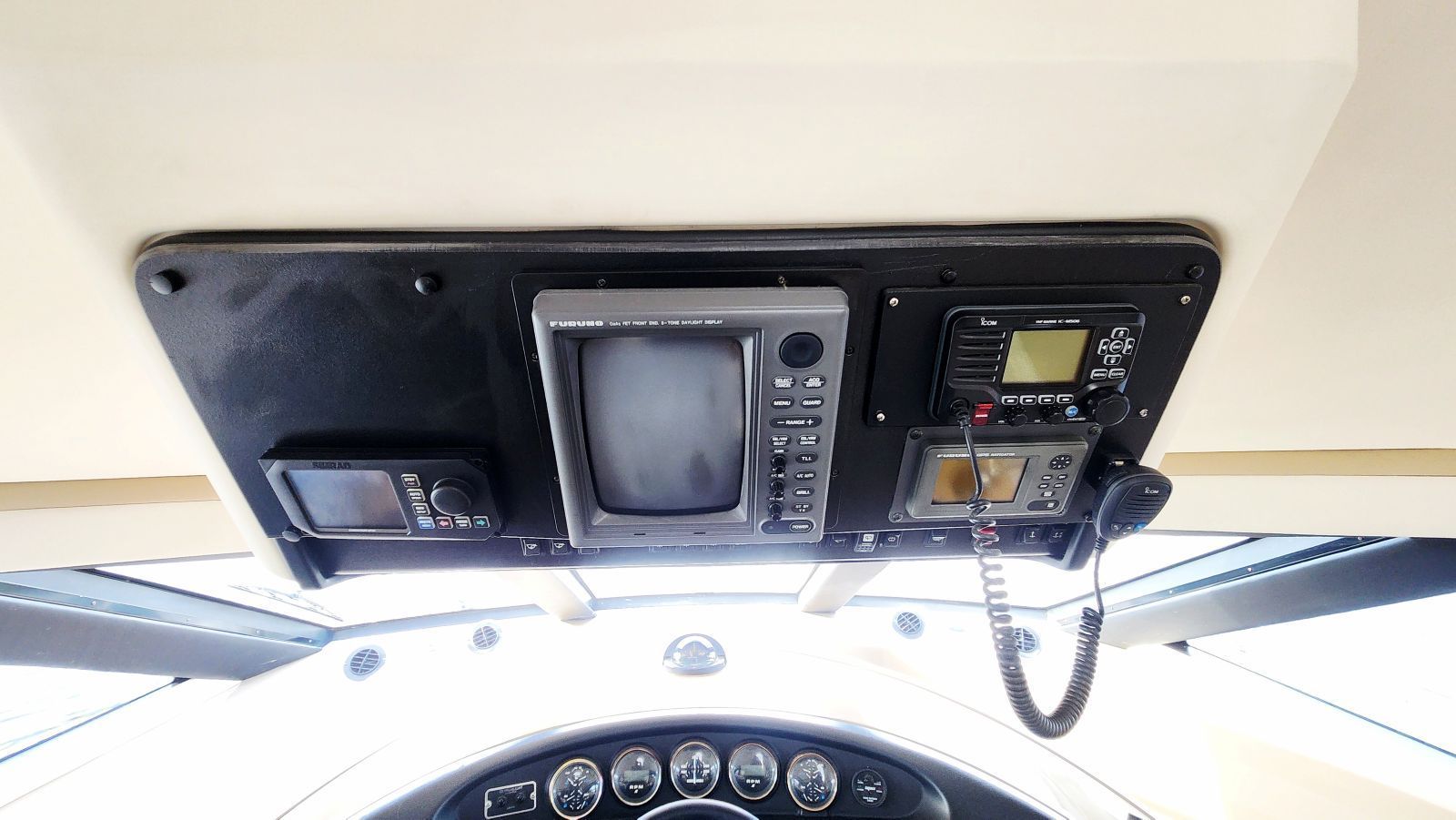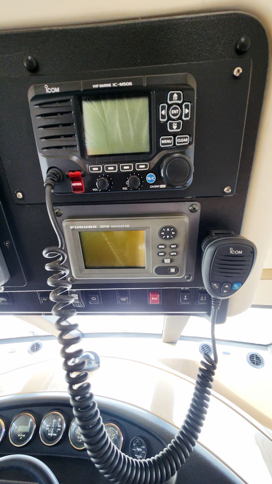 At the helm, everything is positioned for easy access and smooth operation. A classic Ritchie PowerDamp compass provides reliable heading reference, while a Furuno radar and GPS system and a new Garmin GPSmap 942xs chartplotter give the captain precise situational awareness in all conditions. The Garmin autopilot with remote offers steady course-keeping and hands-off confidence on long runs, while an Icom VHF radio keeps communication clear.