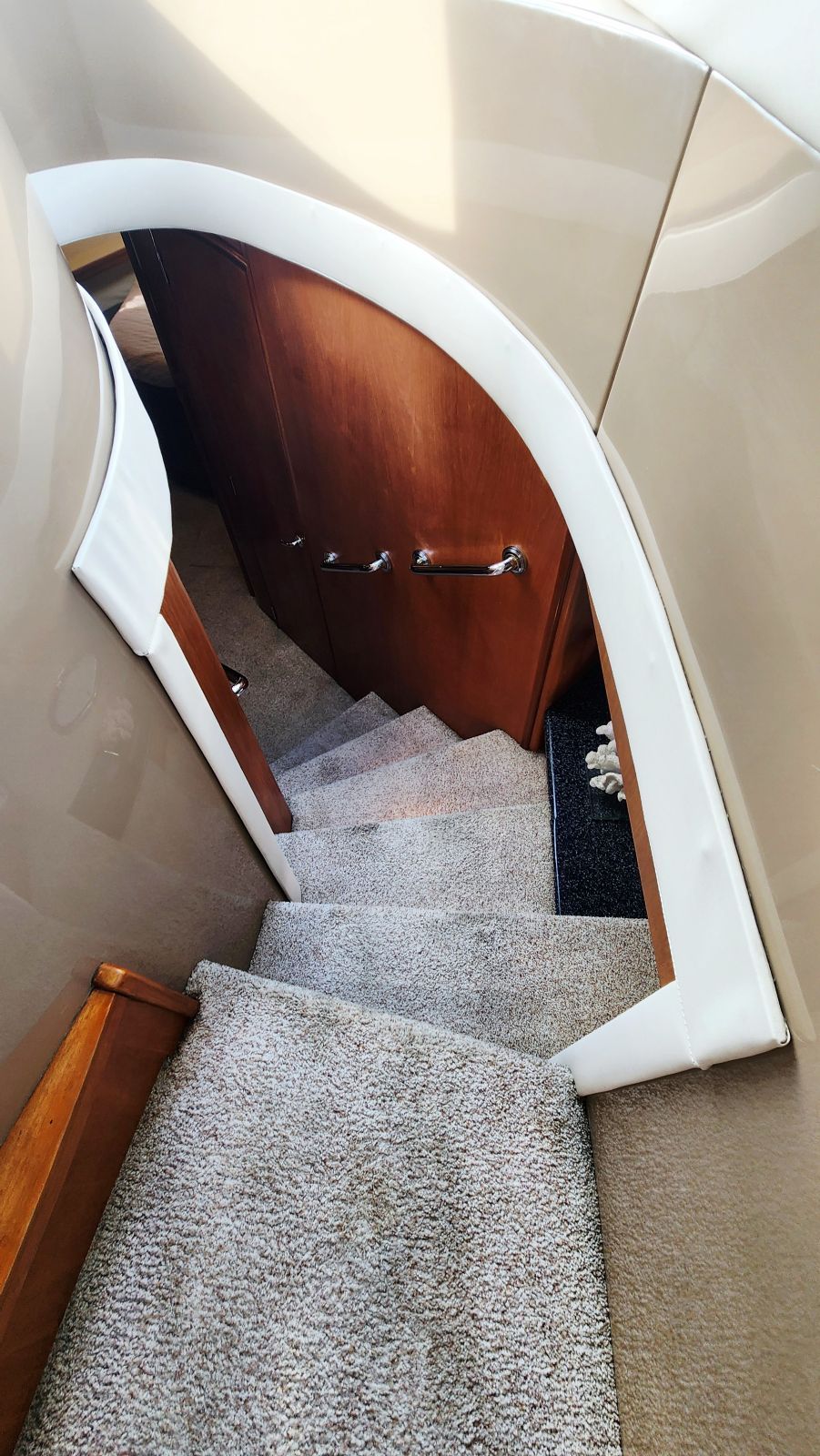 Far more than just a passageway, the companionway aboard Kateri Marie is an integral part of her thoughtful interior design—creating a seamless transition from the bright, social spaces above to the quiet, private comfort of the staterooms below. Carver 530 Master Stateroom