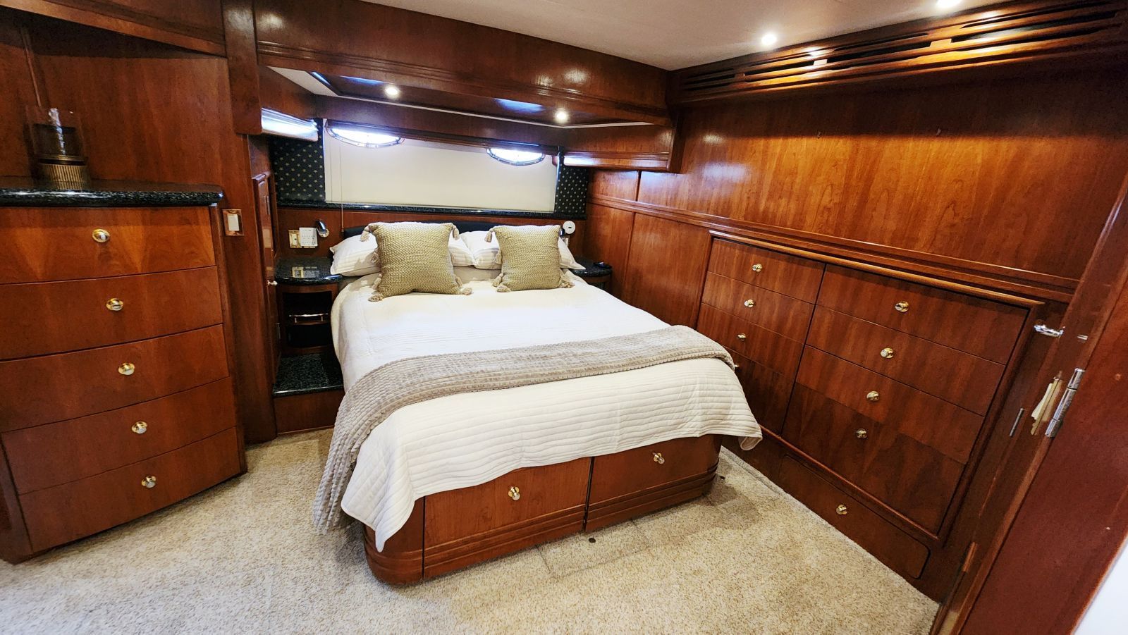 At the center sits a walkaround queen berth, framed by rich cherry cabinetry that balances warmth with sophistication. Generous storage options—including hanging lockers, built-in drawers, and overhead cabinets—ensure there’s ample room to stay organized, whether you’re weekend cruising or living aboard for months at a time. Natural light filters through opening portlights, while recessed overhead lighting and bedside reading lamps create the perfect ambiance for quiet evenings or early mornings at anchor.