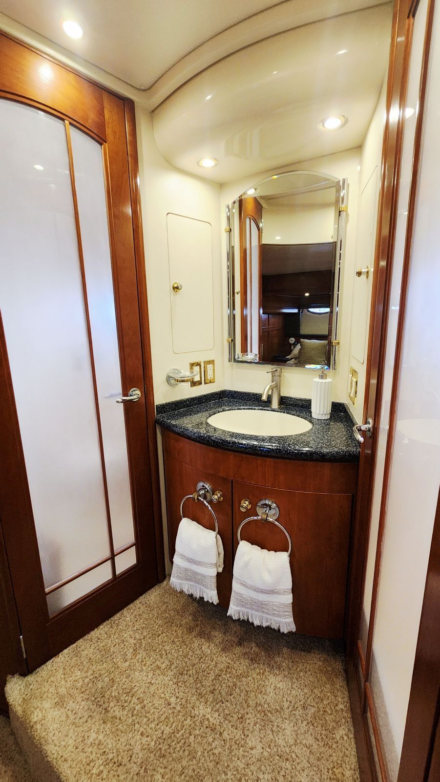 The inviting ambiance of the upper deck continues below, with recessed lighting and rich cherry cabinetry carrying the warmth of the salon into the private quarters. Conveniently, the guest head is accessible directly from the hallway, ensuring comfort for overnight visitors without disturbing the staterooms.