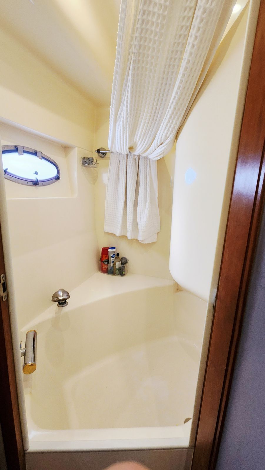 The guest head aboard Kateri Marie is designed with both versatility and comfort in mind, serving the forward VIP and portside guest staterooms while also functioning as a convenient day head for visitors aboard. Located to starboard, just off the main companionway, it provides easy access while maintaining a sense of privacy and refinement.