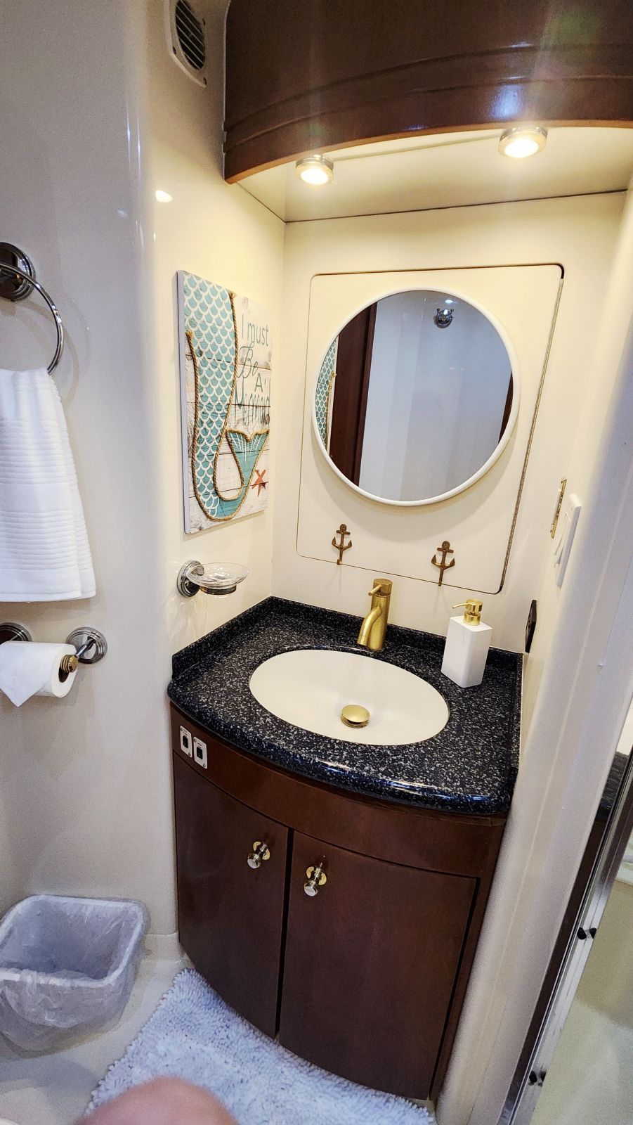 A molded vanity with a solid-surface countertop offers plenty of room for daily essentials, complemented by mirrored cabinetry and under-sink storage that keeps the space organized and practical. The design is bright, easy to maintain, and built with quality fixtures that stand up to everyday cruising.