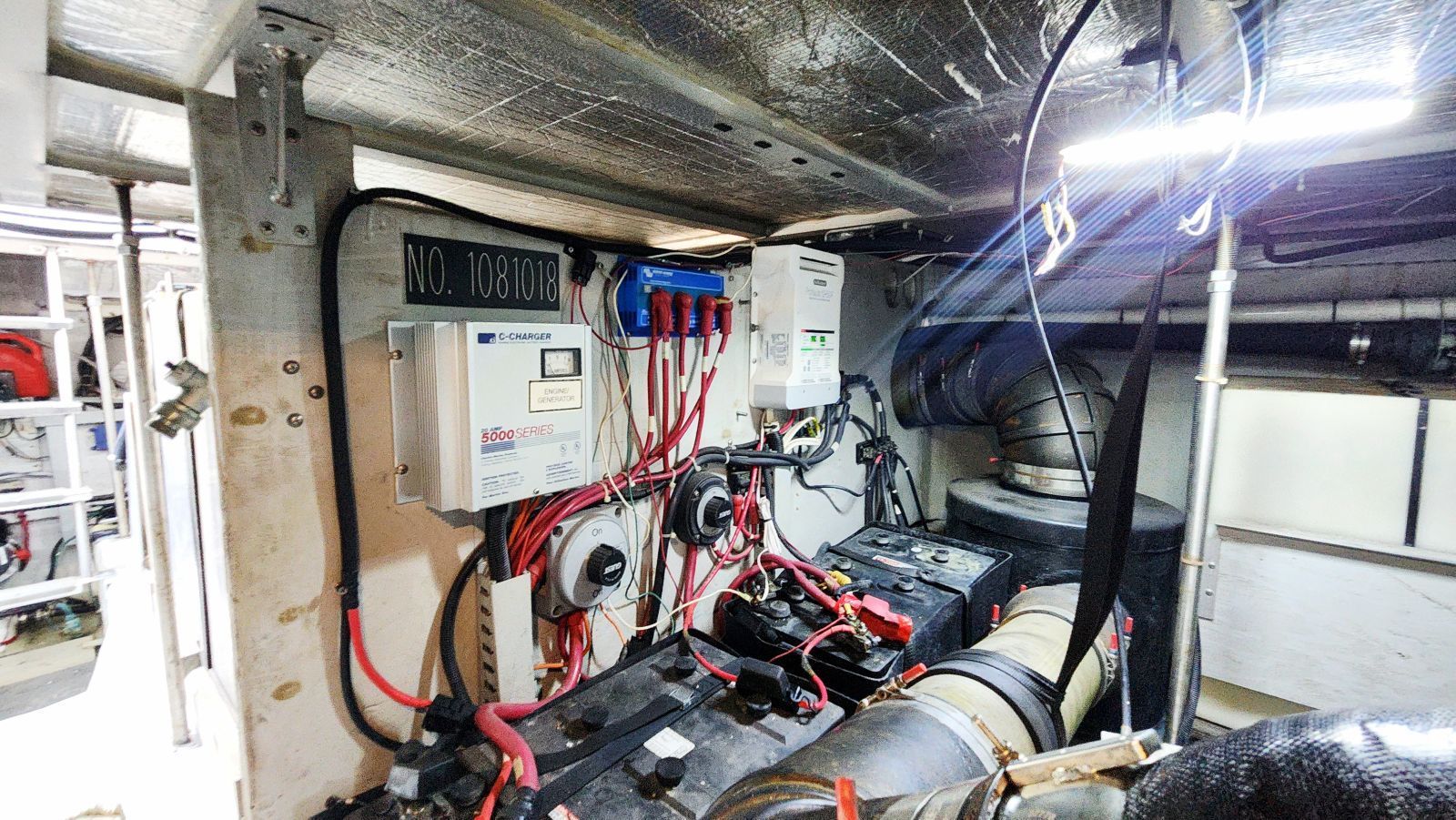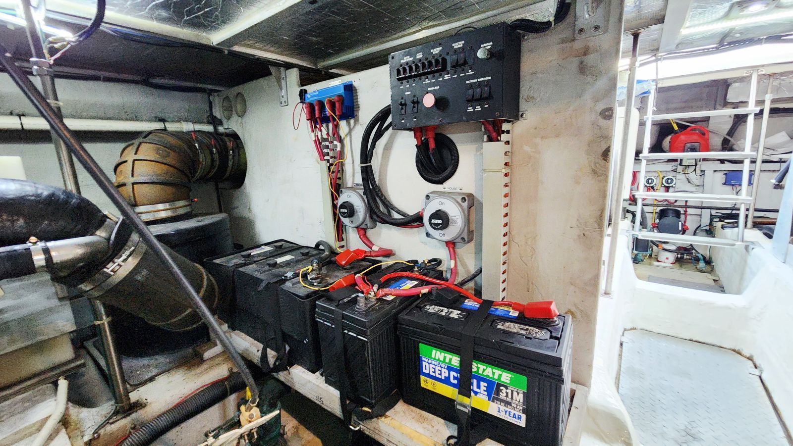 On the DC side, power is distributed through dedicated battery banks that keep critical systems reliable and independent. Each of her twin Cummins 6CTA8.3 engines is supported by its own 8D battery for confident starting, while additional 8D and Group 31 batteries supply the davit crane, bow thruster, and stern thruster. A pair of Group 31 batteries serve the house system, ensuring uninterrupted service for lighting, electronics, and everyday onboard functions.