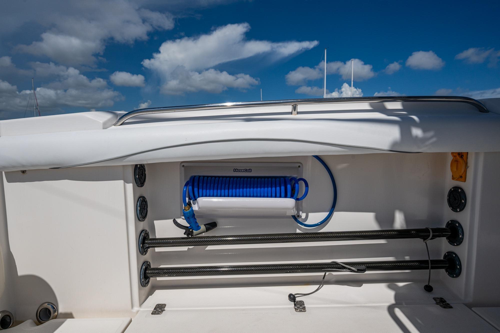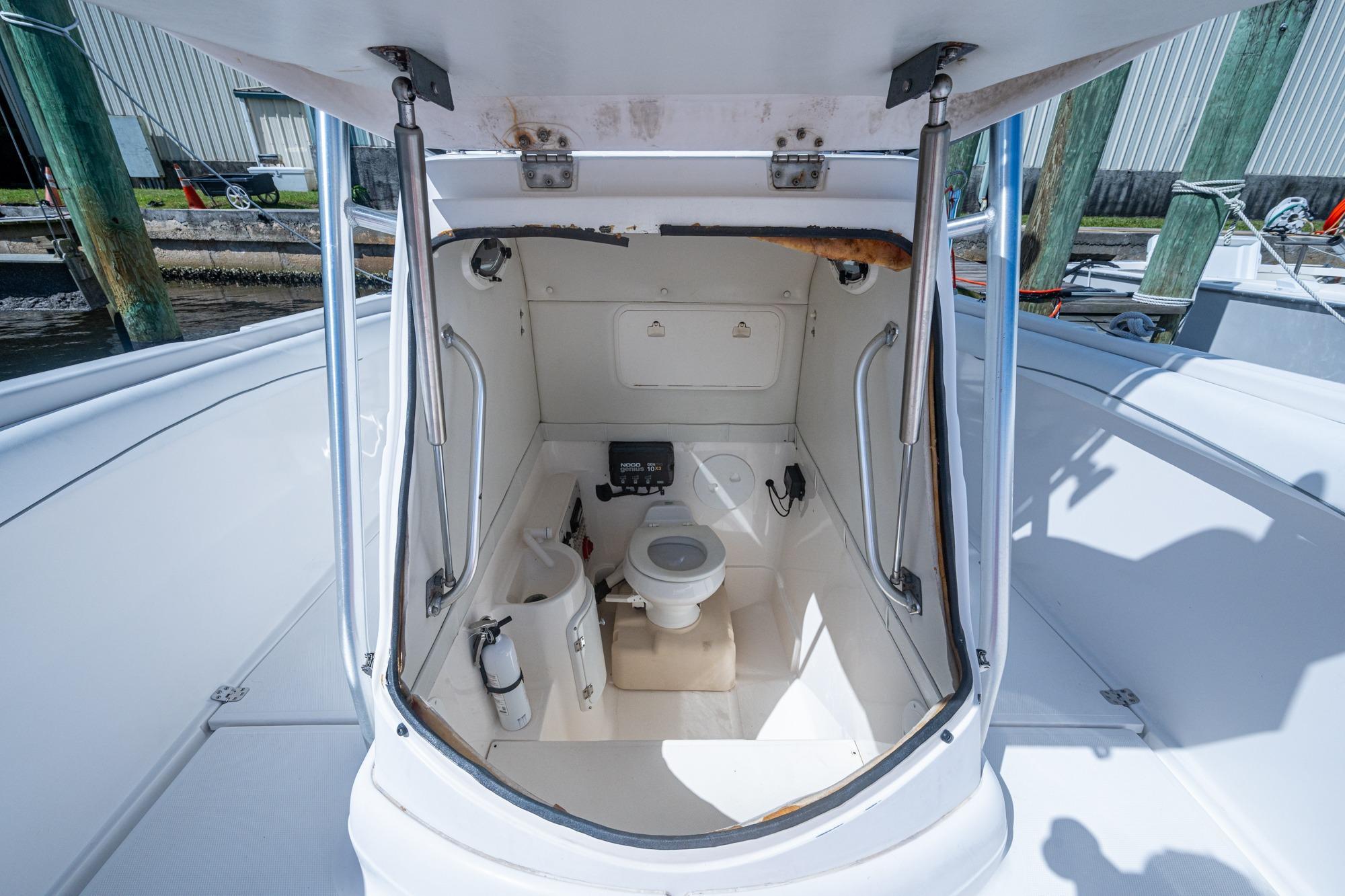 This classic stepped hull boat is completely redone with new Garmin electronics (8612XSV, Open Array Radar, Autopilot, VHF), outriggers, upholstery, batteries, pumps, clear Hull Maxx bottom job, and T-Top. The 32 Scarab Tournament is your express ticket. The racing hull design provides legendary performance, and the Deep-V's ride is matched by equally impressive features. A 37-gallon lighted baitwell holds an arsenal of fresh bait. A central bait prep station stands waiting. And four insulated fish boxes provide plenty of room for your catch. Of course, there is wide-open room to maneuver and plenty of storage upfront. A canvas T-Top provides shelter from the elements. And a self-contained head provides privacy when nature calls. In short, there's no stopping this serious tournament fishing boat. And, now there's nothing stopping you from owning one.