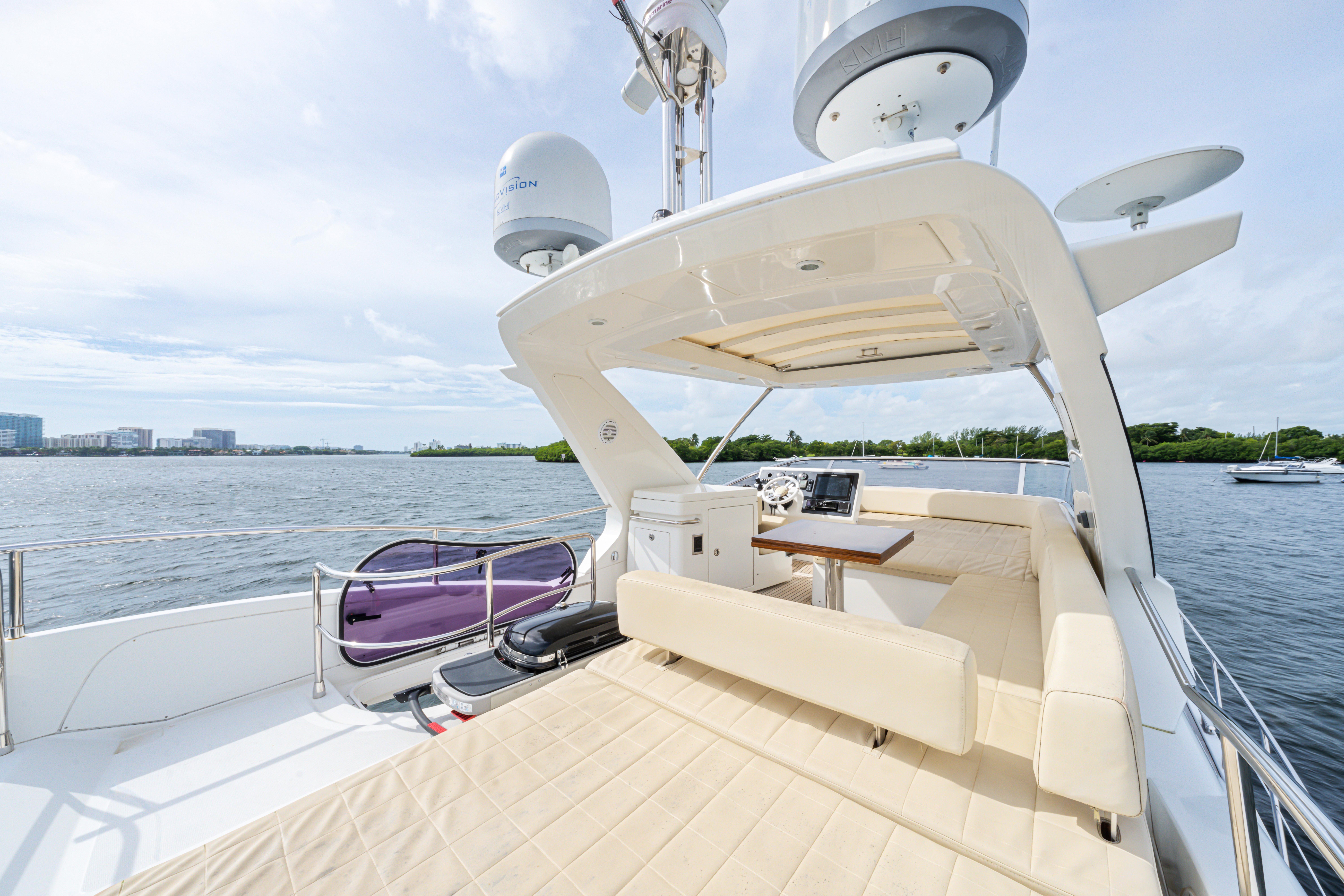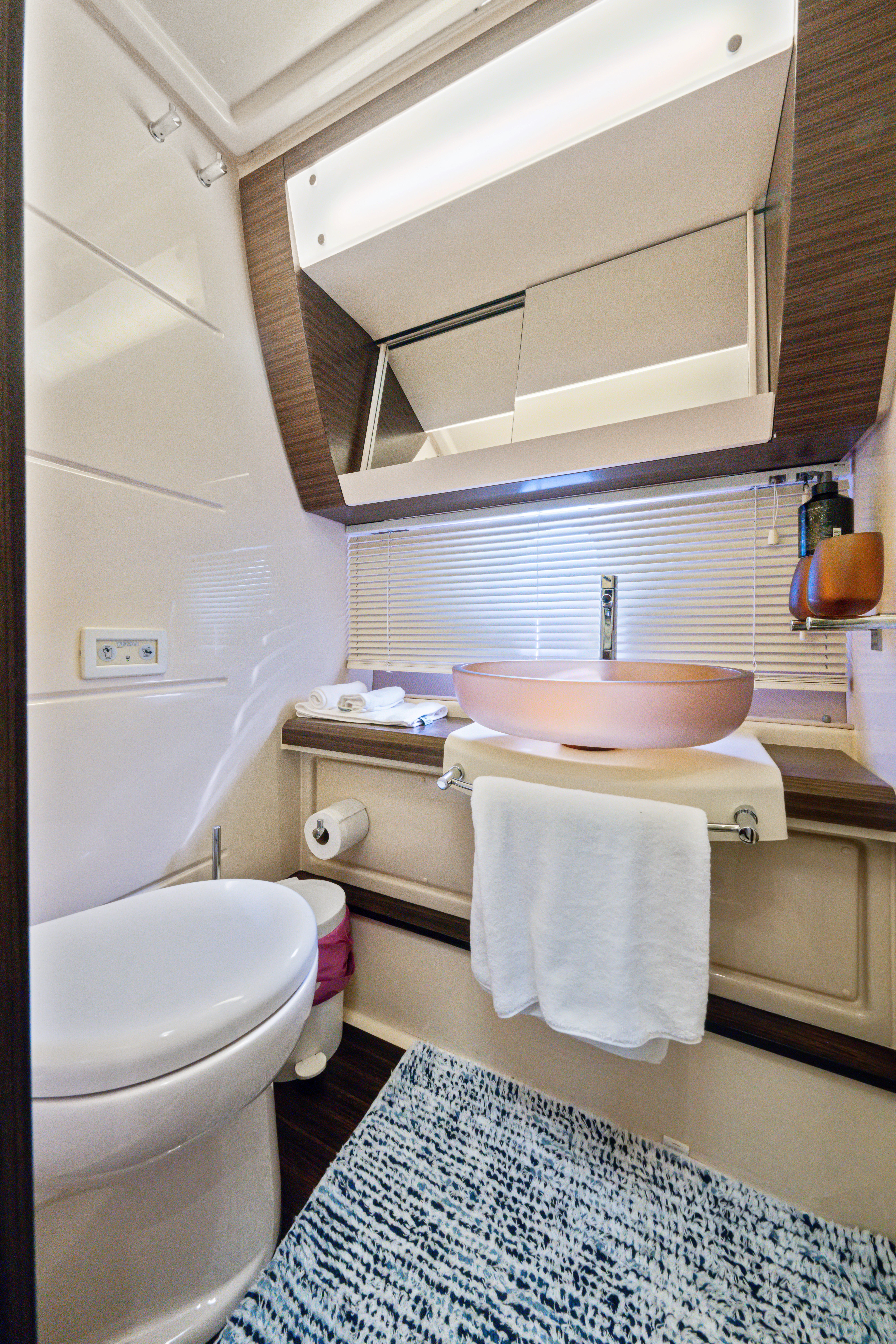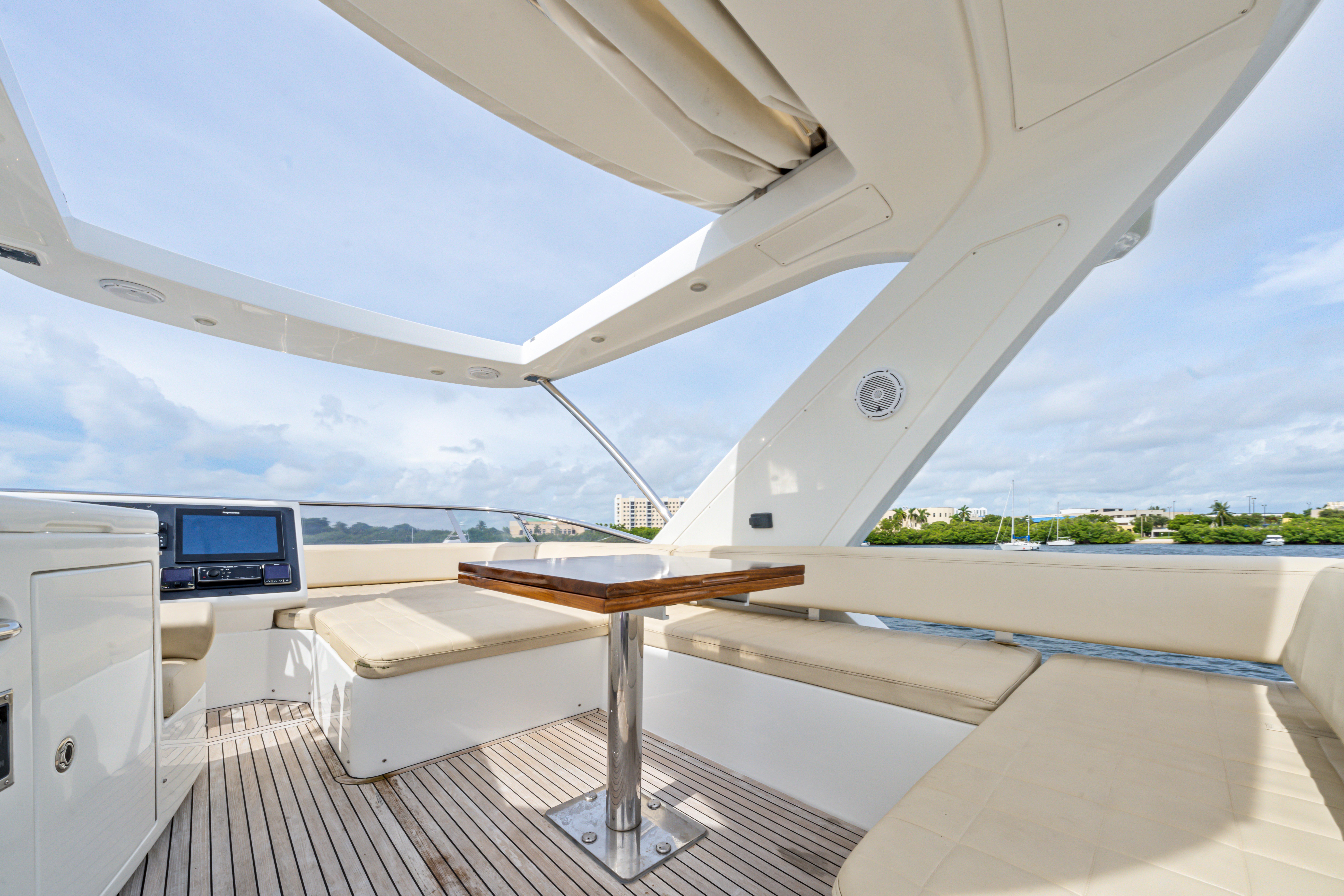 Exterior and Flybridge: Outside, the flybridge offers a retractable Bimini, seating, grill, fridge, and teak dining table, perfect for intimate gatherings or relaxing. It also features a second helm with excellent visibility. The bow offers a large sun pad with adjustable backrests for lounging in comfort.