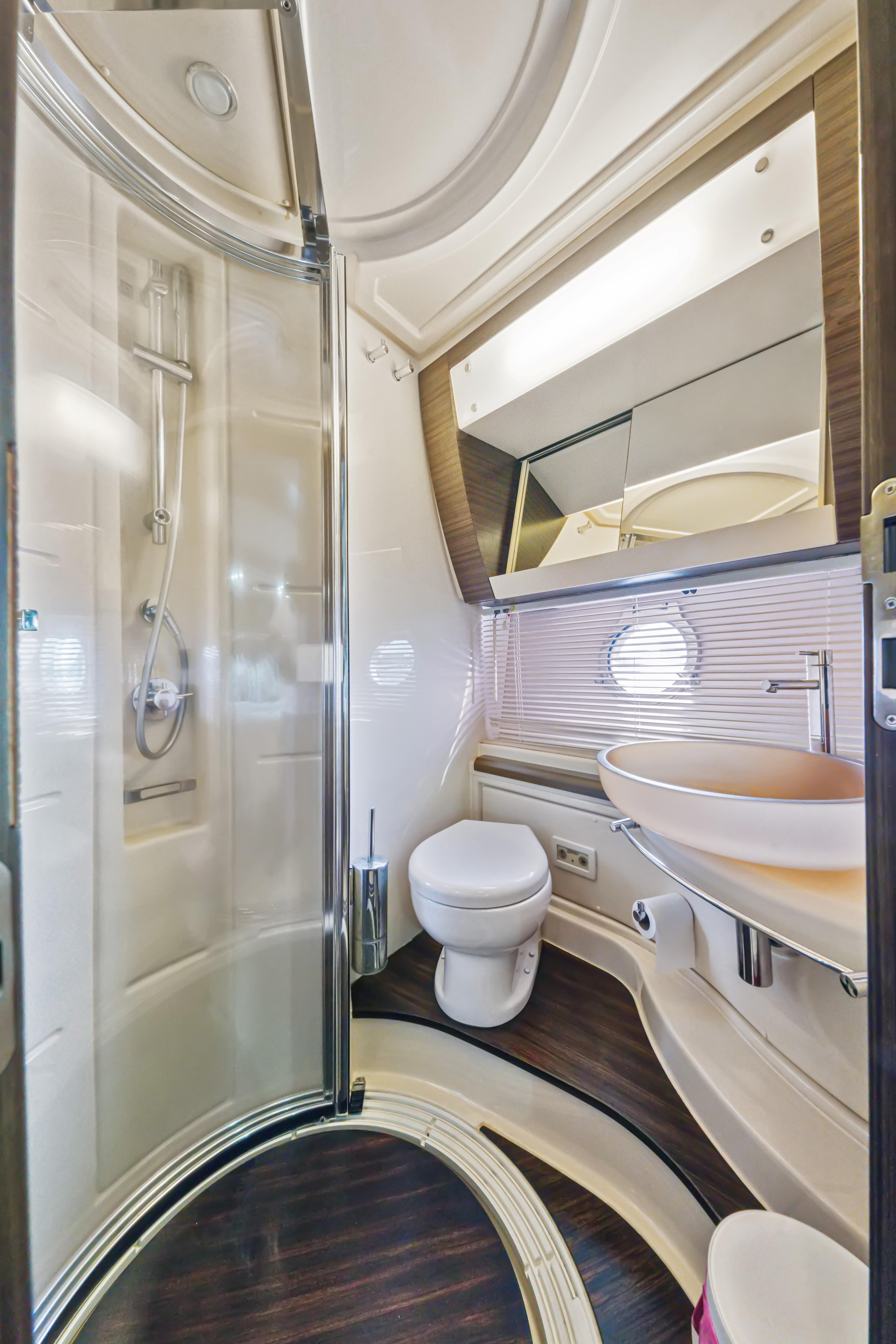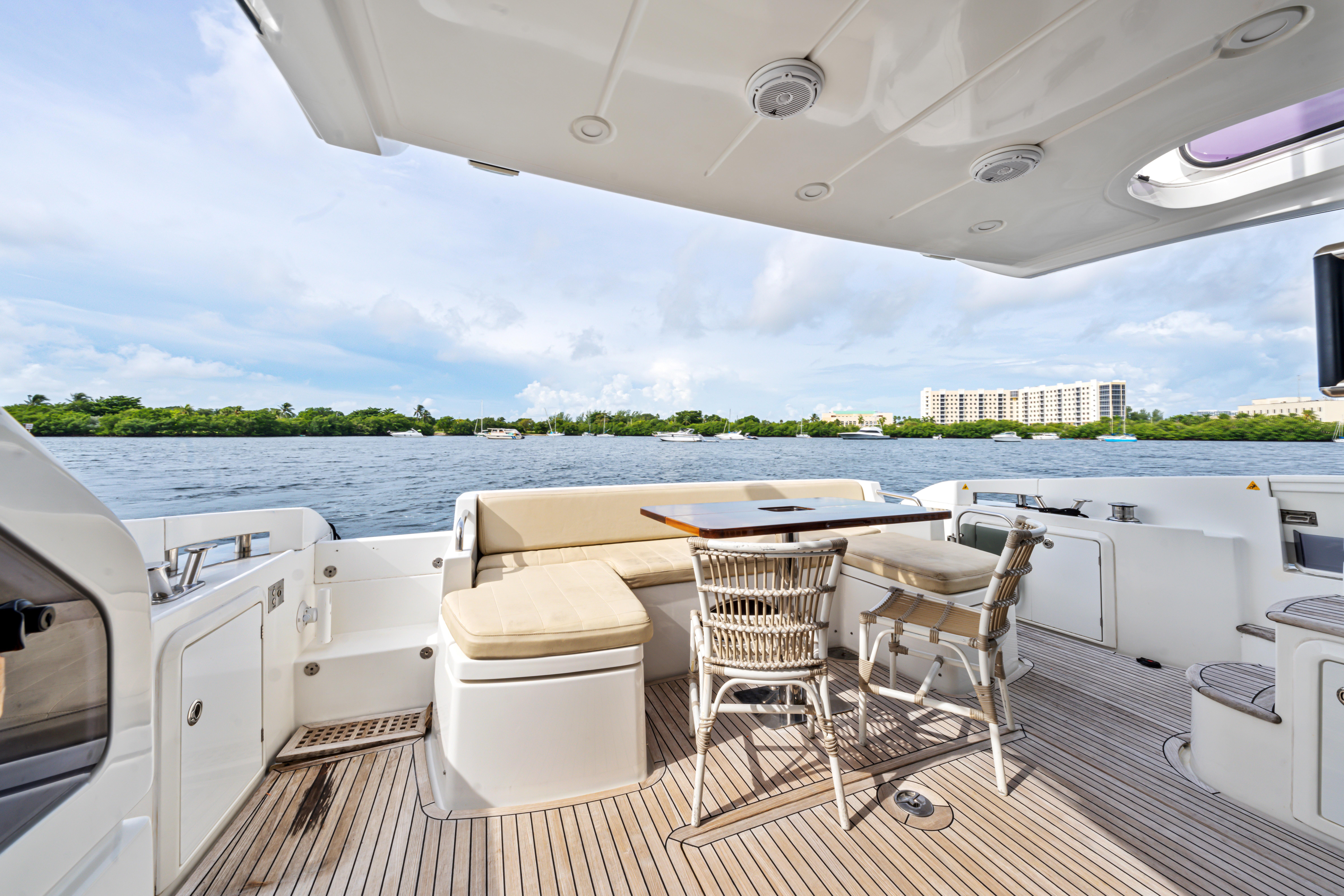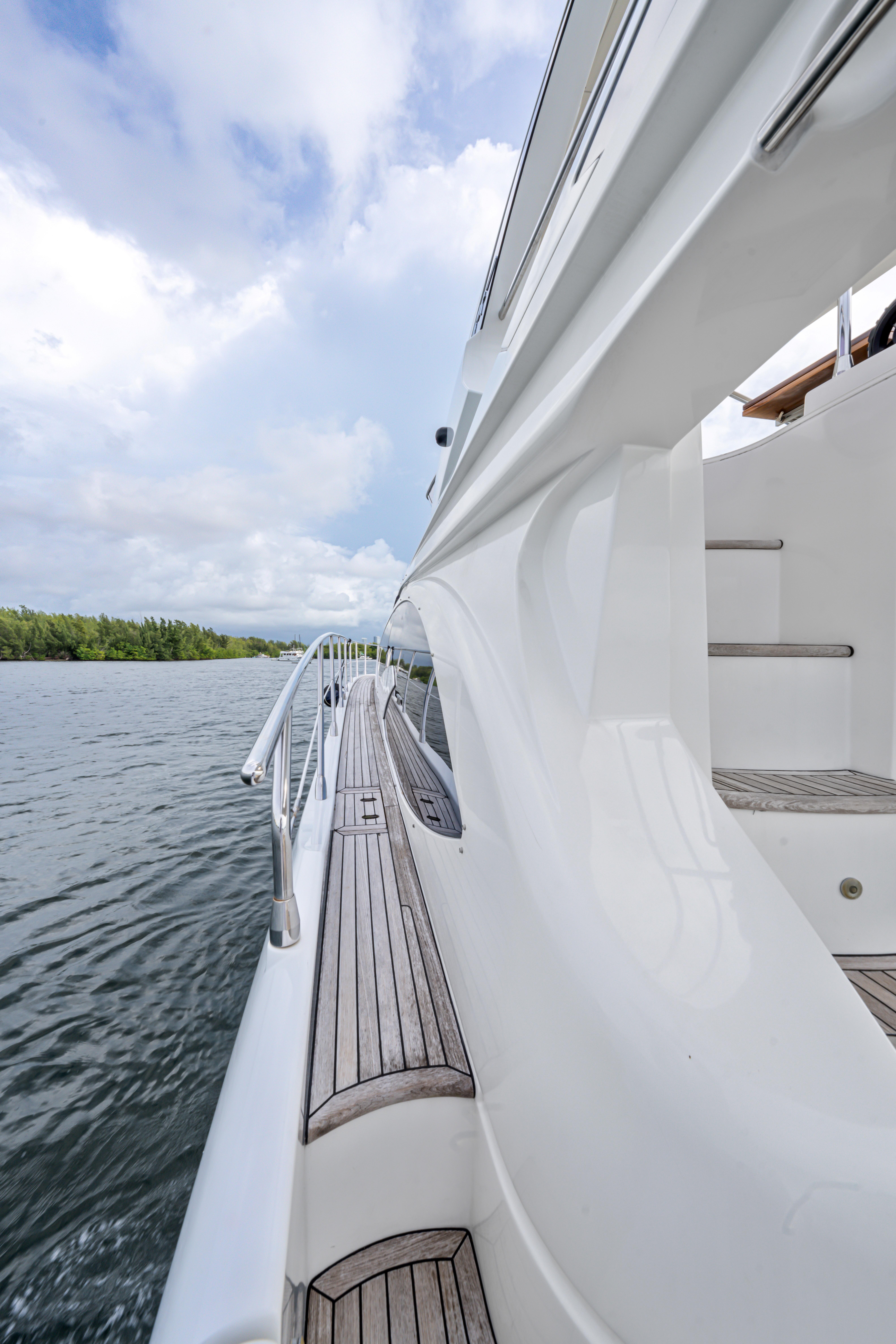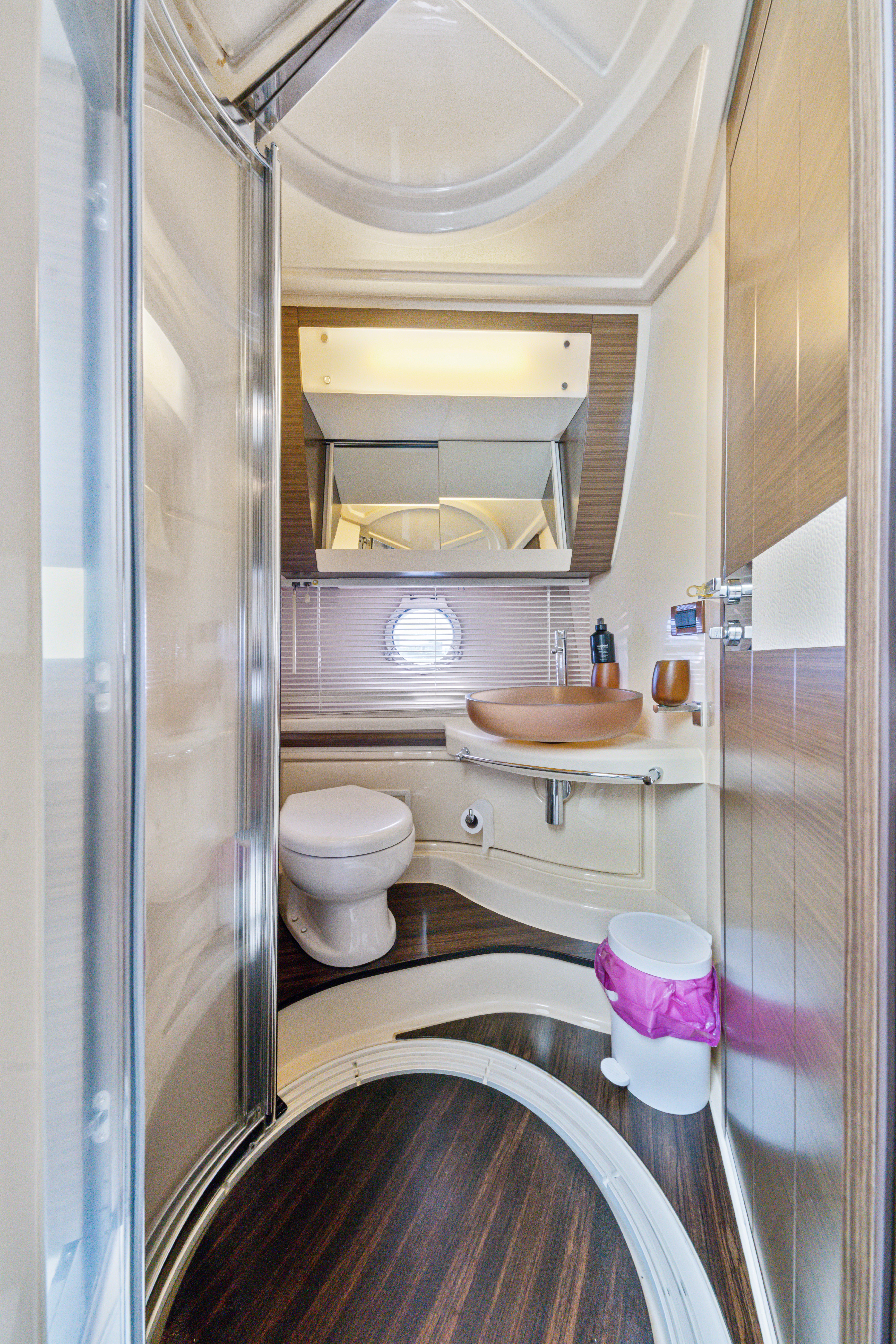 Exterior and Flybridge: Outside, the flybridge offers a retractable Bimini, seating, grill, fridge, and teak dining table, perfect for intimate gatherings or relaxing. It also features a second helm with excellent visibility. The bow offers a large sun pad with adjustable backrests for lounging in comfort.