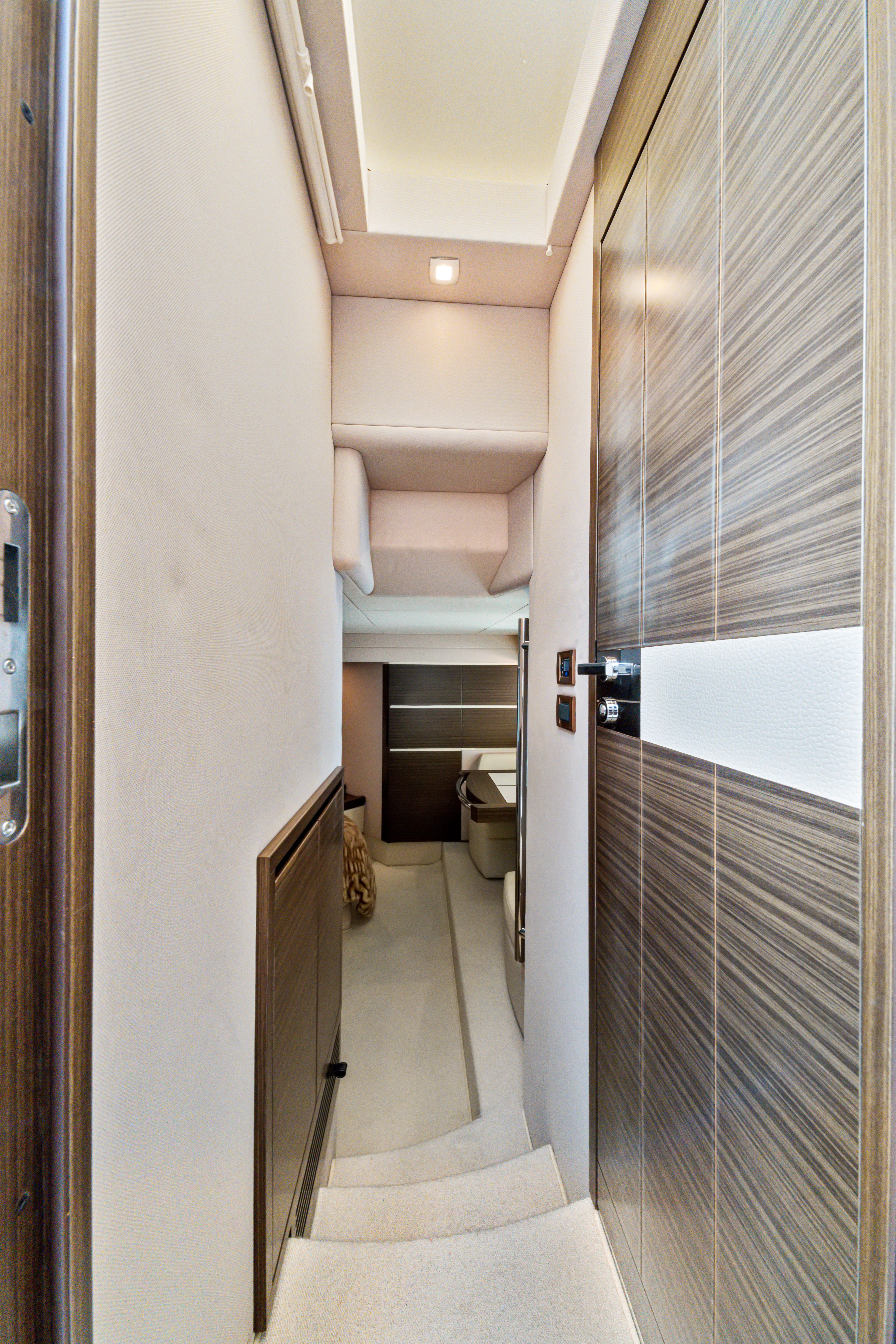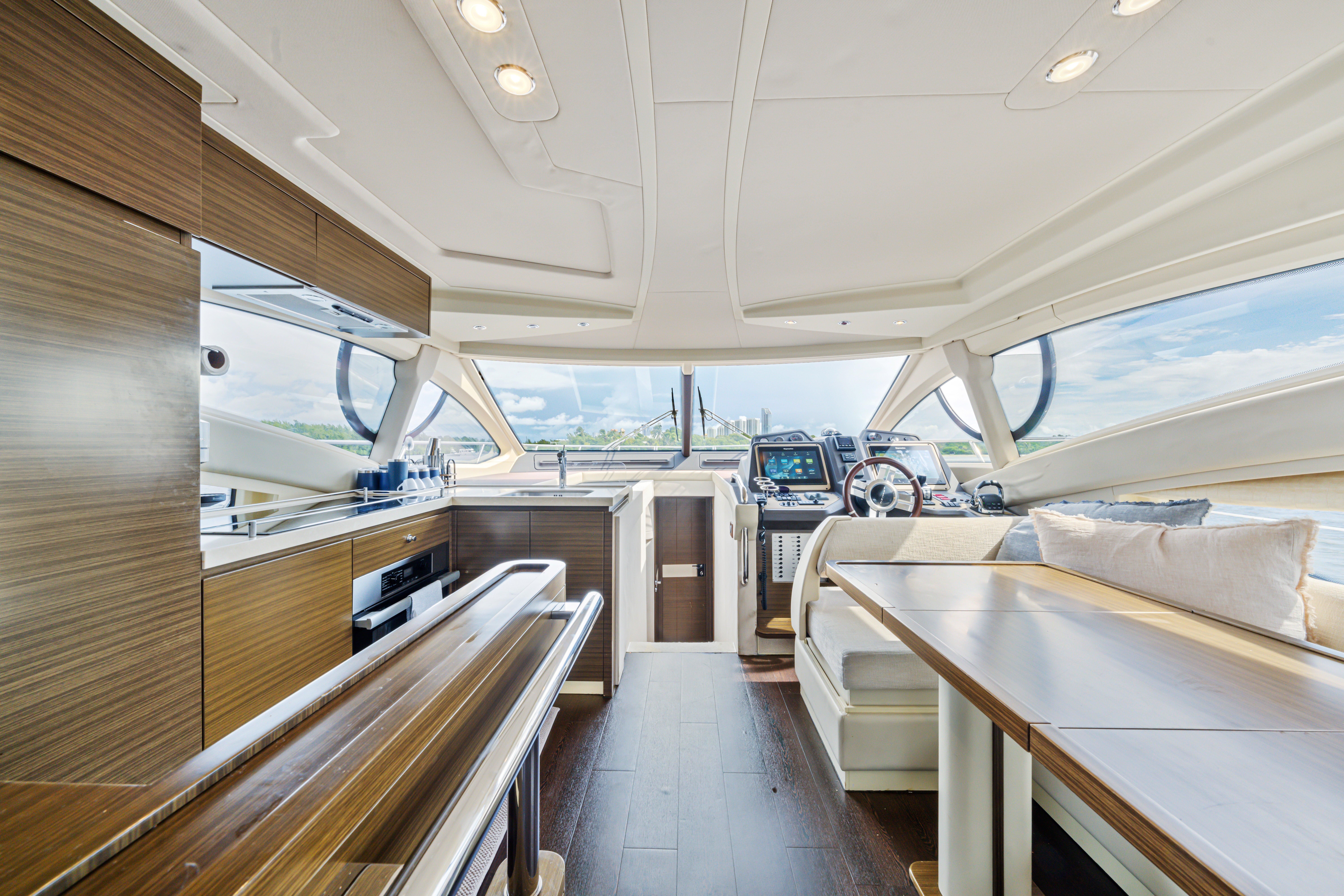 Main Interior Deck: Entering from the spacious aft deck through large glass sliding doors, you're welcomed by an open, sleek, and elegant main deck. With ample lounge space, it's perfect for entertaining. A press of a button reveals a large flat-screen TV paired with a Bose sound system. Two steps up leads to a well-equipped galley to port, featuring high-end Miele appliances, rich wood cabinetry, and a concealed fridge/freezer. Across to starboard is the U-shaped dining area, upholstered in cream fabric with alligator-embossed leather details. The adjacent helm allows for easy owner operation while staying part of the conversation.