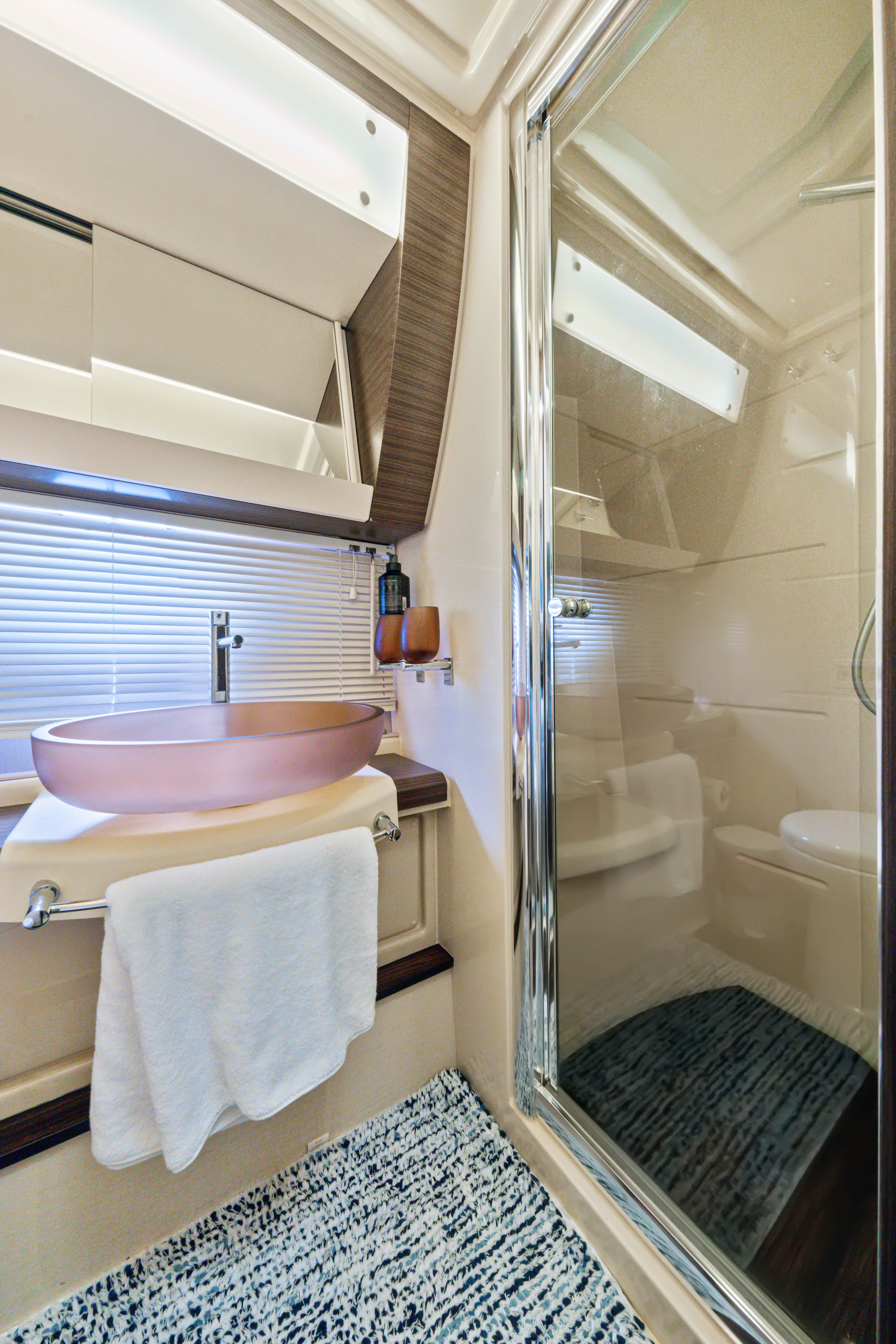 Lower Deck: On the lower level, the Queen VIP stateroom is forward with large windows, hanging lockers, and an en-suite head that doubles as a day head. A guest twin bunk room to starboard also has storage and shares the day head. Aft, the full-beam master stateroom boasts a private en-suite, large windows, and a cozy settee with hidden vanity. The washer/dryer combo is tucked behind the wood-paneled wall in the hall.
