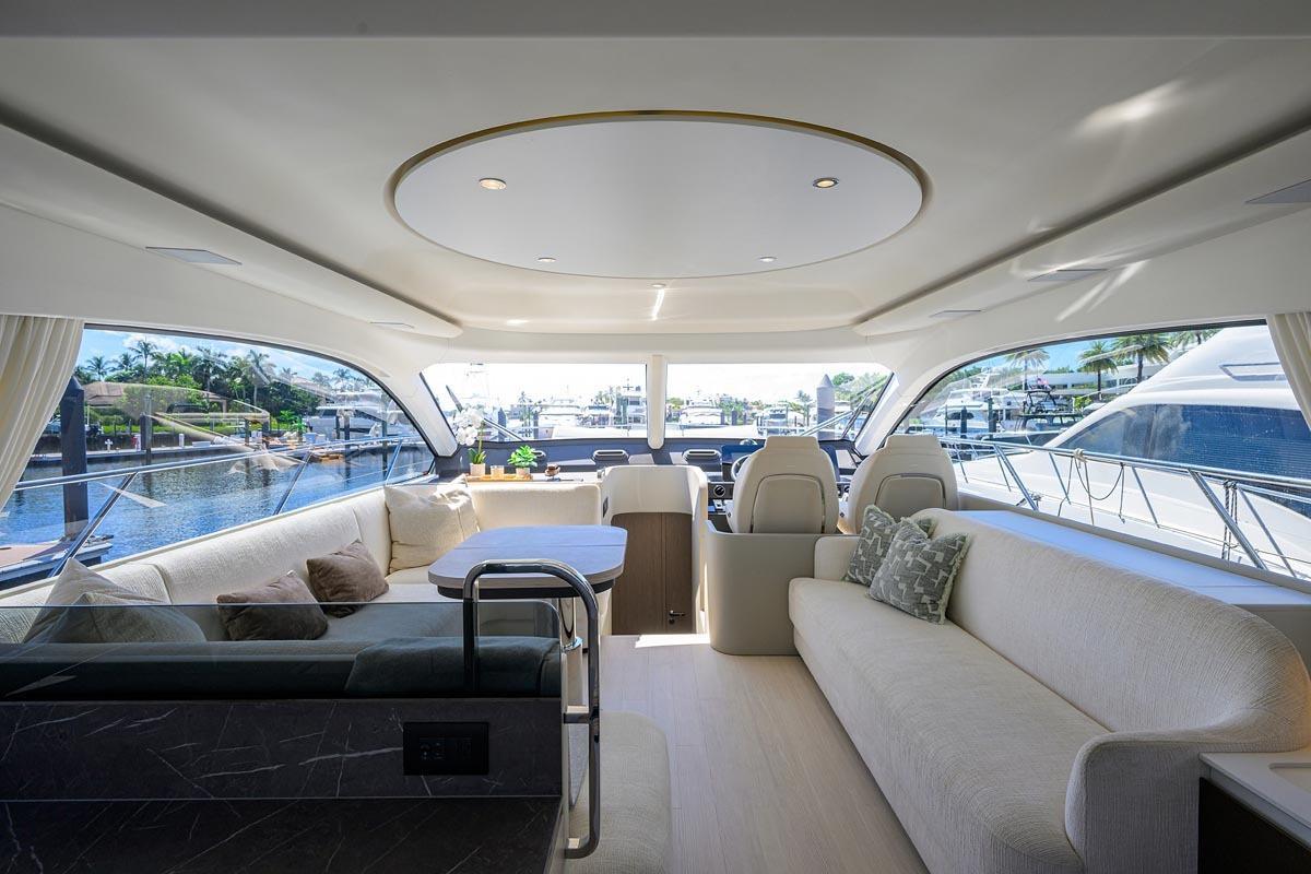 The spacious interior of the main deck flows beautifully from the starboard-side lower helm, through the seating areas in the salon, past the galley and through an opening aft bulkhead to the aft deck seating.