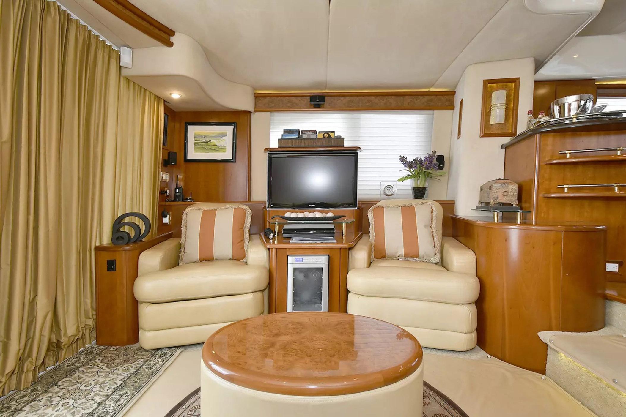 As you enter the salon from the cockpit through the SS-framed glass sliding door, you will be impressed by the spacious feel, with large windows all around, luxurious carpeting, and Cherry Wood throughout the vessel. On the port side, you will find 2 leather recliners separated by a pop-up TV and wine chiller. On the starboard side, a large, leather-covered settee with storage underneath affords pure comfort for your guests. As you move forward two steps to the well-equipped galley on the left, you will be impressed by the large Cherry Wood dinette table with leather-covered seating for six people on your right, all supported by hardwood flooring. Moving forward and down three steps, you will enter the foyer that separates the three staterooms. On the port side is the guest suite with a Pullman bed, which easily converts to a double. You will notice the separate washer and dryer located conveniently out of the way. On the starboard side is the guest head, which serves as both a day head and a private head for the VIP stateroom located fully forward, as well as the guest suite. The VIP suite is entered through two cherry wood doors, which open wide for easy entrance. The center-line pedestal queen bed features multiple storage drawers underneath, as well as reading lights and plenty of fresh air.