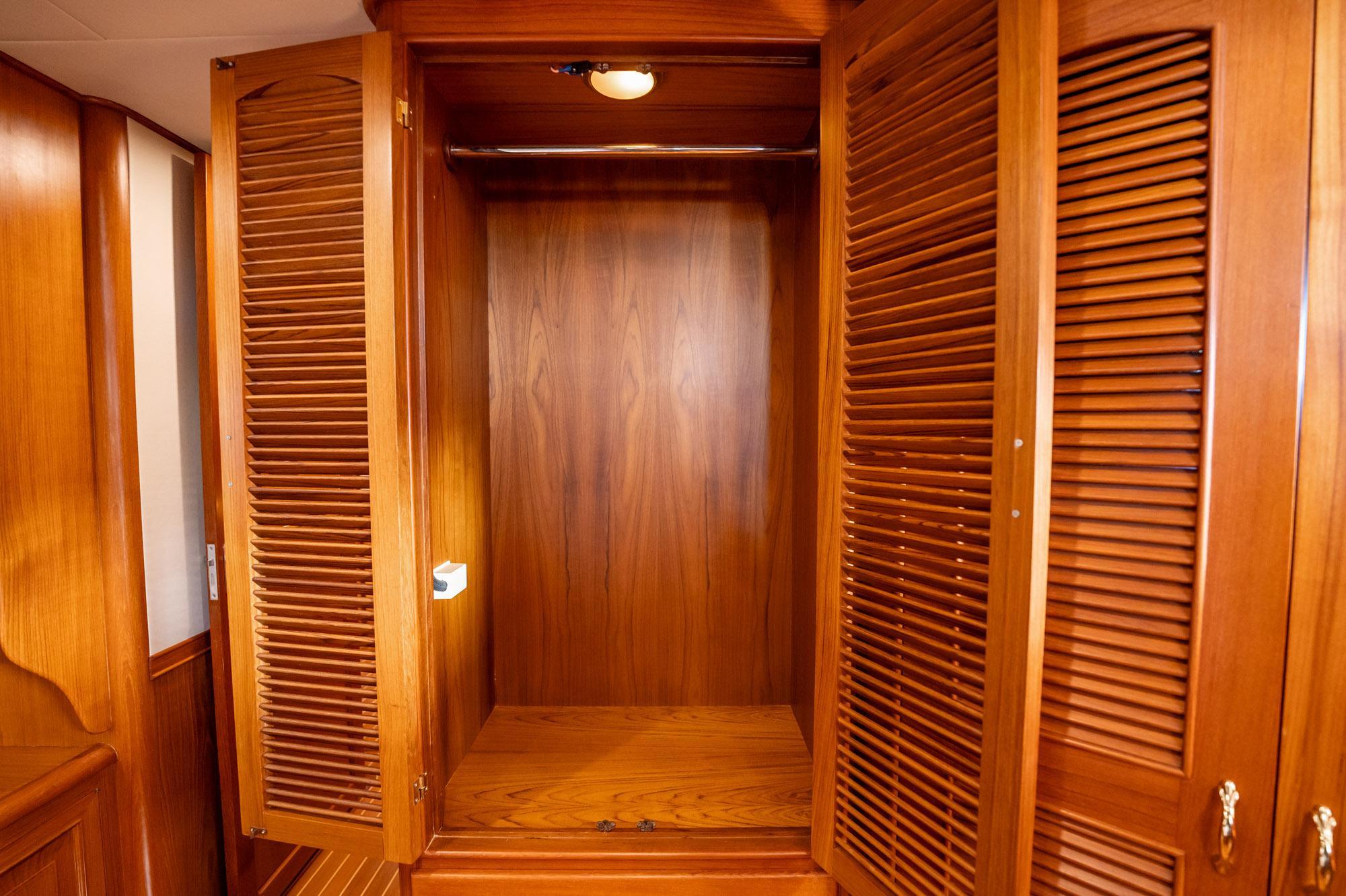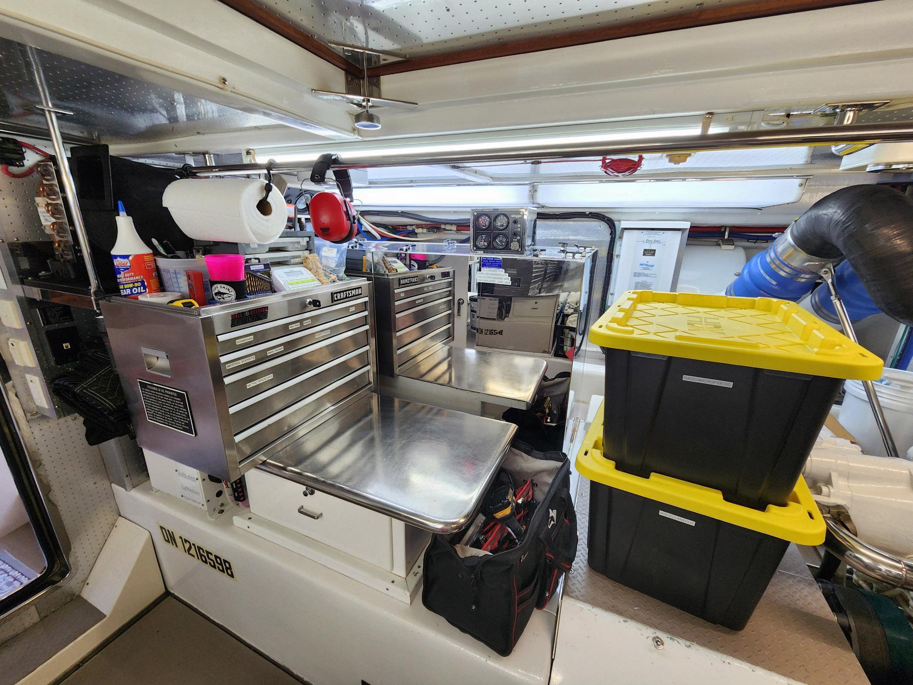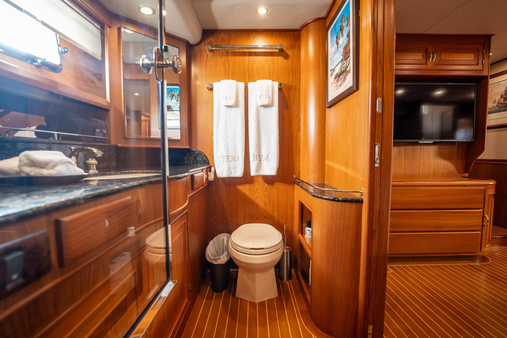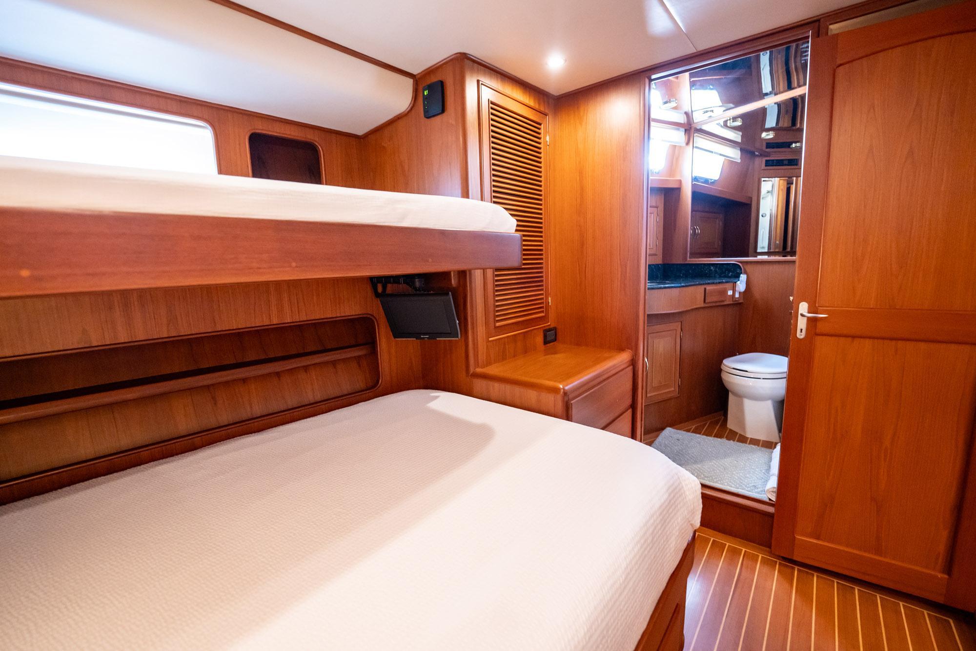 Ascending down to the California deck via stairs on the lower flybridge you are greeted by a large seating area with a beautiful teak table for up to 6 guests. As you walk forward on her port side there is access to the engine room and crew quarters. Crew quarters features a queen and twin bunk style berths, refrigerator, hanging locker and drawers. Separate head with shower, sink, vanity, and toilet. Forward of crew is the climate-controlled engine room with nearly seven feet of headroom!