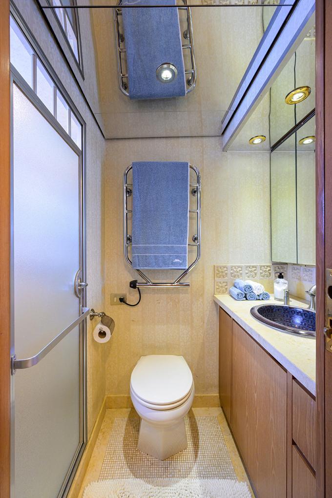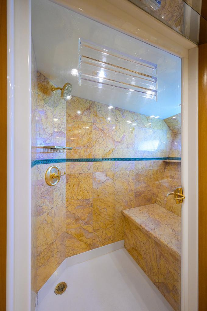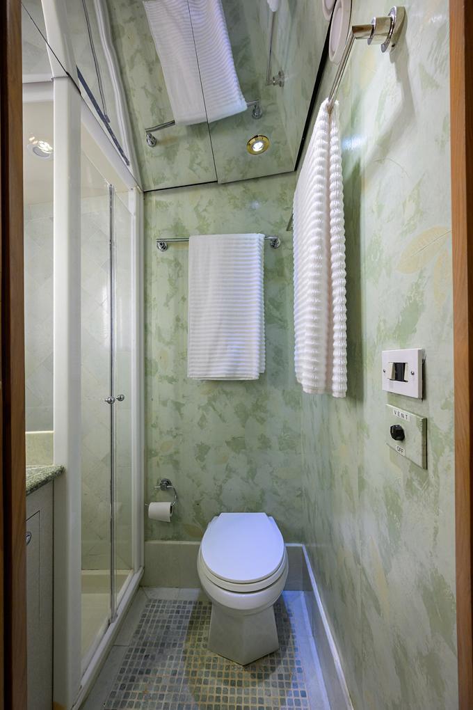 Starboard Side Crew Cabin HeadOne step down the Head has a mosaic tile sole. The vanity has one cabinet below and a granite countertop above with an under mount glazed sink above. Above is a medicine cabinet with two tube lights either side. The marble tiled shower has a split Lucite door, a handheld or wall mountable shower fixture and a light.