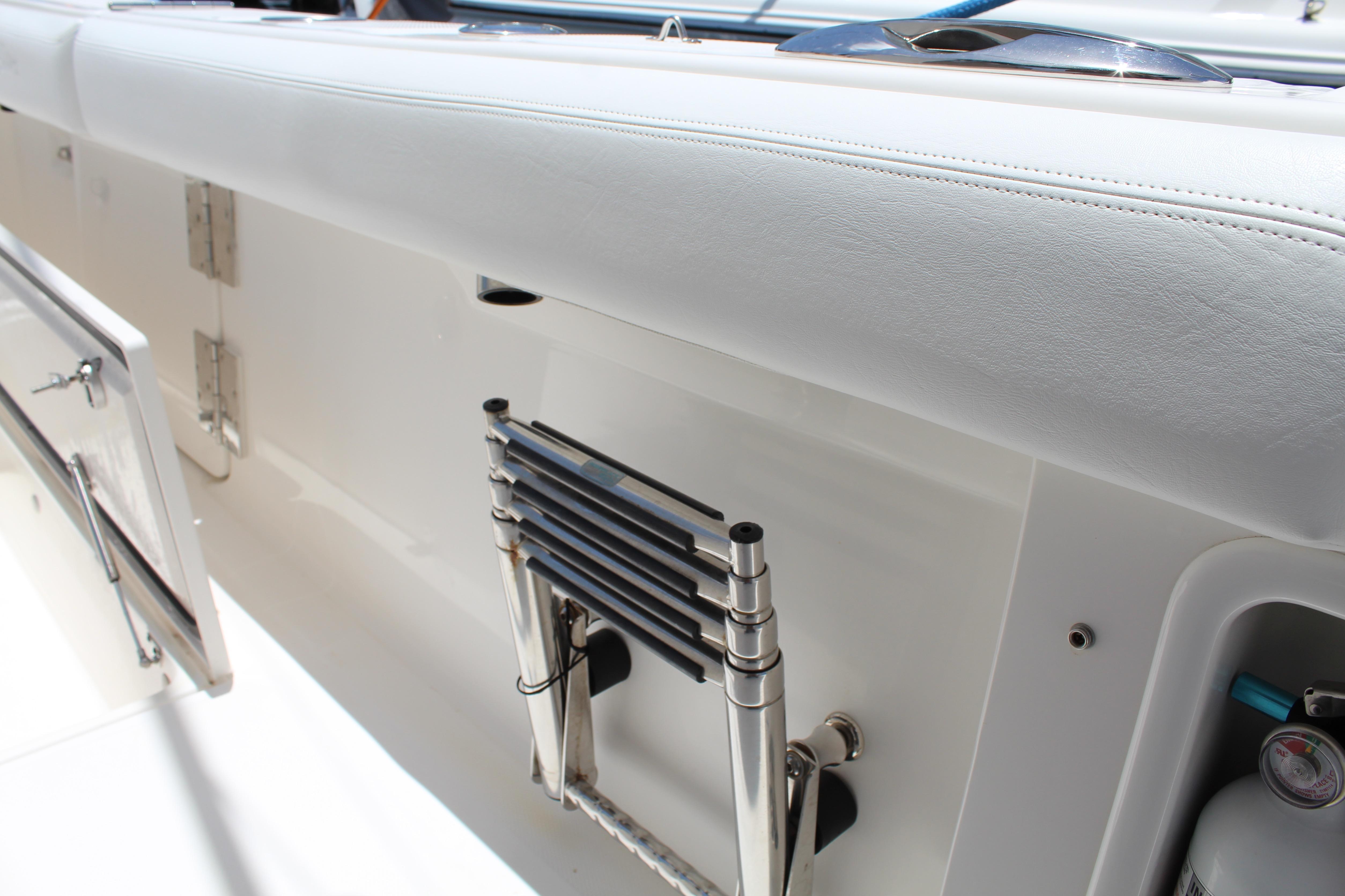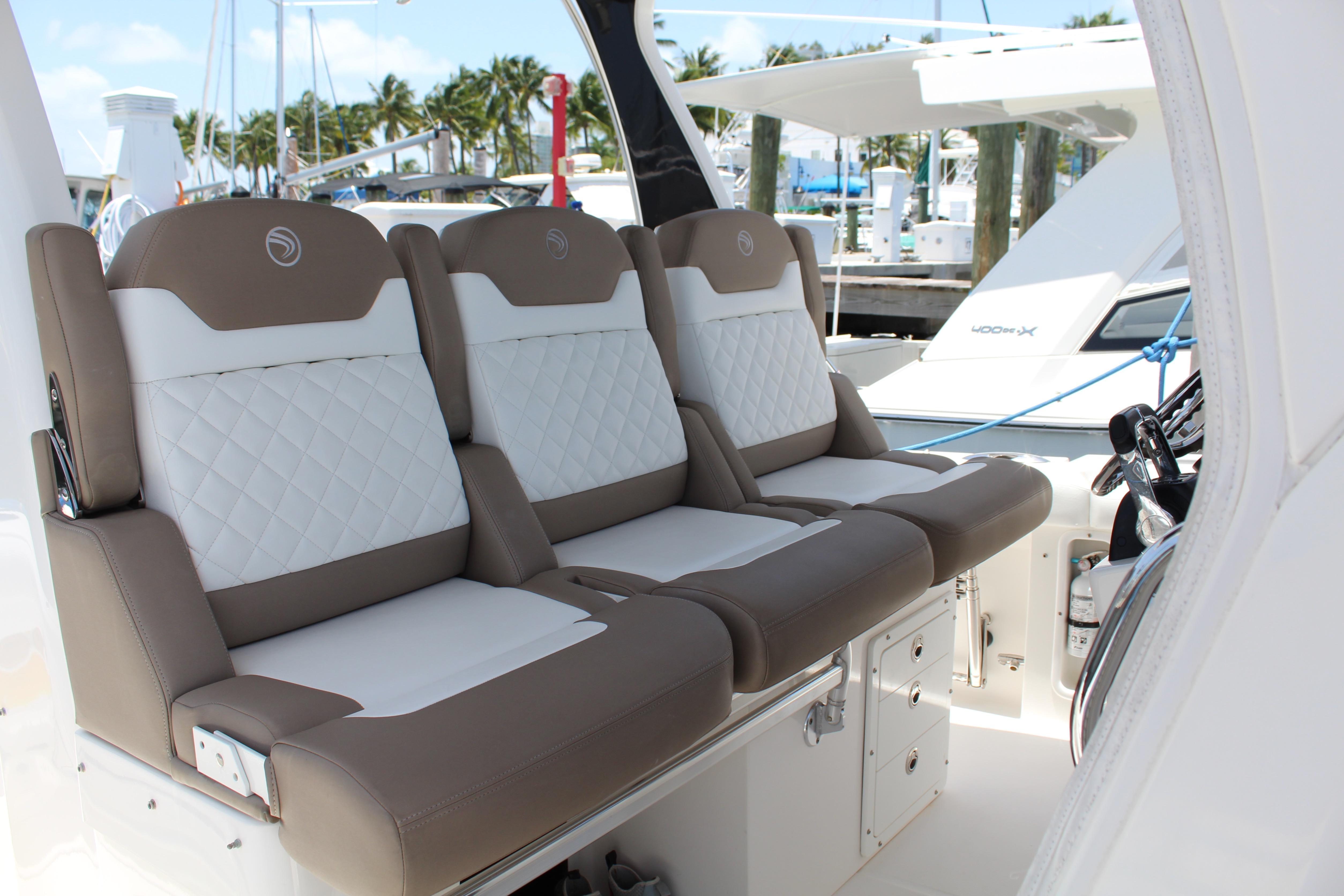 - Super Leaning Post with Premium Helm Seating (3) with an Electric Adjustable Captains Chair, 54QT Removable Premium Cooler Under Forward Console Seat, Mezzanine Seating (3) w/ 225QT Storage/Cooler and a Stainless Steel Footrest