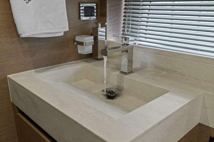 Completely Separate and private from the forward Guest Accommodations is the Full-Beam Master Stateroom. Exiting the Port Guest stateroom heading aft up the companionway stairs through the Salon towards the Galley is the private access stairwell to starboard leading down into the Master. This stairwell is positioned directly across from the Galley. This allows the Owner to have the utmost privacy when travelling aboard with family or guests making the Prestige 590 a highly sought after model in the Prestige Yachts lineup. Moving down the stairwell into the Master suite you will immediately notice how voluminous the room is. Full-beam across, it showcases a Large Island style berth w/ custom built-in end tables, and independent reading lamps. The Booth Style seating console to port is an excellent workspace, but doubles into a flip up vanity top with mirror and built-in storage. Large hull-side windows to port and starboard fill the space with natural light. The windows also have custom blackout shades for increased privacy. Plush Elegance carpeting throughout. Forward in the space is the dual entry into the head and walk-in closet space. Walking into the Master Head you can access the walk-in closet through the centerline walk in shower. The shower has doors on each side allowing you to exit into the head area or out the other side of the shower into the walk-in closet. The walk-in closet has a well thought out His/Her sides with custom built-in hanging space and integrated drawer storage. You can also exit the walk-in closet directly into the master stateroom via the Walk-in closet entry door which is forward and to port in the suite.