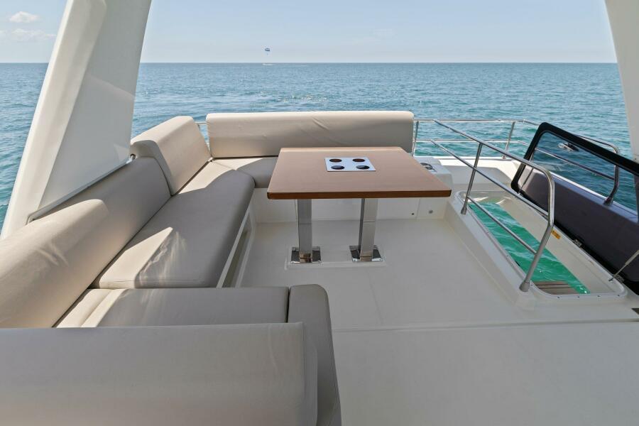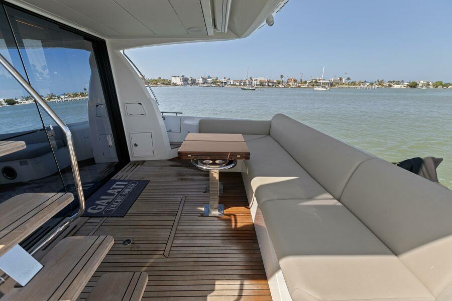 Stepping aboard onto the Swim platform of this 2022 Prestige 590 Fly you immediately feel the transition from land to the open ocean when your feet touch the teak decking. You will immediately notice the vastness of the swim platform area and its conveniently located railing system for easy movement throughout the space.