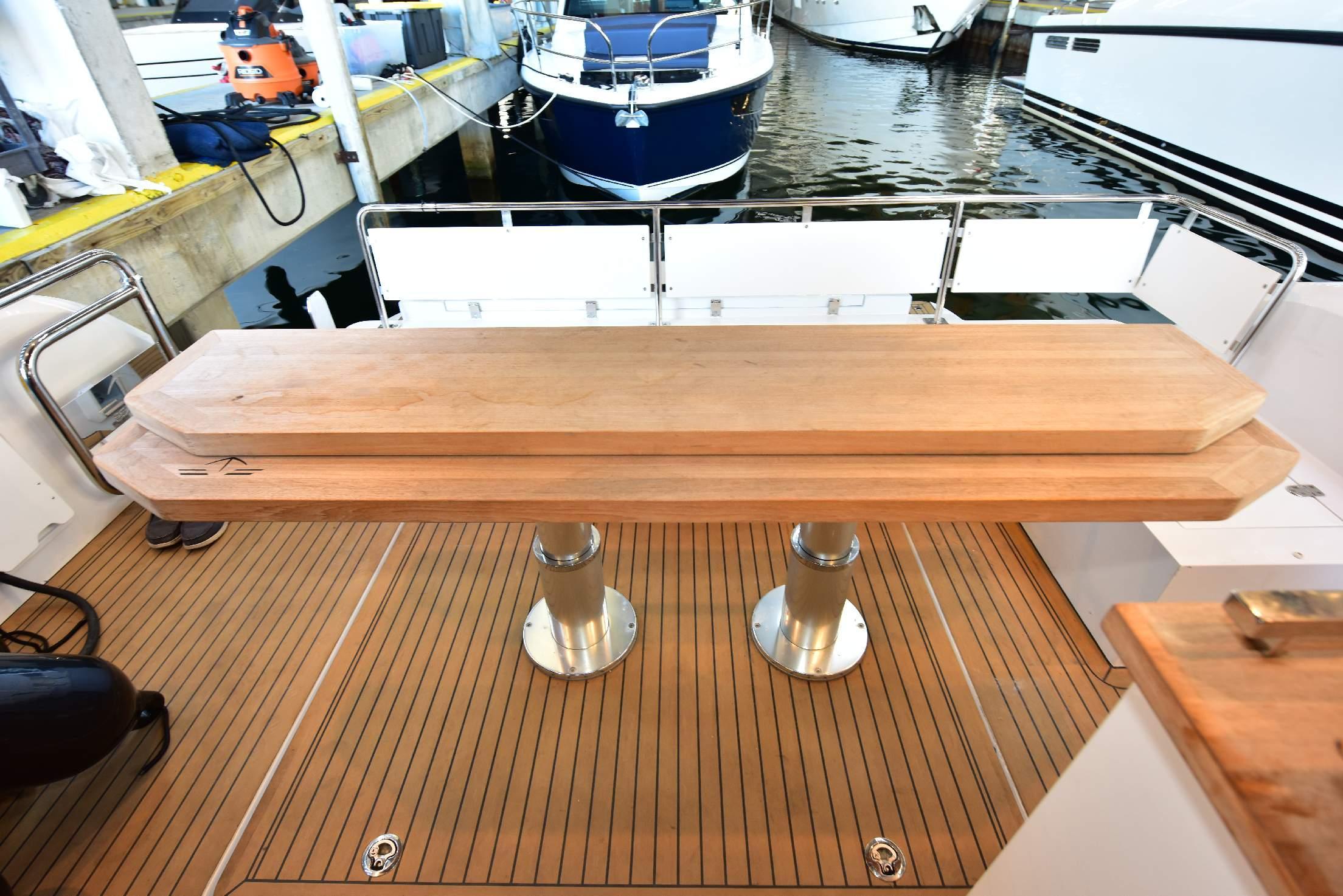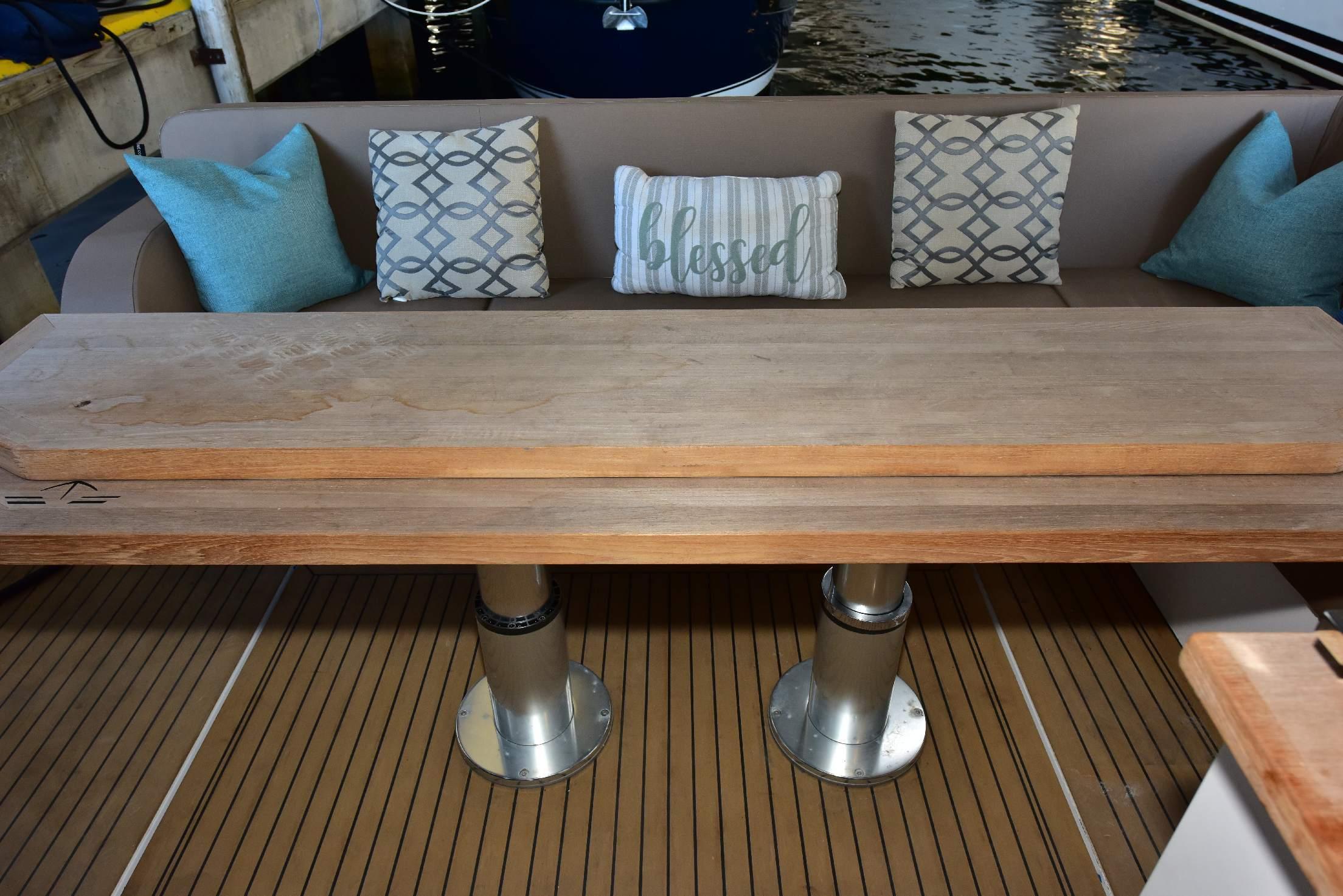 Table in cockpit with high/low leg, cover, sun cushion and electric engine hatch