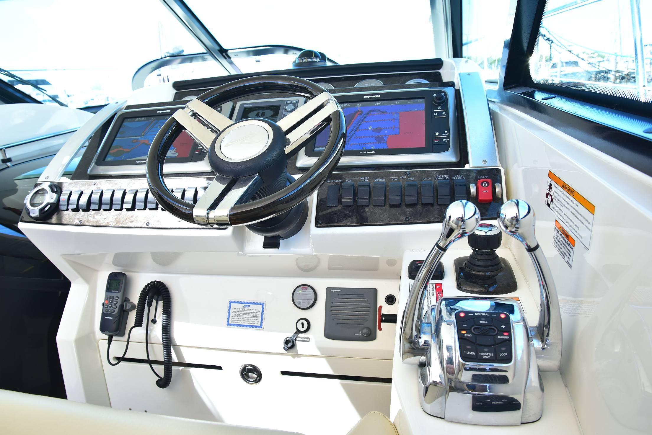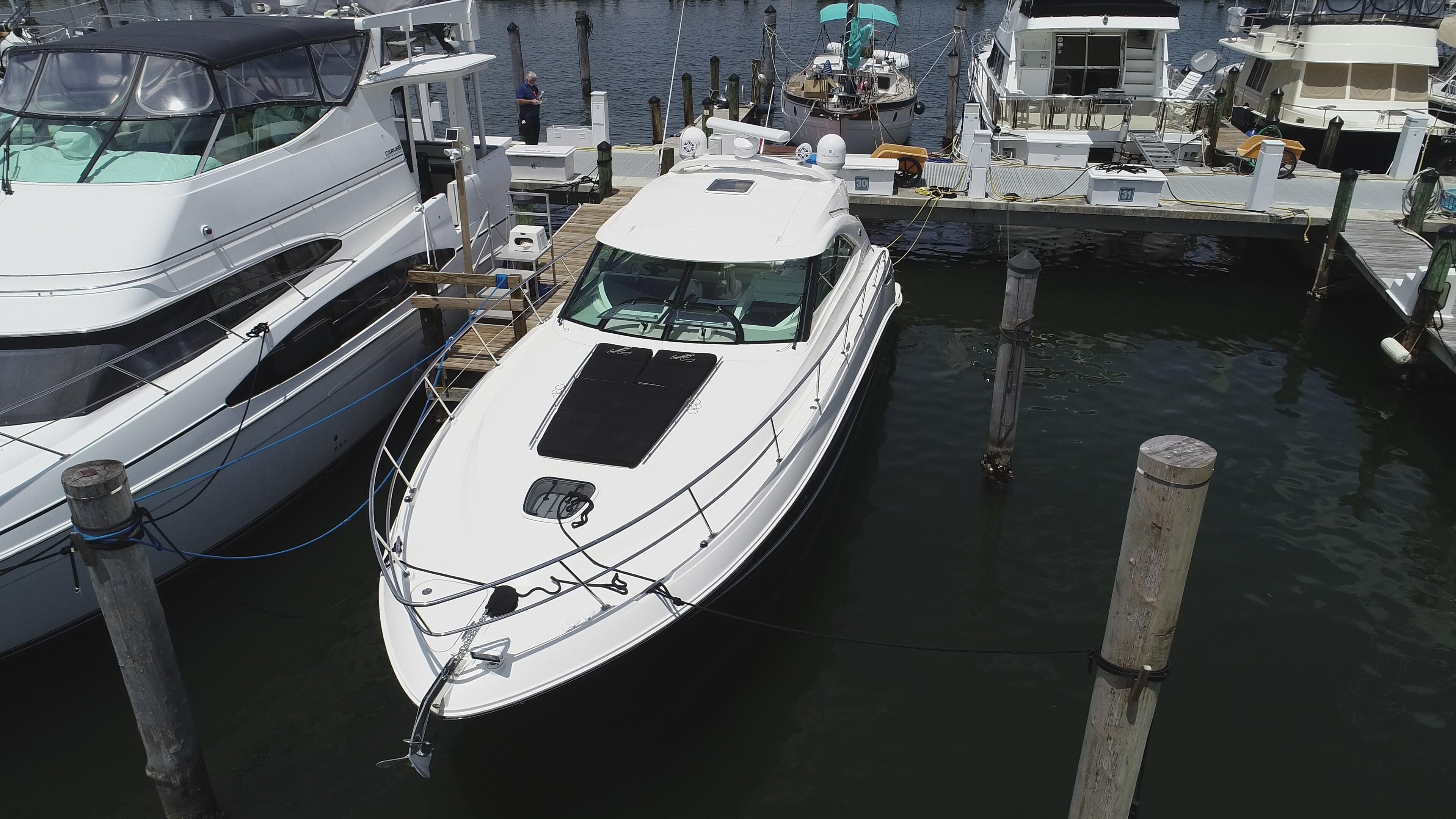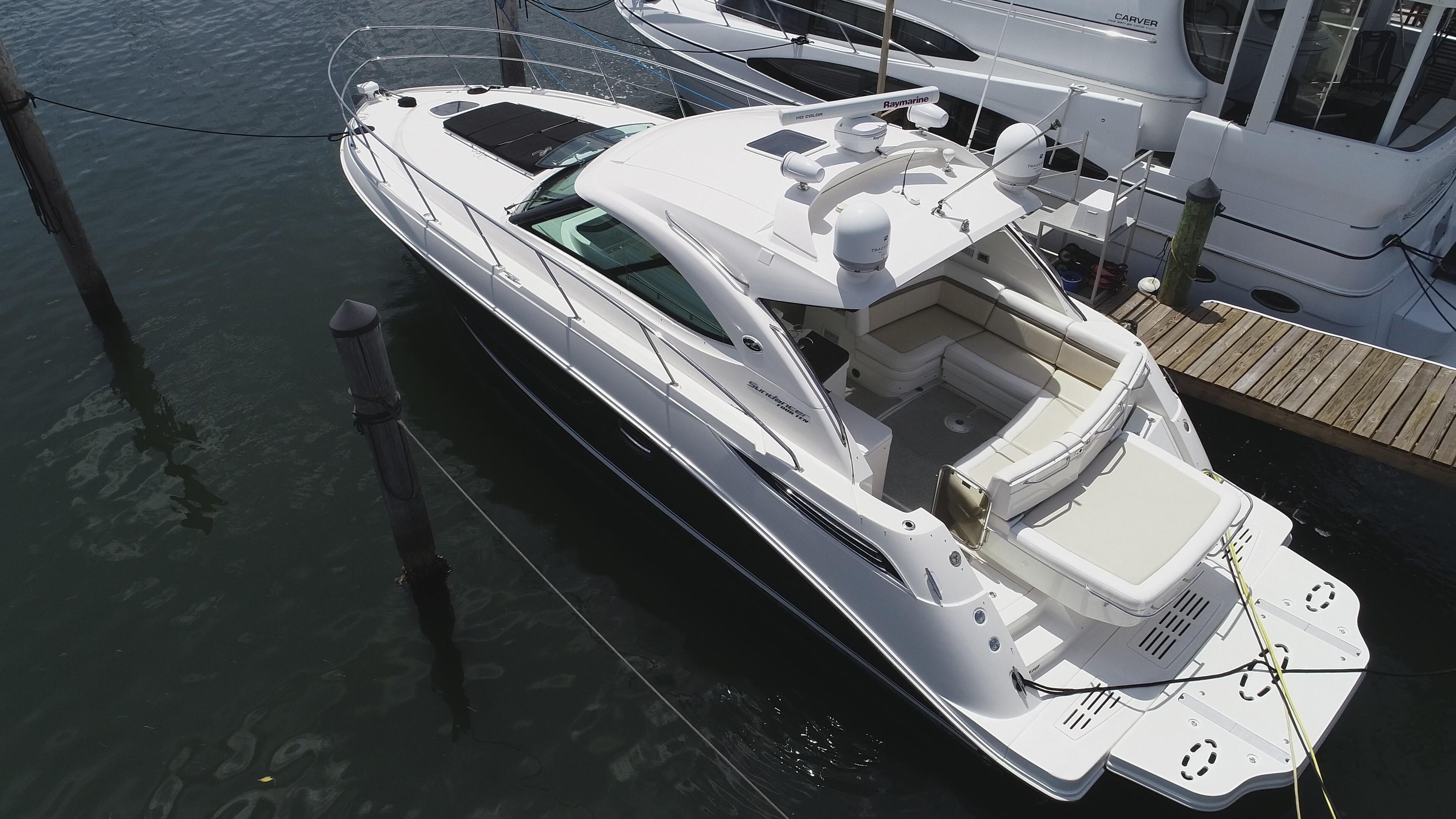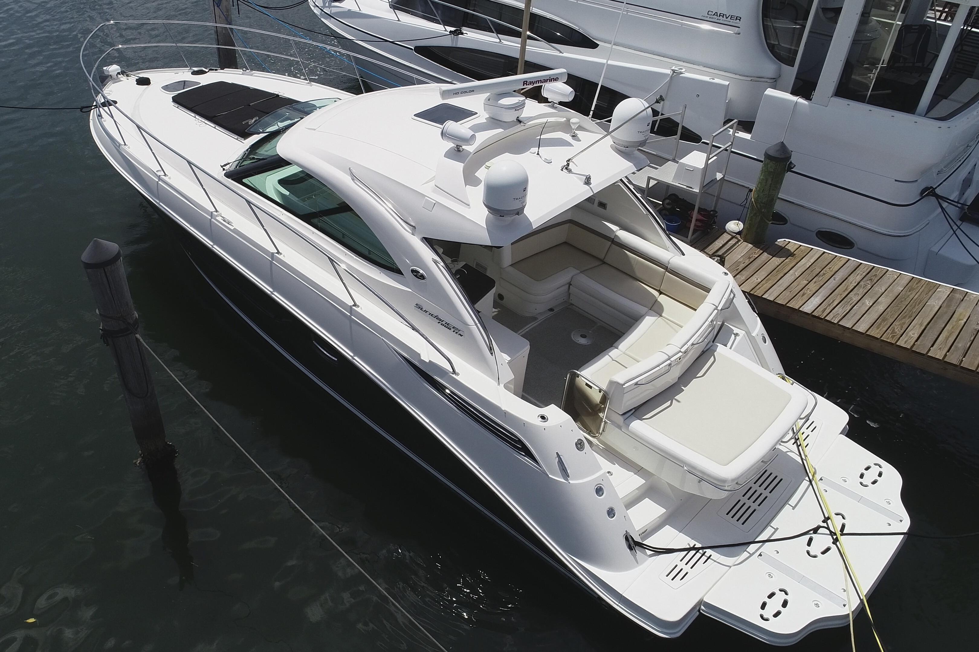 This 2013 Sea Ray 410 Sundancer has many modern options. Owner has installed Marine Night Vision security camera system (see images for a sample picture). And a wireless security system that gives you real time alerts with live and recorded videos. Also, a Hull Shield HD4 Ultrasonic Antifouling System which provides antifouling protection for hulls, drives, and other parts of a vessel that are prone to marine fouling. Engines and Pod Service accomplished Sept 2025 Bottom Job was just accomplished in Sept 2025, New Trim Tabs were installed, and Zeus Pods were coated with Prop Speed Protective coating. Both Engines were professionally rebuilt and with new Zeus Pods, all available options including a Hydraulic Swim platform. Cummins Zeus joystick power. Cockpit A/C, four TVs, hard top, cockpit air and heat. Autopilot, touchscreen Raymarine, Underwater Lights, smartcraft, two stateroom, two heads and can sleep six in a forward stateroom and convertible sofas in the salon and mid-berth and so much more. The 410 Sundancer is the very essence of a Sea Ray Sport Yacht. Enclosed hardtop version can sleep six in a forward stateroom and convertible sofas in the salon and mid-berth. Two heads add convenience. Everything you have ever wished for and more! This beautiful SEA RAY SUNDANCER has it all.