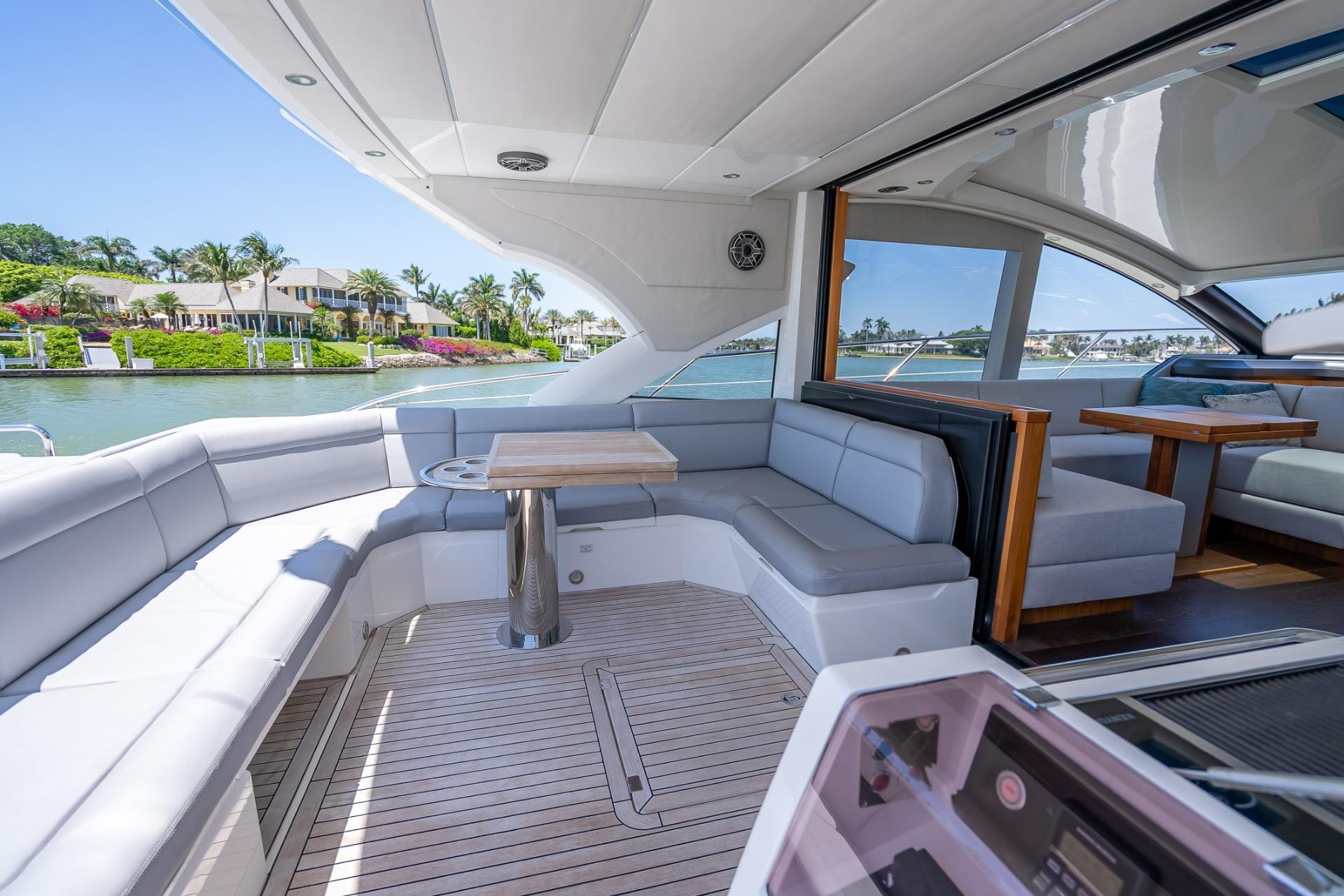 - Large electric sunroof & sliding glass cockpit door with draw down mechanism at seating to fully open the space between the main salon and cockpit area, great for entertainment & cruising
