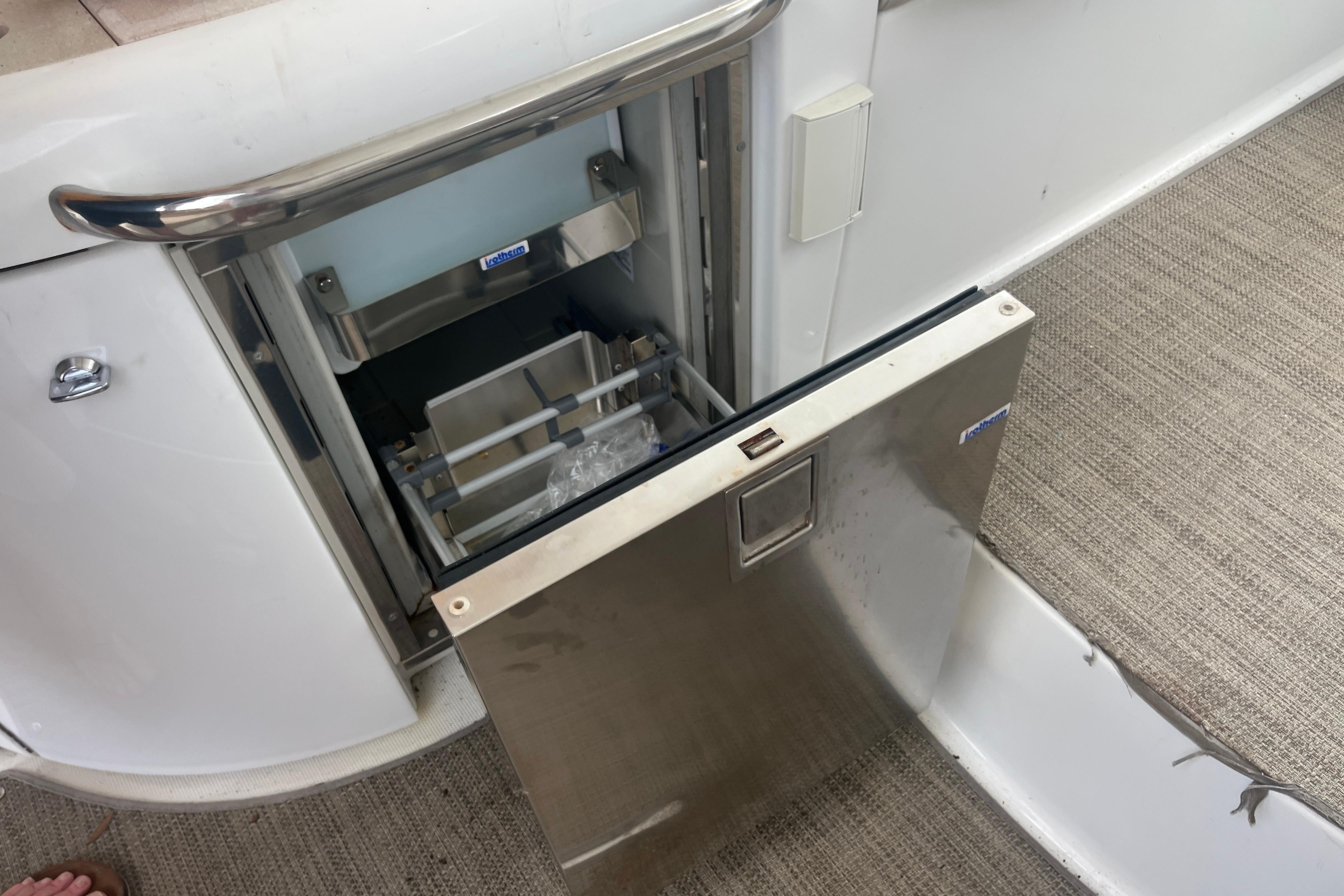 - Molded transom trunk w/pneumatic lifts, fender storage, four fenders, storage for cockpit tables & cushion