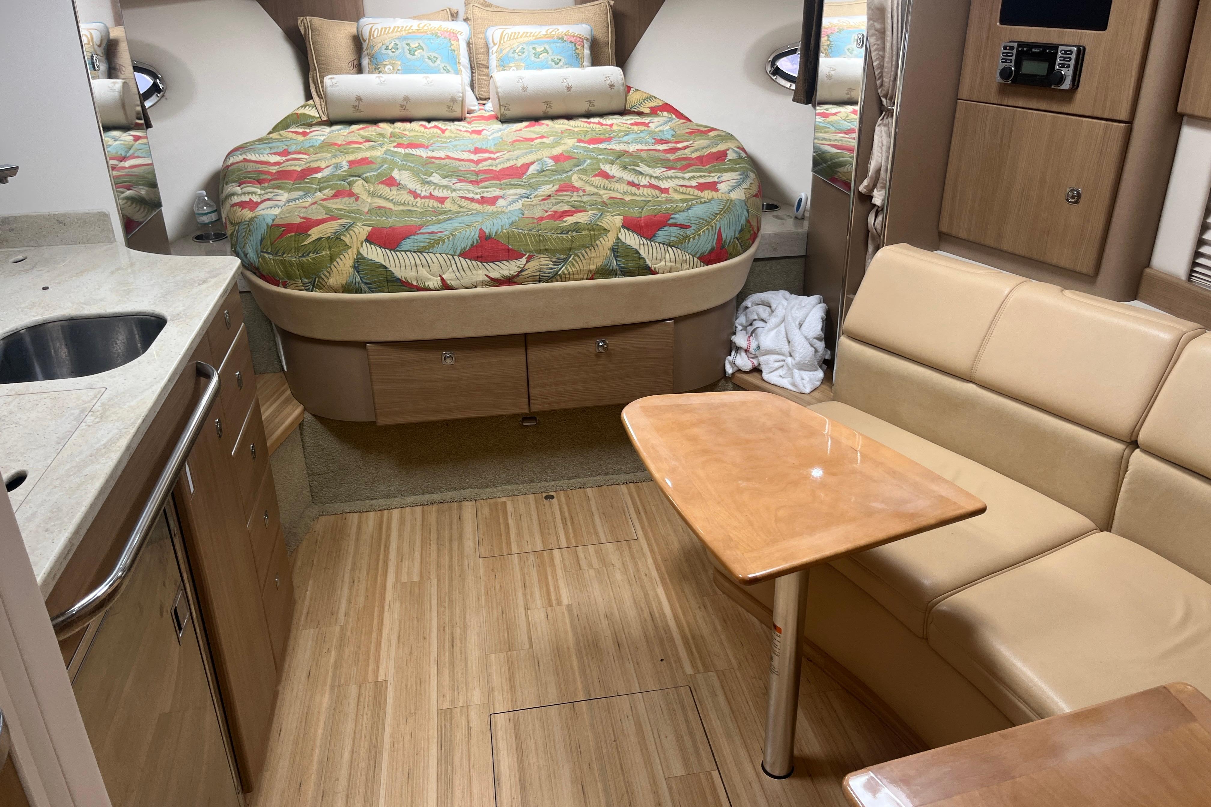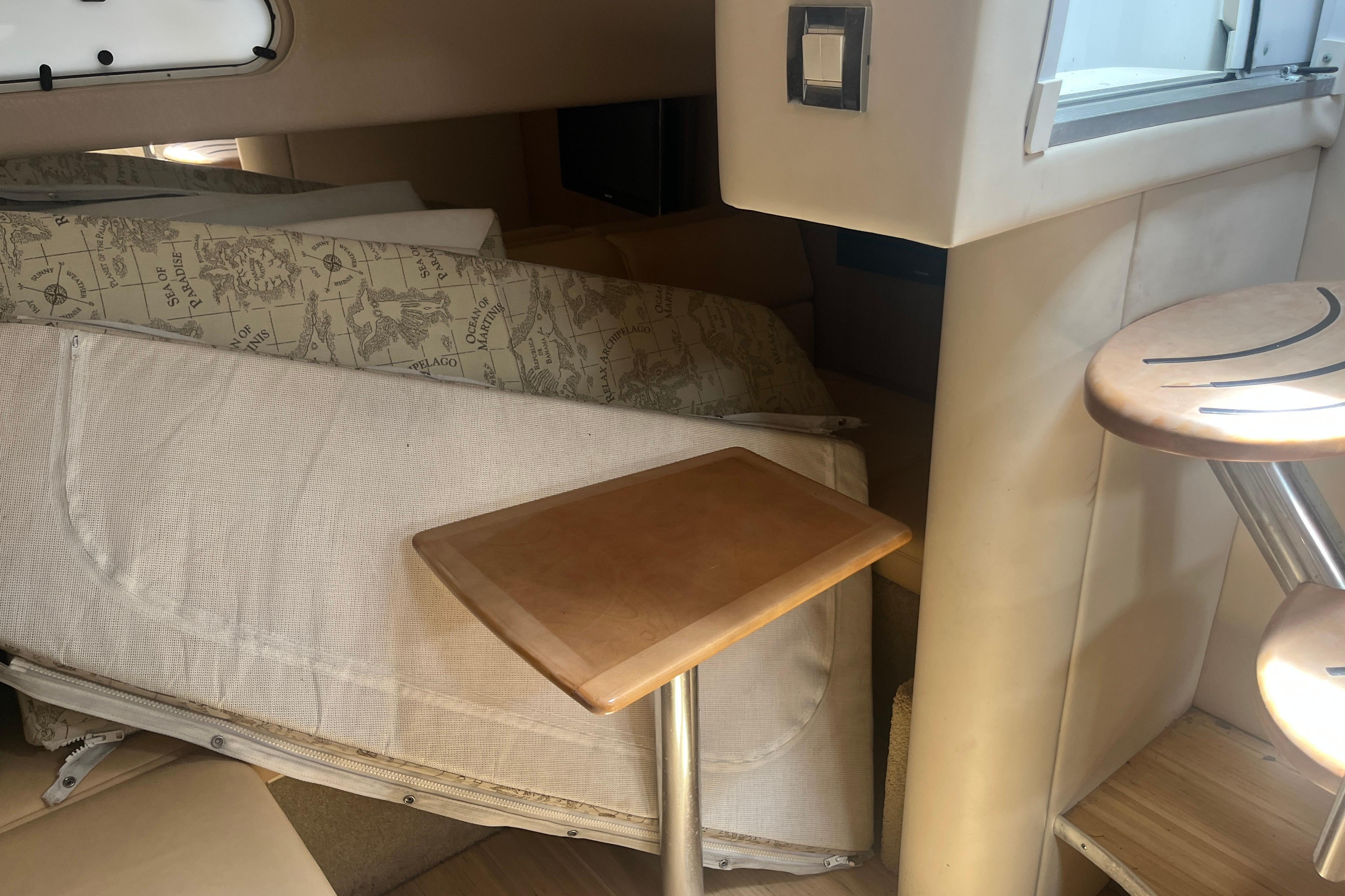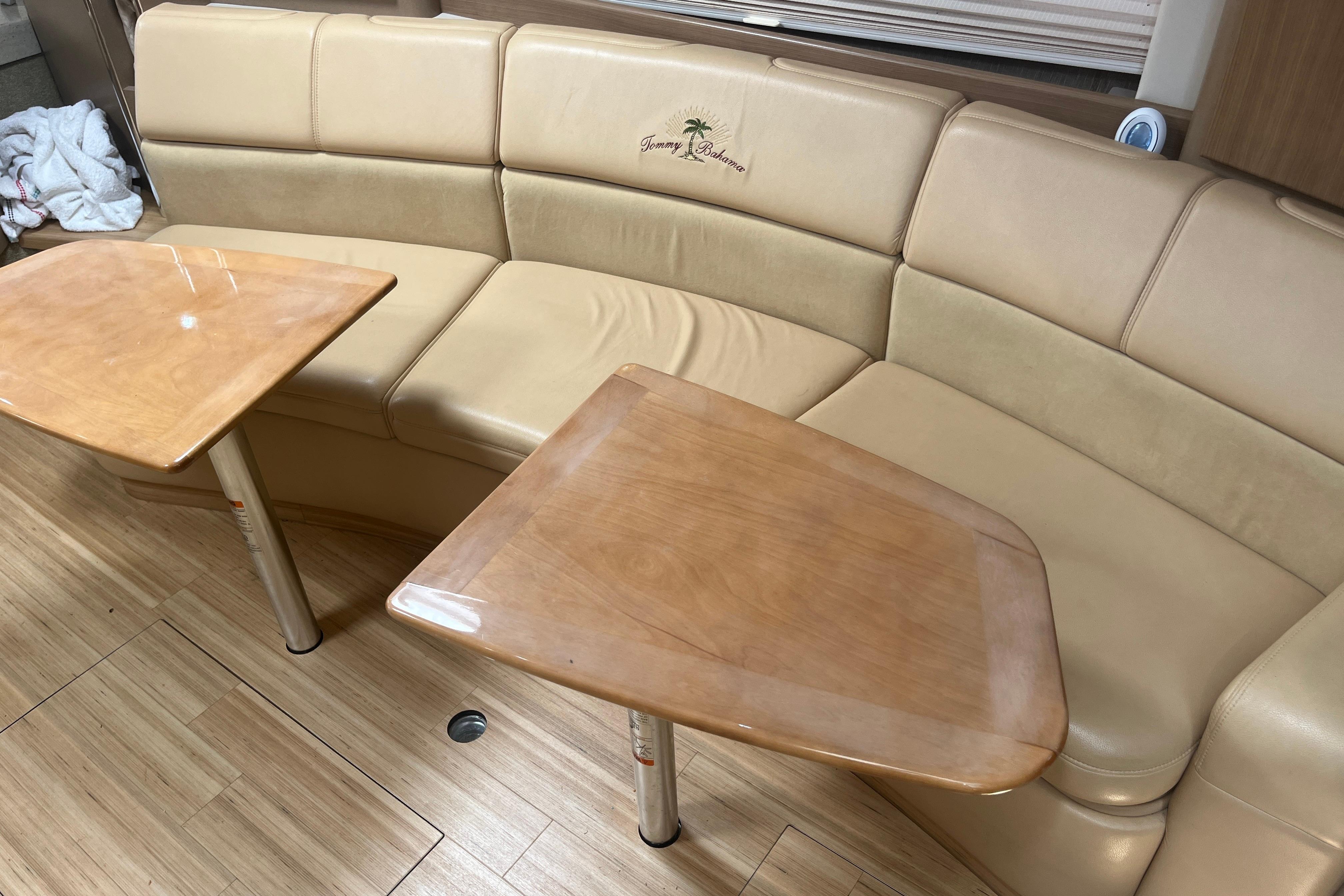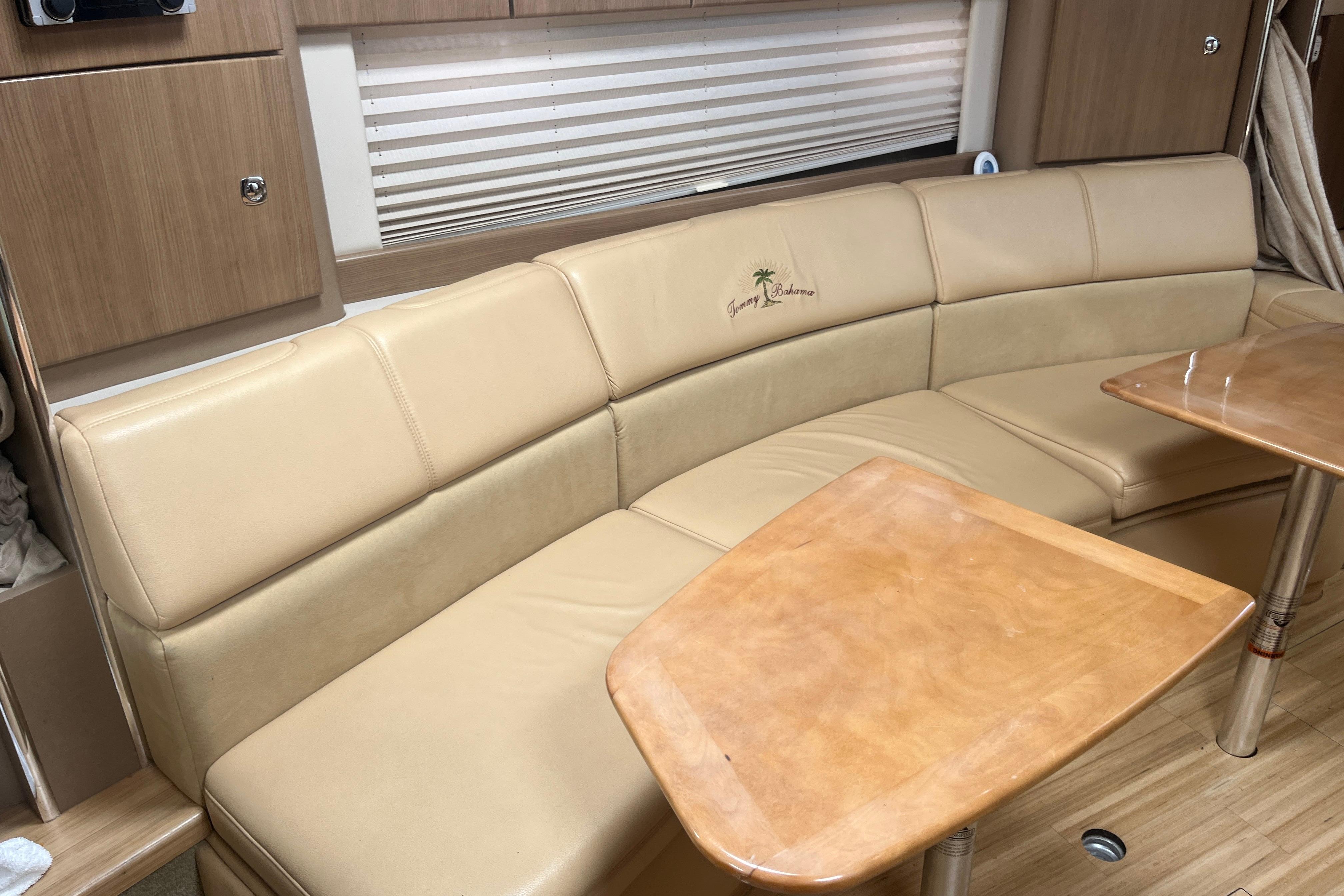 - Aft U-shaped lounge seating w/fiberglass-lined storage, two dual-height tables & sunpad inserts