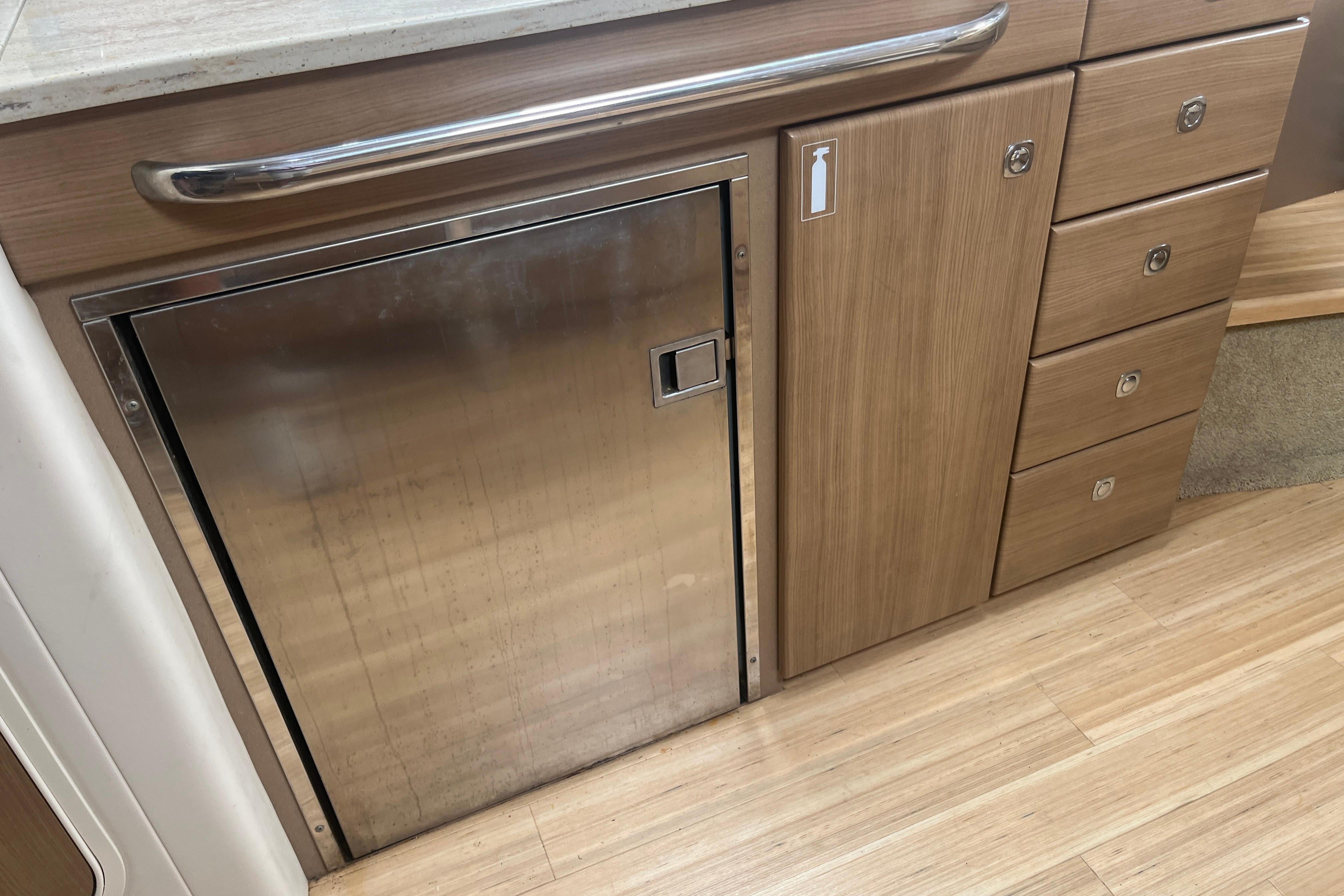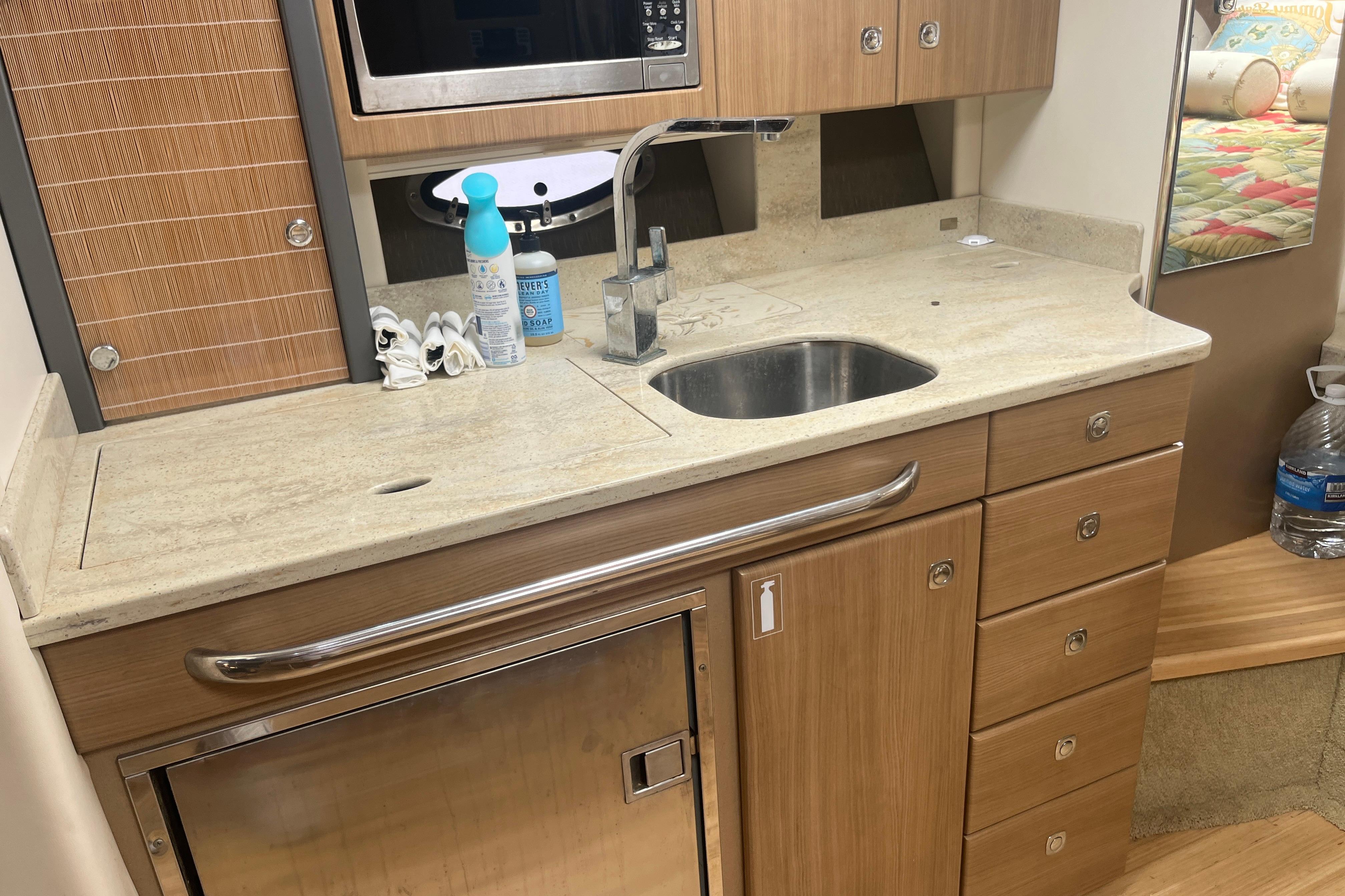 - Complete galley in high-gloss Deep Cherry finish w/storage and hardwood dovetailed drawers, full Corian countertop, beverage center, polished stainless steel sink, concealed 2-burner electric stove w/safety shut-off switch, 120V/12V stainless steel refrigerator, Krups® coffee maker, microwave oven & concealed in-counter trash container
