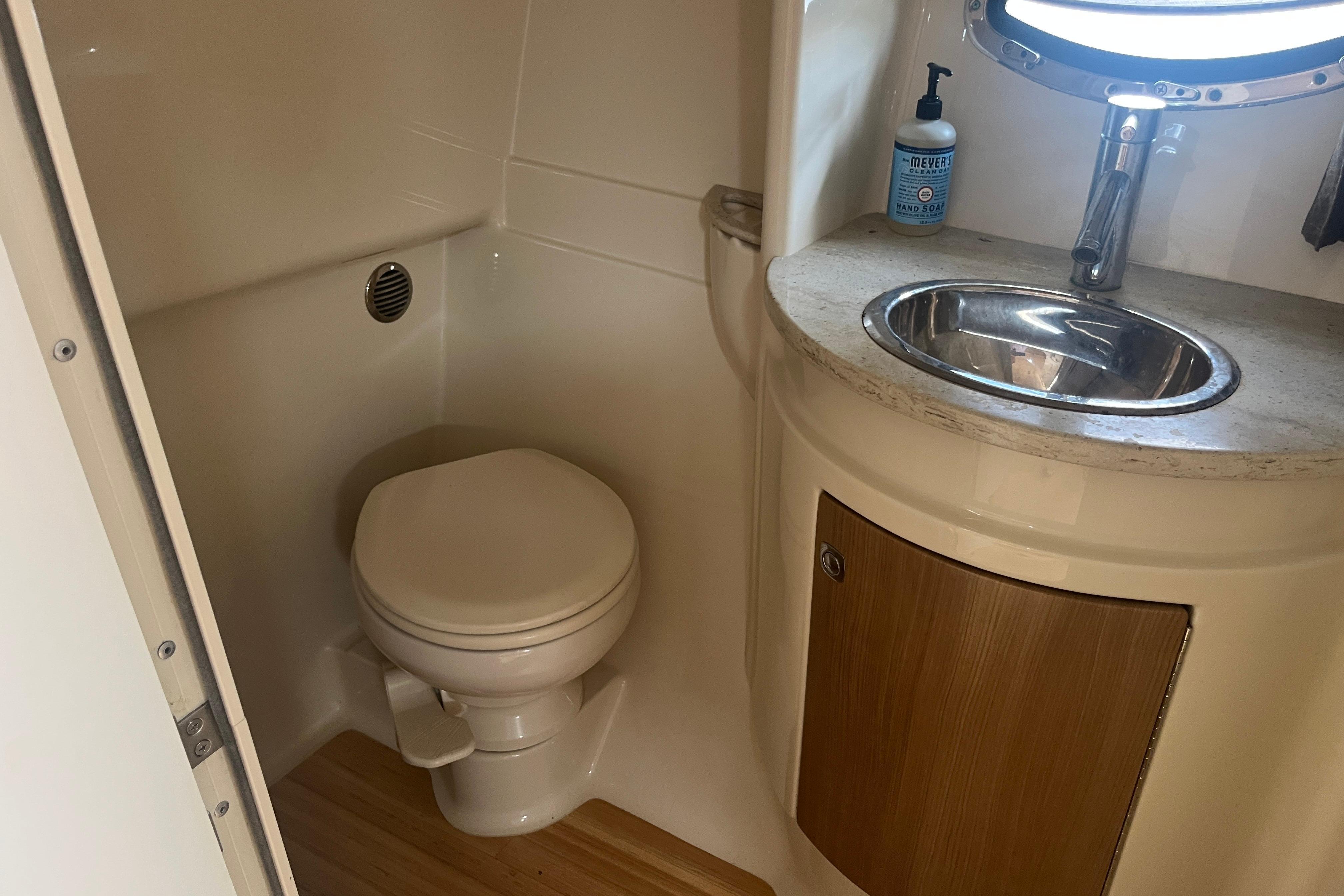 - Molded private head compartment w/molded vanity, lower doors in high-gloss Deep Cherry finish, Corian counter, polished stainless steel sink w/swivel faucet, VacuFlush® unit w/holding tank & dockside pumpout, separate stall shower w/hinged acrylic door & exhaust fan