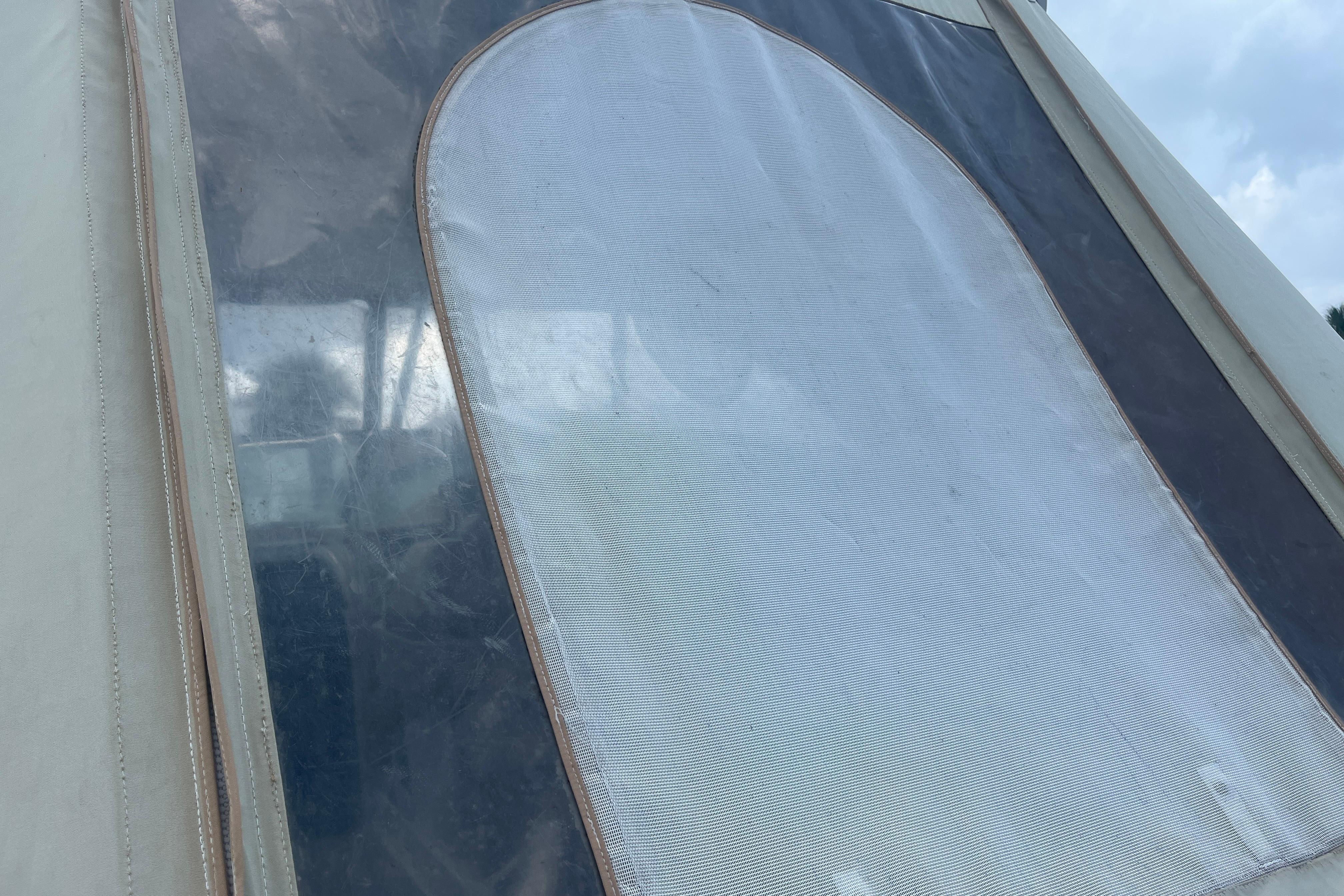 - Tinted, tempered curved-glass windshield w/center walk-thru