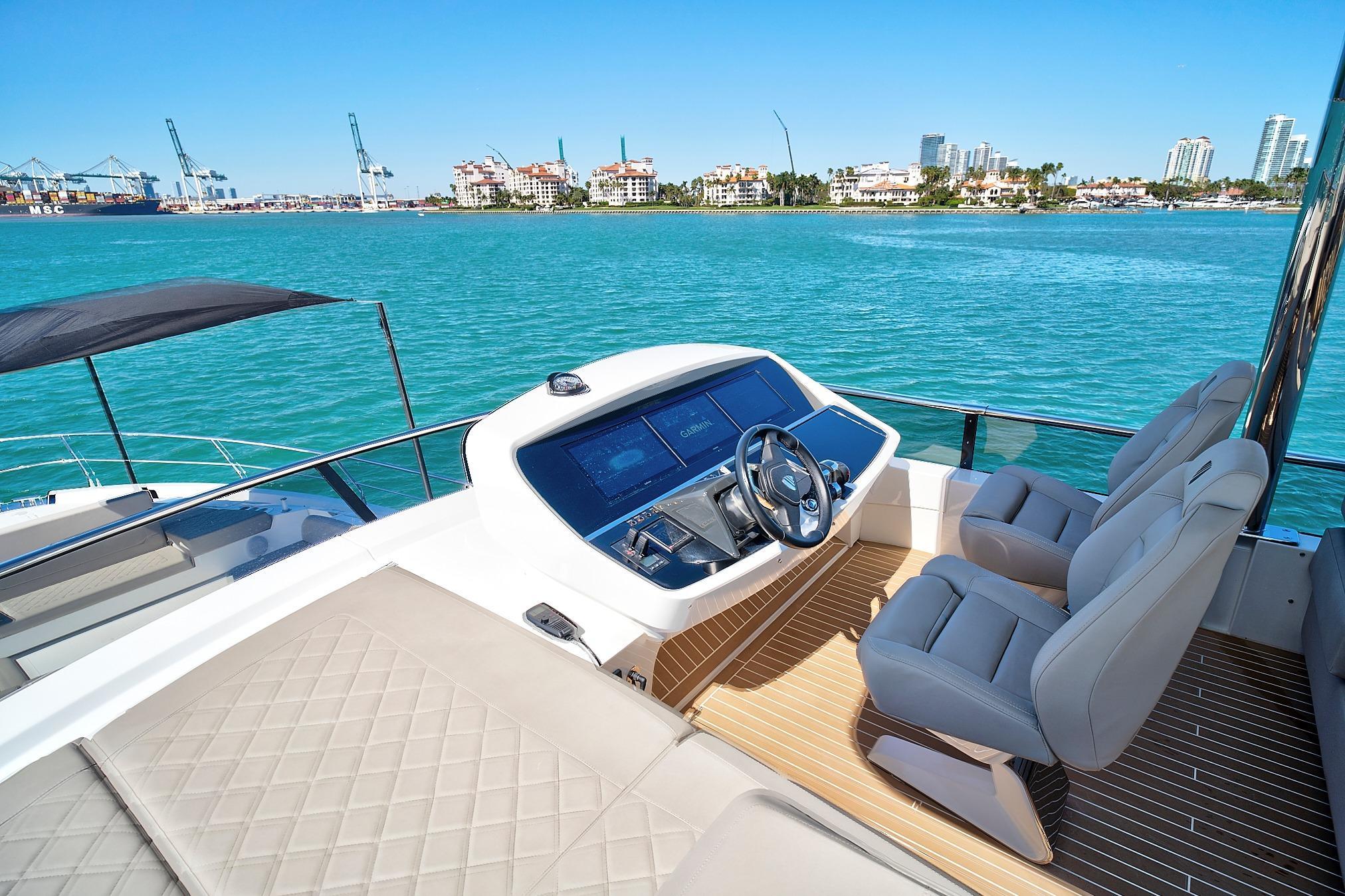 The 2021 Fairline Squadron offers the perfect combination of luxury and performance. Built for day or long-distance cruising, the vessel is powered by CAT C18-115 engines, known for their power density and torque. The Caterpillar engines are paired with ZF controls on both the flybridge and main helms. Garmin navigation screens and Bow and Stern thrusters with proportional controls, make the maneuverability of this yacht exceptional. The extraordinary performance of this yacht is complimented by its luxurious appointments and finishes. The flybridge area is large and spacious. Features include a retractable sunroof, multiple seating areas, large dining area with bench seating, a wet bar with sink, grill, Isotherm refrigerator and ice maker. The Bang and Olufsen sound system completes the package making the flybridge of this vessel the perfect space to entertain. The aft deck of Raw Wave showcases the yachts second eating and entertaining area. The deck includes a large, covered dining area, sliding glass doors that open starboard and retract/lower port, allowing easy access to the standing drink bar, galley area and main salon. The retractable doors completely connect the aft deck and main salon spaces, making transition from inside to out seamless. Inside, the main salon exudes both functionality and luxury. The vessel is open, contemporary and modern. Interior floors are hardwood. High gloss walnut wood details and cabinetry compliment the panoramic windows to create a stunning living area. The galley is located aft and adjoins the exterior aft deck when the glass sliding doors are opened/retracted. Fitted with white quartz countertops, top of the line Miele appliances, a full-size refrigerator, microwave/convection oven, cooktop and dishwasher, the galley ensures effortless food preparation and entertaining. Forward of the galley, is a large custom dining table with polished chrome legs and seating for six. A white leather sofa, separate loveseat and large entertainment center with a Samsung television complete the main salon. Forward and starboard is the lower helm, with triple Garmin screens, ZF throttles, and proportional bow and stern thrusters. Descend to the lower level of the yacht via a contemporary open staircase. There, the staterooms are spacious and well appointed. The center hallway also houses the combination washer/dryer. The Master cabin is located on the lower level aft. It features a striking custom headboard that combines elements of high gloss wood, mirror, and white lacquer. The ceiling is white and incorporates decorative components of both wood and chrome; carpeting is plush and white. The owner’s stateroom includes a king bed, built-in dresser with significant storage areas, large windows, decorative polished chrome lamps, nightstands, reading lights, separate desk/dressing area with stone counters, seating area, two closets, a safe and ensuite bath suite. The VIP cabin is forward and includes a raised queen bed, high gloss wood detailing complimented by polished chrome accents, upper storage cabinets, skylights, two hanging closets, a full-sized dressing mirror, television and large windows. The ensuite bath with marble floors and counters, glass walk in shower, rectangular window, mirrored cabinet with storage, above counter sink and under sink storage. The starboard guest cabin features a full-size bed, television, large window, dressing mirror and hanging closet. The starboard stateroom connects to an ensuite bath. Twin cabin is to port and fitted with above/below twin beds, window and spacious closet. Other notable and upgrades features: CAT C18-115 engines,ZF controls,Bow and Stern thrusters,Garmin navigation screens on flybridge and lower helm,Hydraulic swim platform with beach package and shower,Retractable sliding glass doors connecting aft deck and main salon,Flybridge wet bar,Standing bar on main aft deck, Modern interior finishes –including hardwood floors, white upholstery and polished chrome accents,Contemporary and open design,Glass display and storage cabinet,4 staterooms with 3 ensuite baths,Master cabin with custom headboard, surround sound, built in dresser, desk, seating area, large closets, safe and ensuite bath,Crew quarters with 2 twin beds and head,Indoor and outdoor entertaining areas,Autopilot, GPS, Radar, Depth Finder,Cummins Onan Generator,Underwater lights,Exterior lights,Drink holder on exterior tables,Water maker (AquaPrime),Phoenix Inverter,Exterior storage and beverage space. Schedule your showing today!