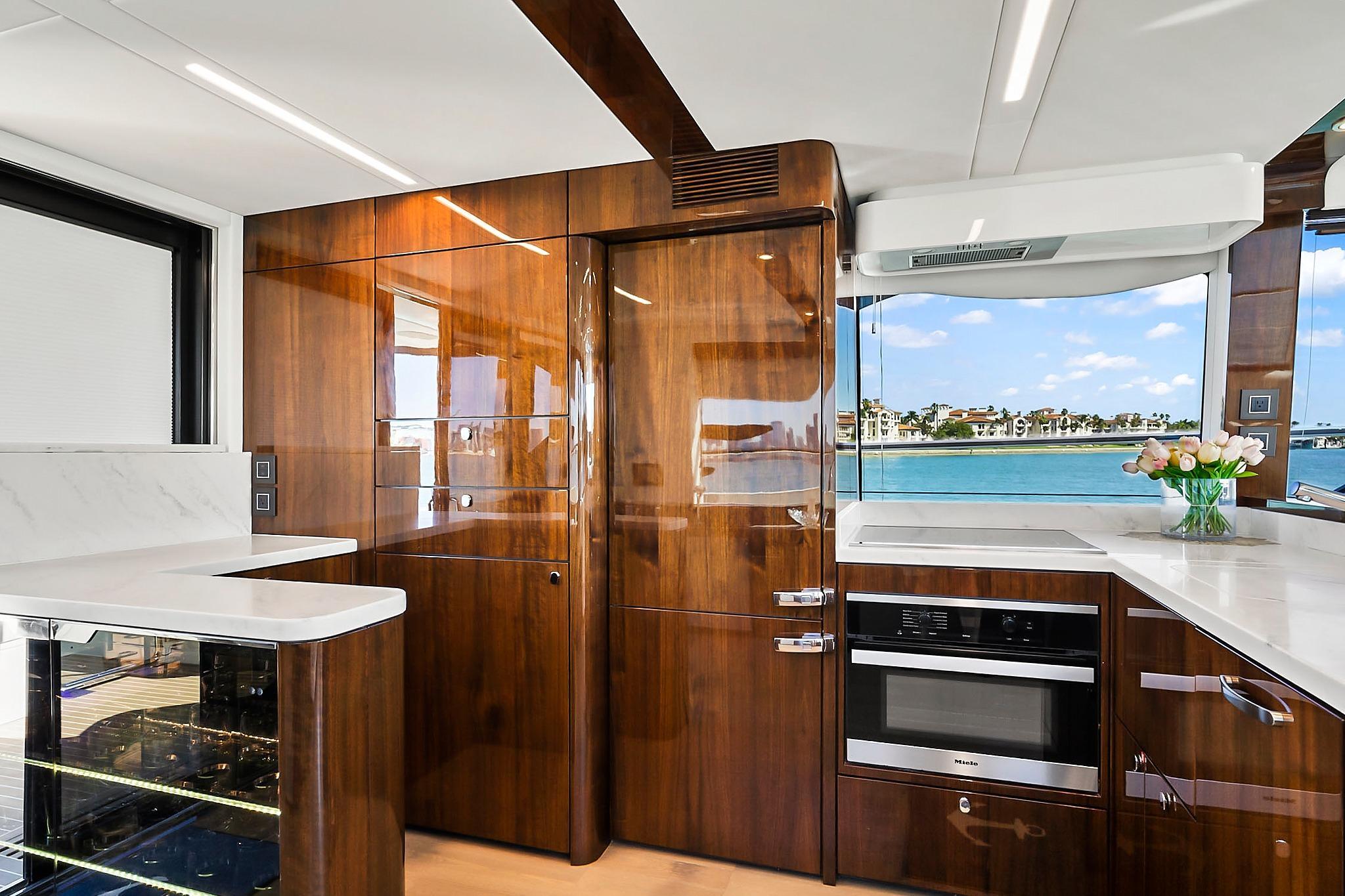 This yacht boats contemporary styling with a modern vibe, meticulously hand crafted in England. The Squadron 68 seamlessly combines upscale fashion with a well thought out layout. Featuring four guest cabins, three with ensuite baths. Master and VIP with European size King Bed, and two guest cabins that each sleep two guests. Crew Quarter sleeps two and is equipped with full size shower and bathroom area. The spacious Flybridge provides three area tailored to your specific needs such as luxurious dining, triple sun loungers and forward seating. Well Equipped Galley, with full size fridge and freezer, single combi oven, solid surface worktop, expansive storage.