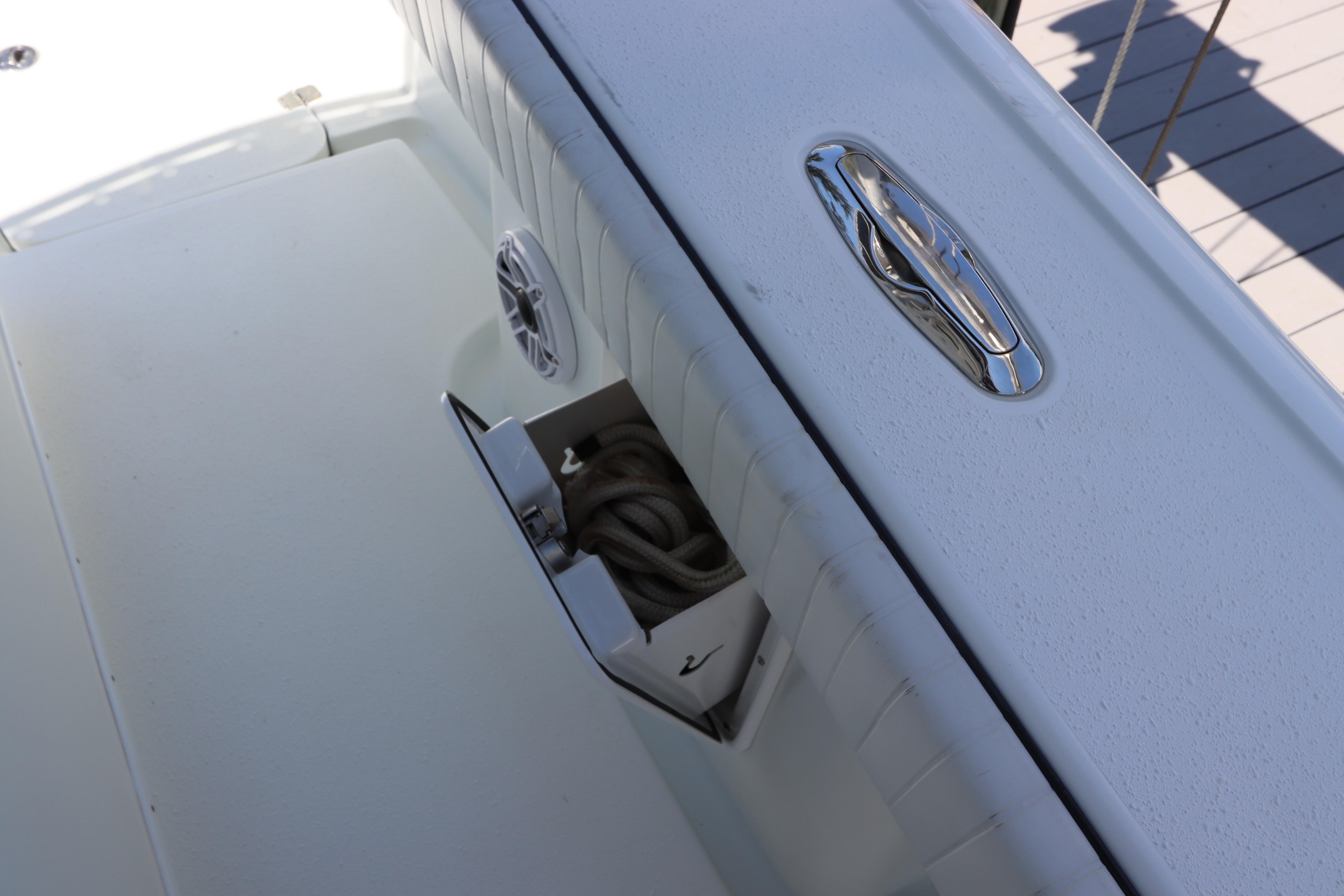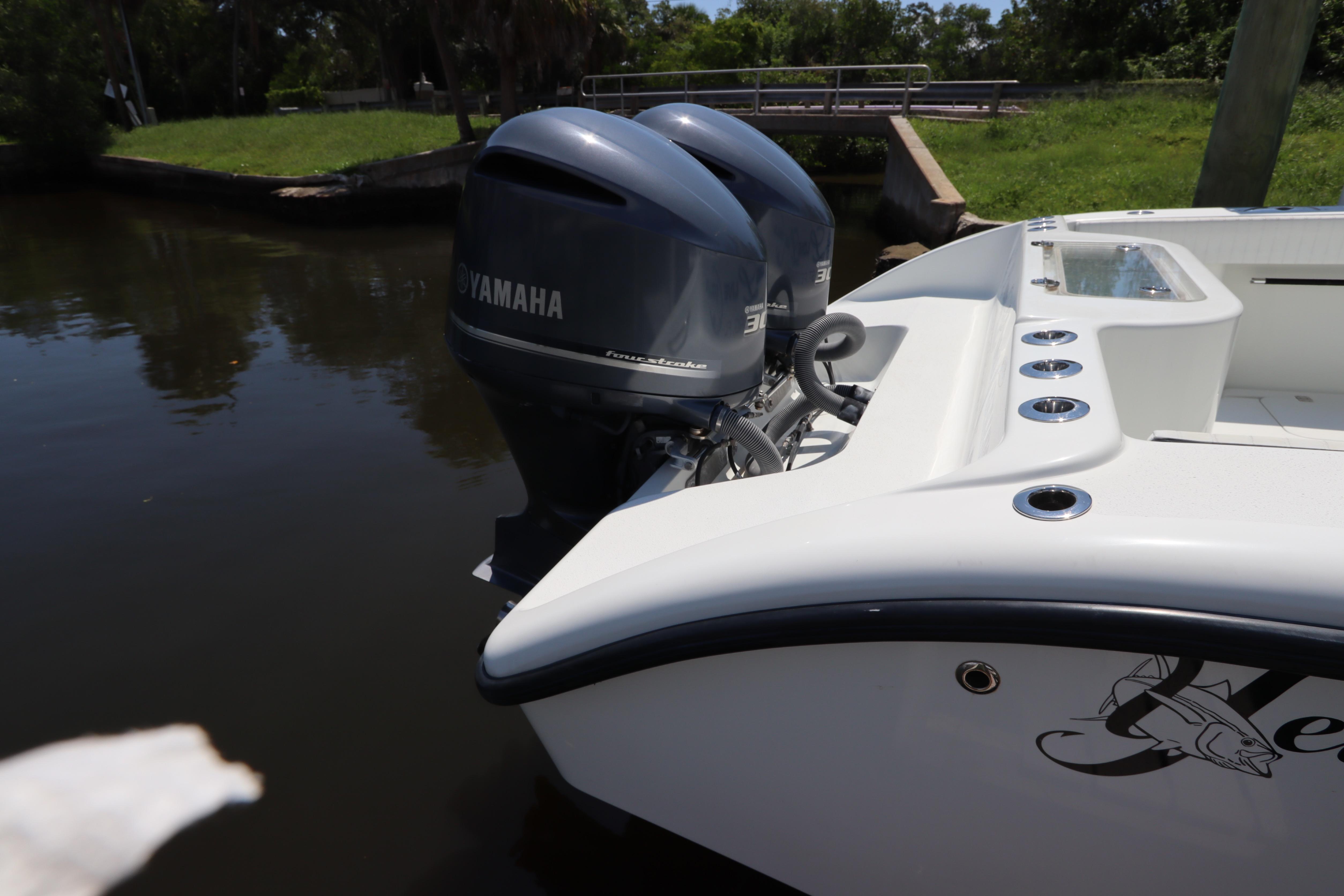 The Yellowfin 32 is a fast, dry, and seaworthy center console whose graceful sheer and meticulous finish set her apart from most anything on the water. As the replacement boat for the earlier Yellowfin 31 (2001–07), the 32 carries her beam further aft than her predecessor to handle the extra weight of modern four-stroke outboards. Her double-stepped hull is fully cored, and the relatively light weight of the 32 makes her an easy boat to trailer. Standard features include an integrated transom bracket, recessed bow rails, walk-in console with marine head, 55-gallon aft livewell, large insulated fish box (macerated), in-deck storage boxes, flush mount cleats, pop-up bow light, cockpit lights, console rod holders, leaning post with aft-facing seat, hydraulic steering, cockpit bolsters, gunnel rod holders, high performance trim tabs, T-top, and raw-water washdown. Because each Yellowfin is sold factory direct, owners can choose from an extensive list of add-ons including a coffin box, forward seating, deluxe leaning post, or extra fuel capacity to customize the boat to meet individual needs. A fast ride, twin Yamaha 300s deliver a top speed in the range of 60 mph.