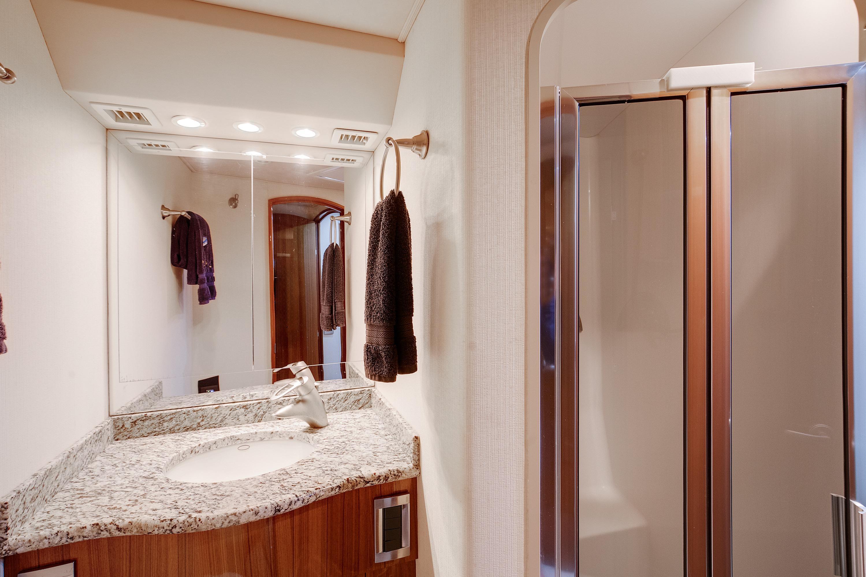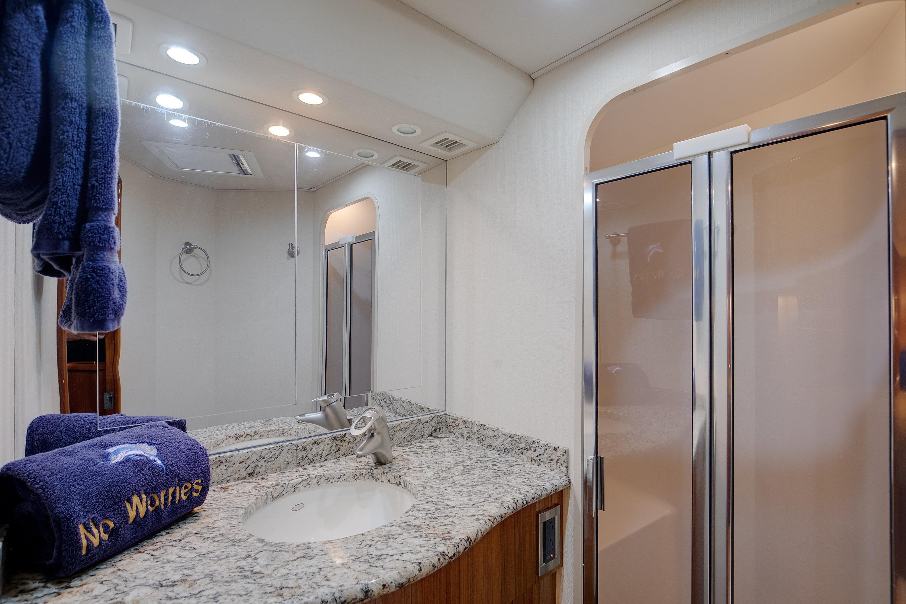 The 54' Viking Convertible features a three stateroom, two head layout. The port-located Salon door slides open to reveal the large Salon. There is a well equipped galley forward and to the port of salon with a dinette to starboard. Forward and down several steps are the staterooms. Guest Stateroom starboard features crossover upper and lower berths. Center and to starboard is the Guest Head with clothes washer and dryer. Large Master Stateroom port and has an en-suite Head. Forward VIP Stateroom with queen berth.