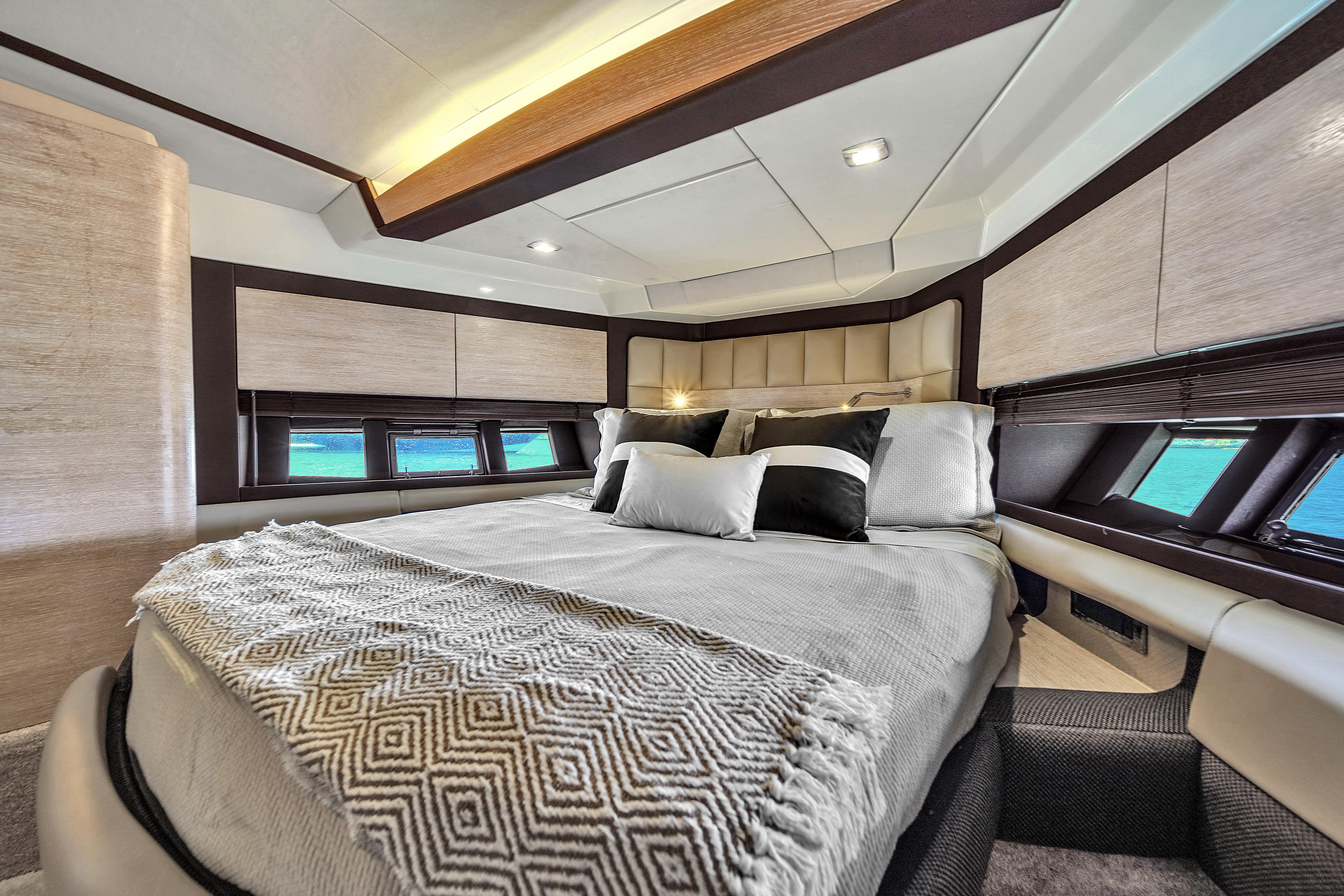 Queen berth with waterline views