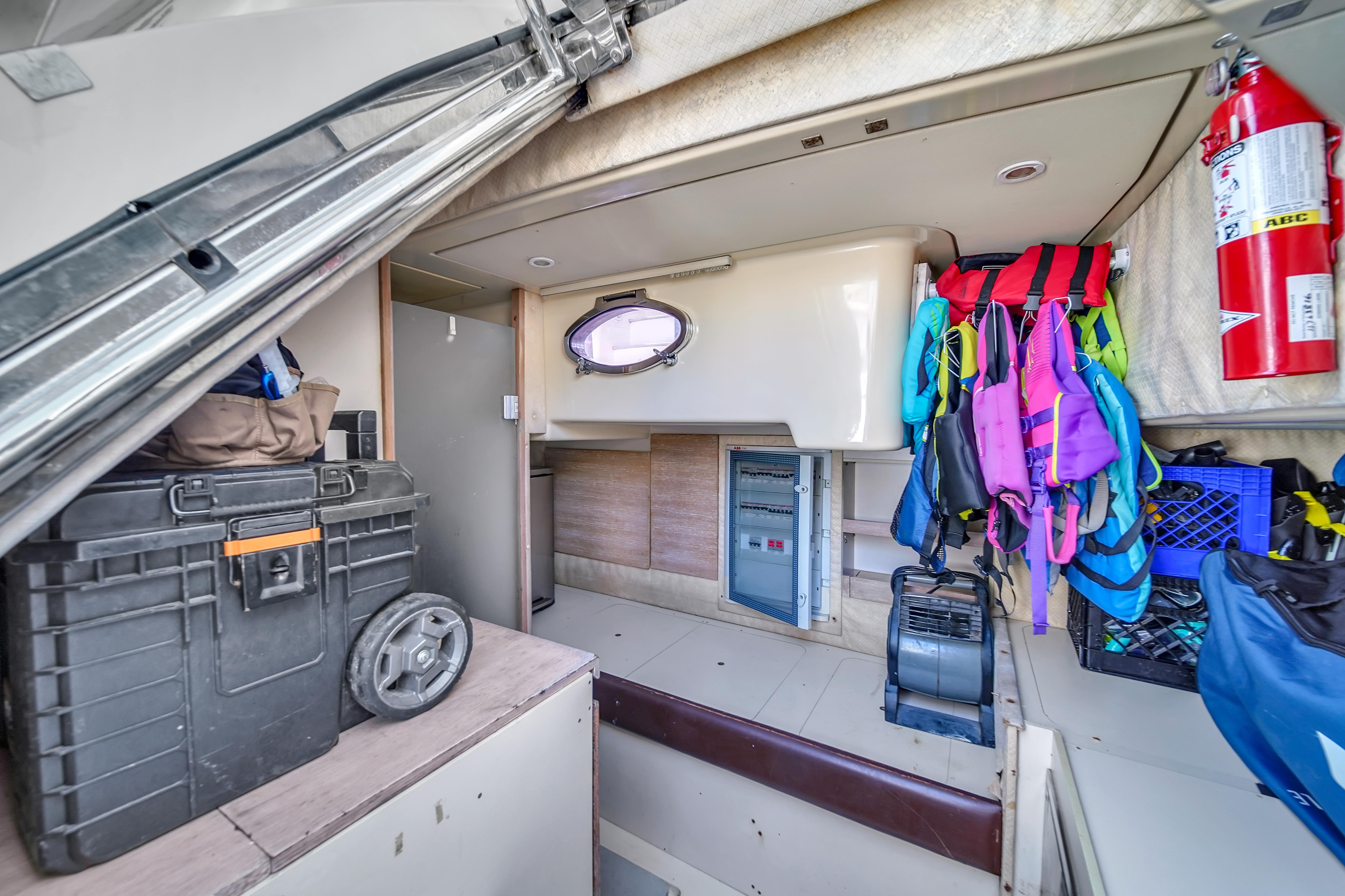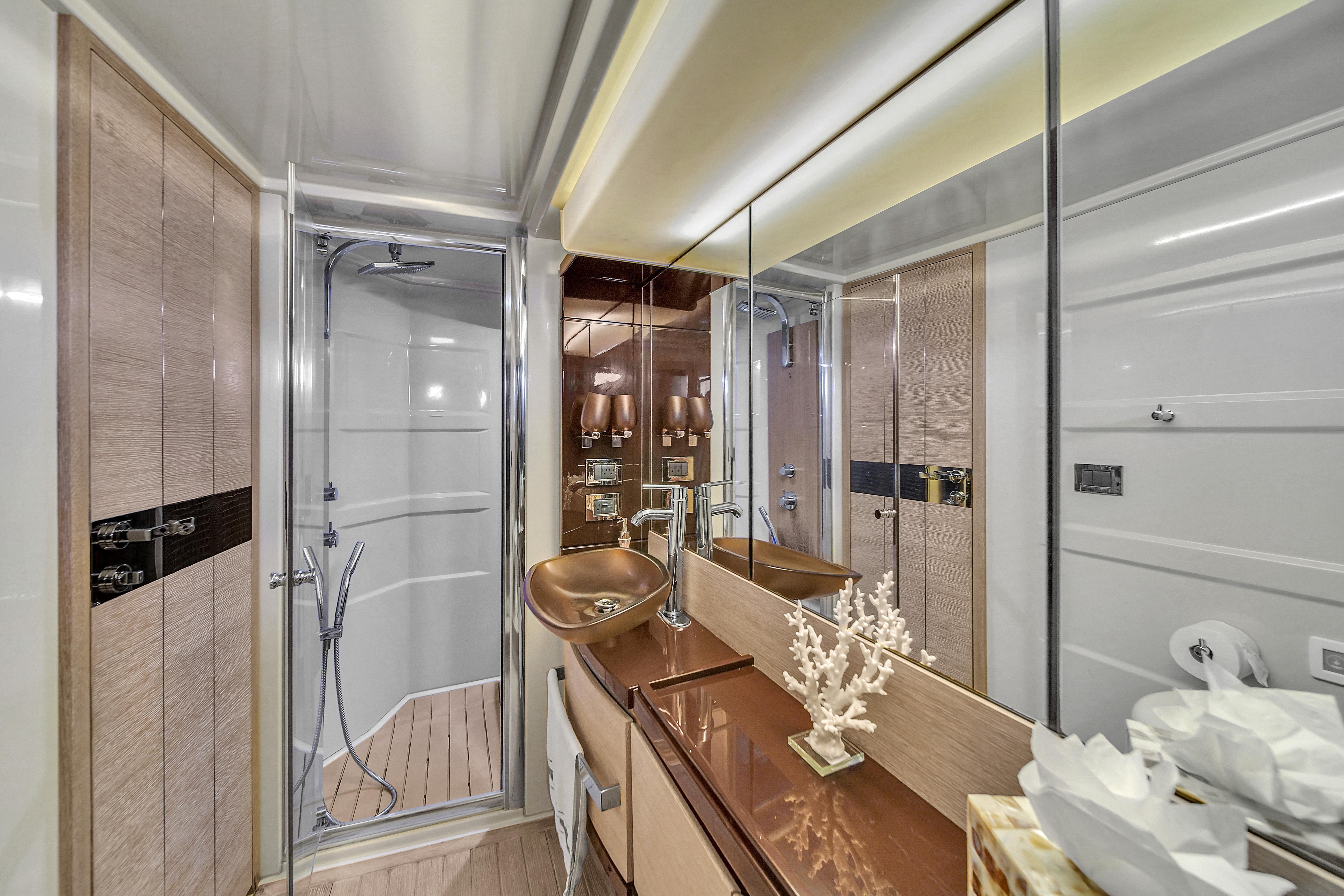 The Master stateroom spans the full beam of the yacht and features eight large waterline windows and four opening portholes. It includes an island queen berth on the port side and a vanity on the starboard side. Storage is plentiful with a large hanging locker and shelved storage area. The master suite is further enhanced by a dedicated AV system with an Onkyo receiver and Bose surround sound. The en-suite head is elegantly designed with fine woodwork, a basin sink, and ample storage, completed by a stall shower with a waterfall-style showerhead and separate wand for a luxurious bathing experience.