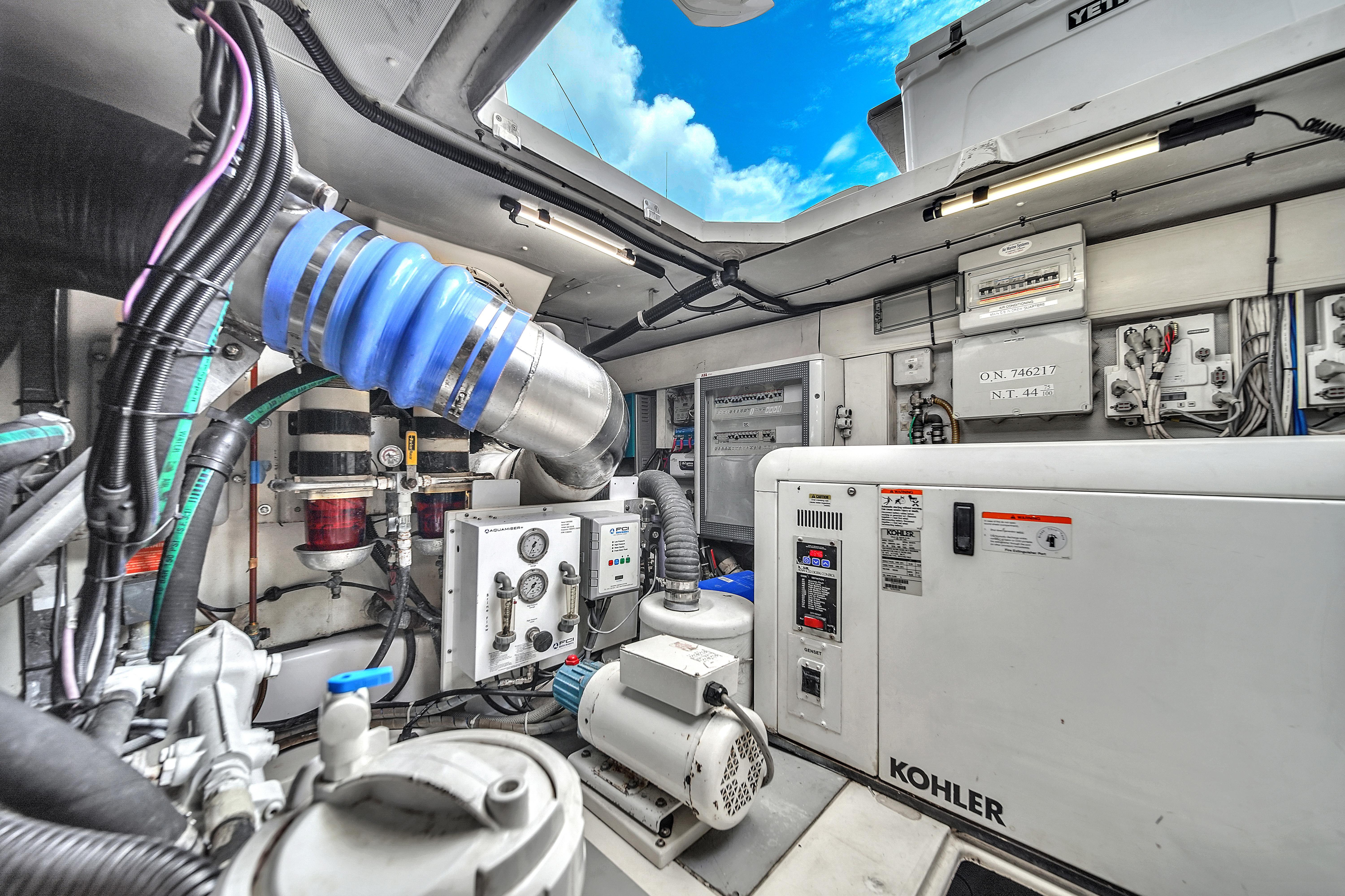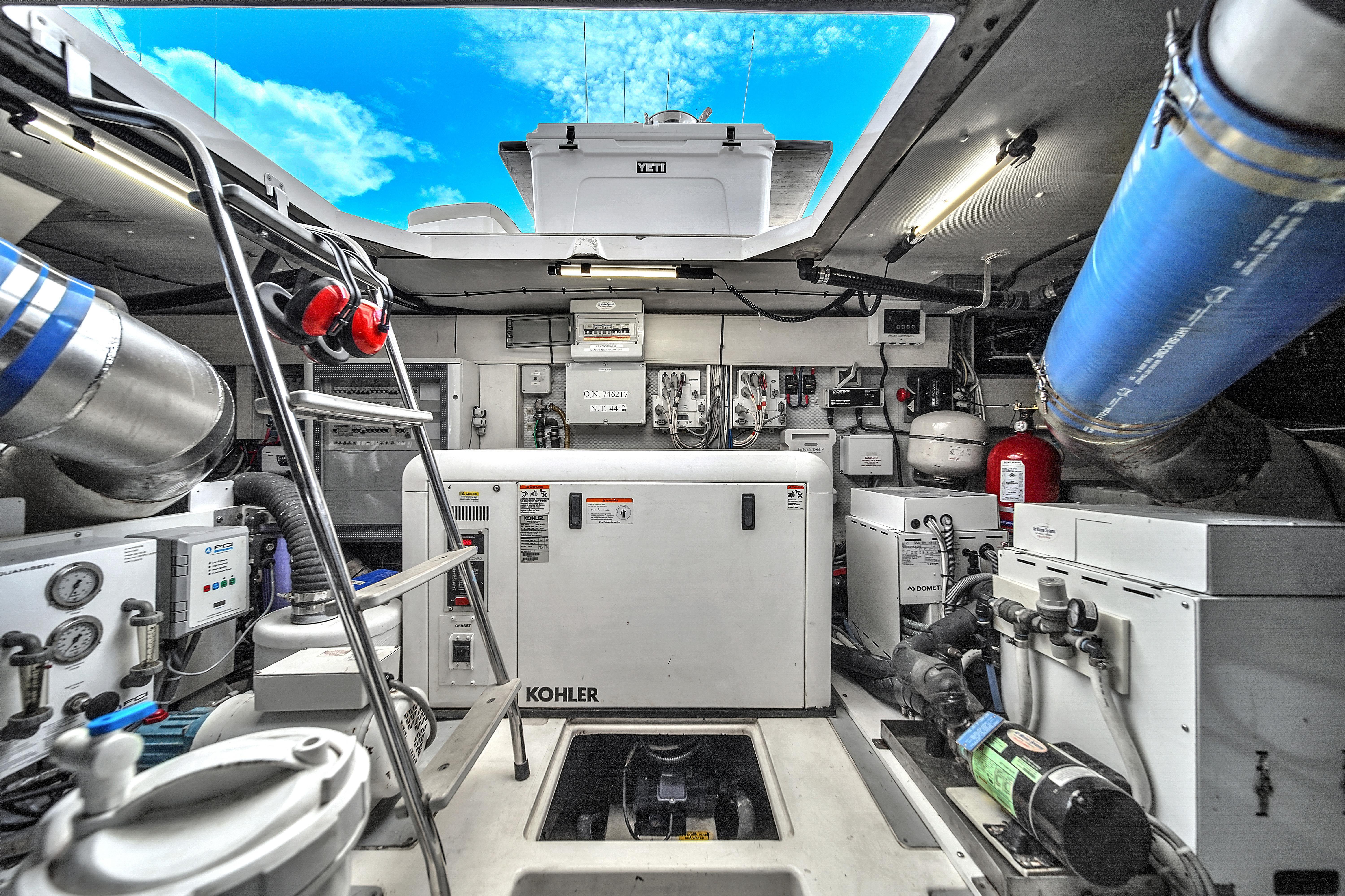 The lower helm on the starboard side and the upper helm on the port side are both equipped with Raymarine Platinum Package technology. This system includes dual 15" touchscreen displays (a single display on the flybridge), separate auto-pilot control, Tridata instrument display, twin Seakeeper LCD panels, quick chain anchor counter, LCD Motronica display, Xenta Joysticks, ZF Marine propulsion gears, electric window controls, and video cameras offering views of the engine room, bridge, and aft deck areas. The flybridge boasts a full hardtop with a retractable center section, allowing ample sunlight to illuminate the space. The portside summer galley is well-equipped with a Kenyon grill, freshwater sink, and Vitrifrigo ice maker, ideal for outdoor dining and entertainment.