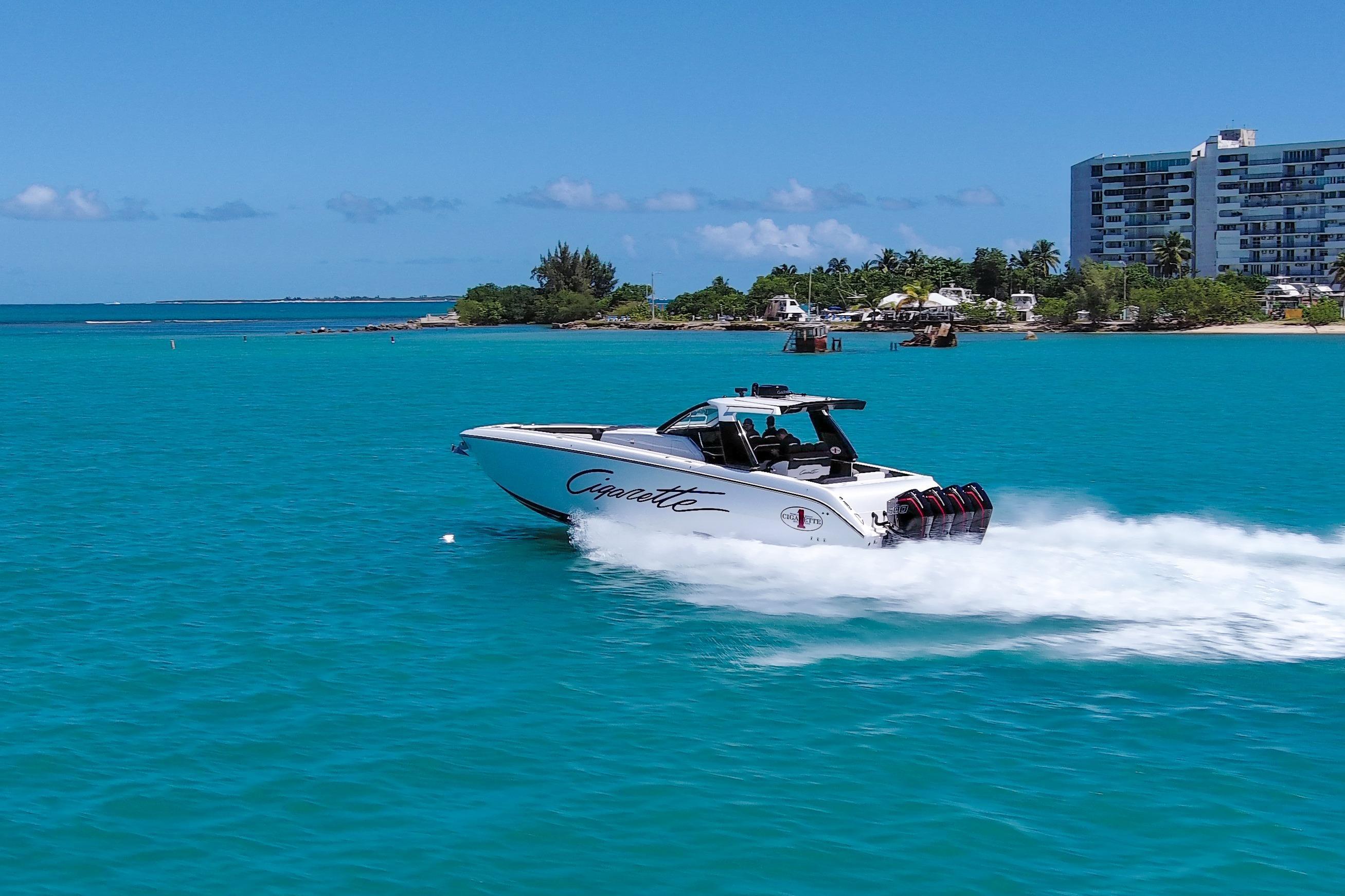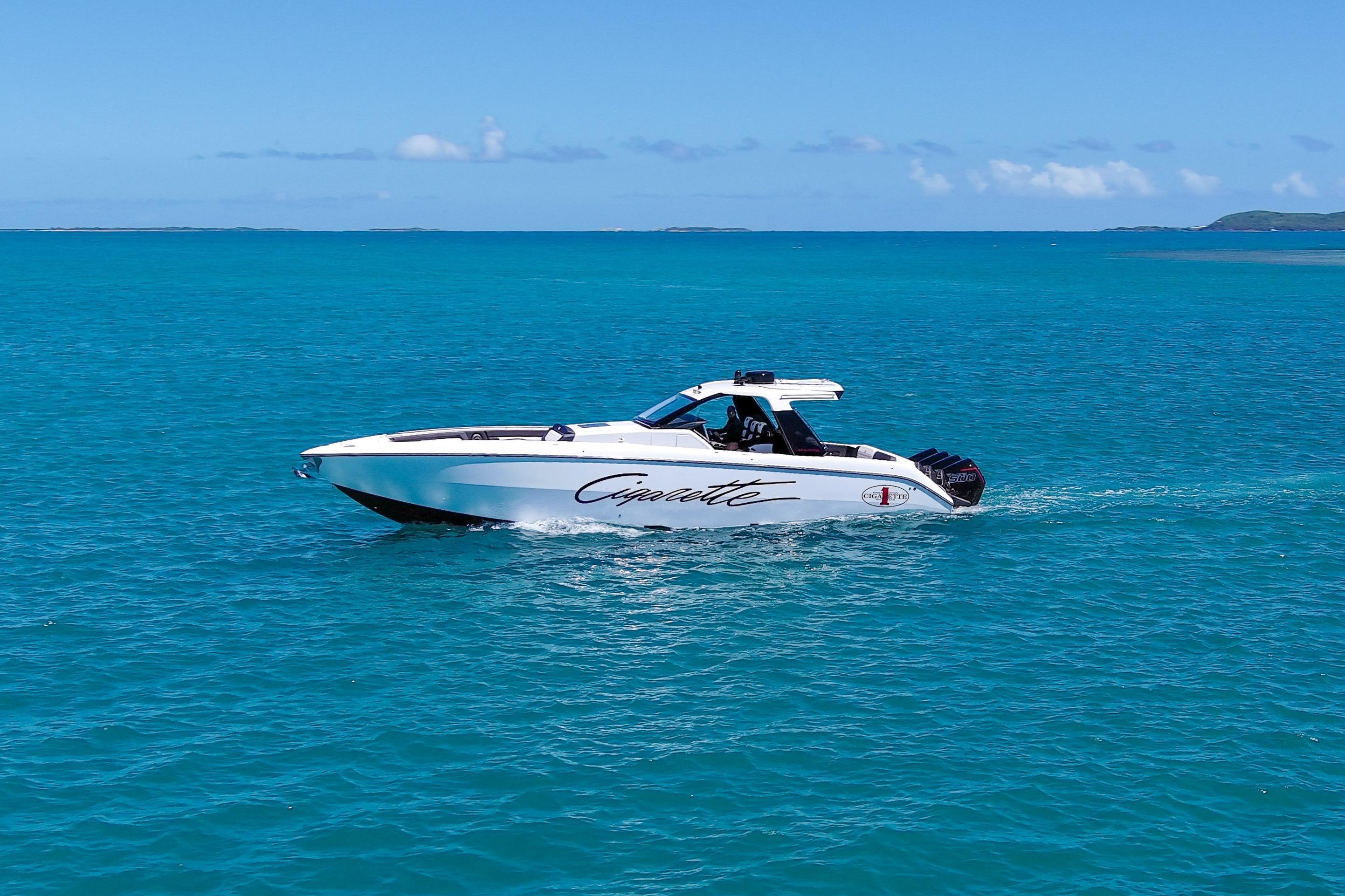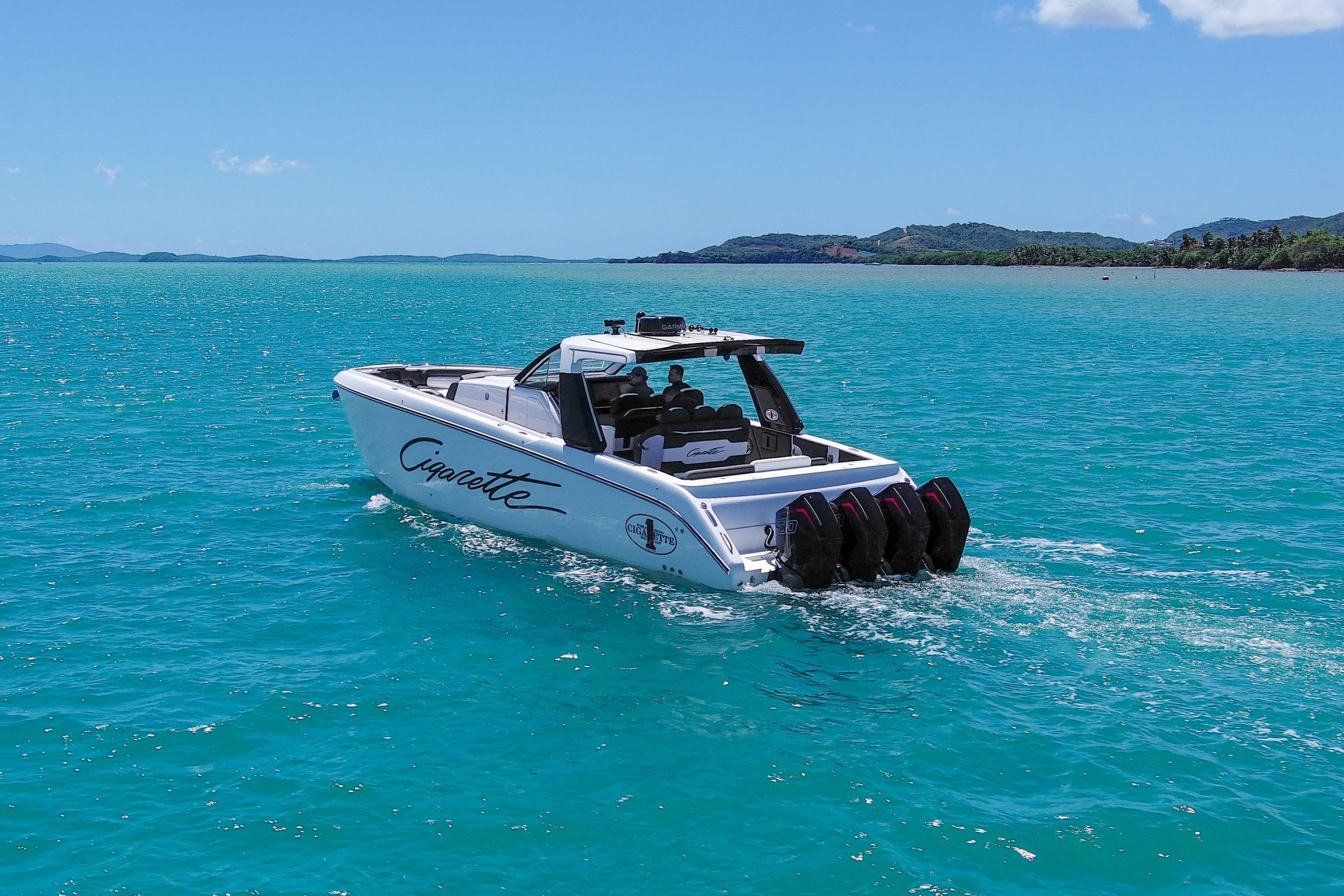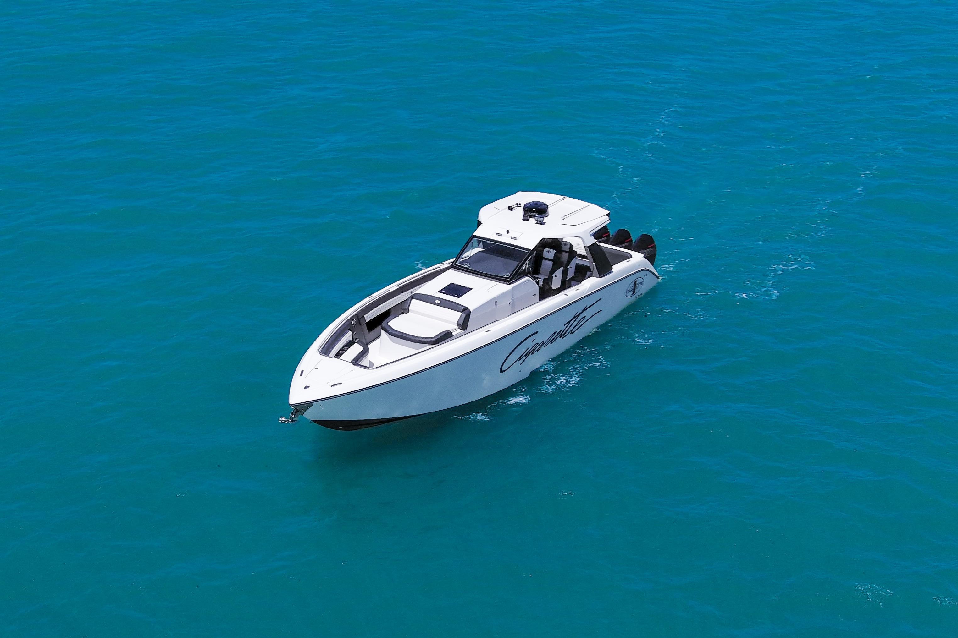 2025 Cigarette 42 AurorisLuxury performance meets offshore capability in the Cigarette 42 Auroris, powered by quad Mercury Racing 500Rs and finished with Cigarette’s signature attention to detail.ExteriorWhite/Jet Black/Sunfast Red two-tone gel coatBlack hardtop with flair wingsStainless steel rub railTelescoping aft sunshadeNon-skid flooringInteriorDual row helm seats with cross-stitch detailCool-touch white & black fabrics with black pipingPower adjustable seatingComfort & ConvenienceBow thruster & windlass systemA/C & diesel generatorPre-wire for SeakeeperQuick release fender holdersFront & rear facing camerasElectronics & EntertainmentGarmin 24 HD radarGarmin autopilotFLIR M232 thermal cameraACR searchlightJL Audio Pure Plus sound systemEnginesQuad Mercury Racing 500Rs (black with red decals)