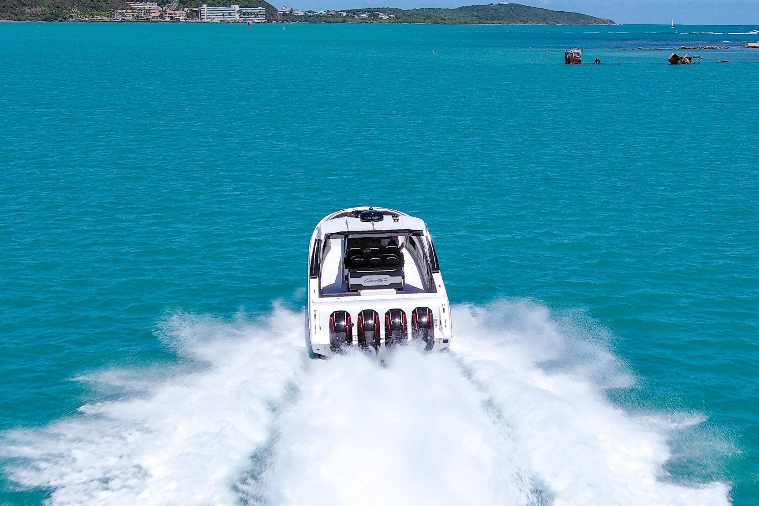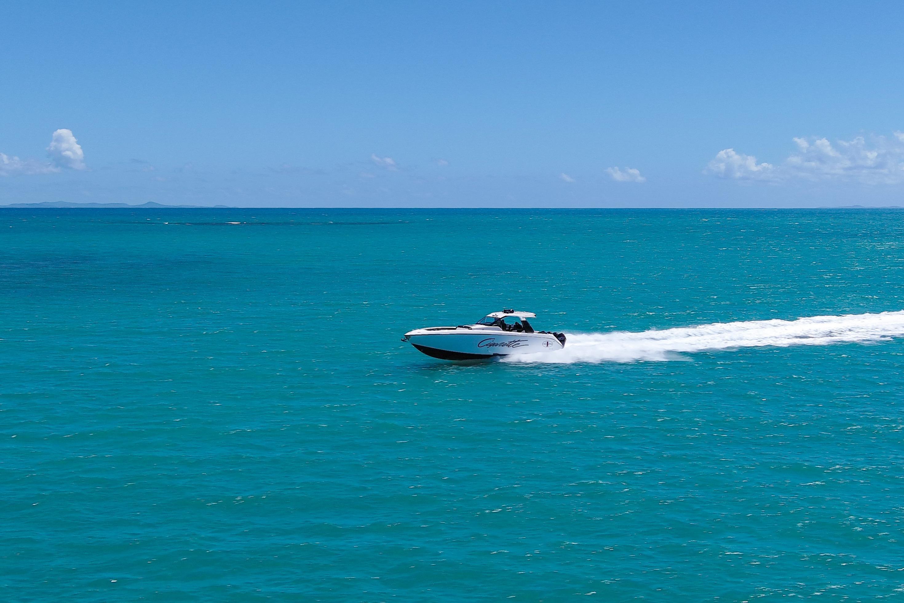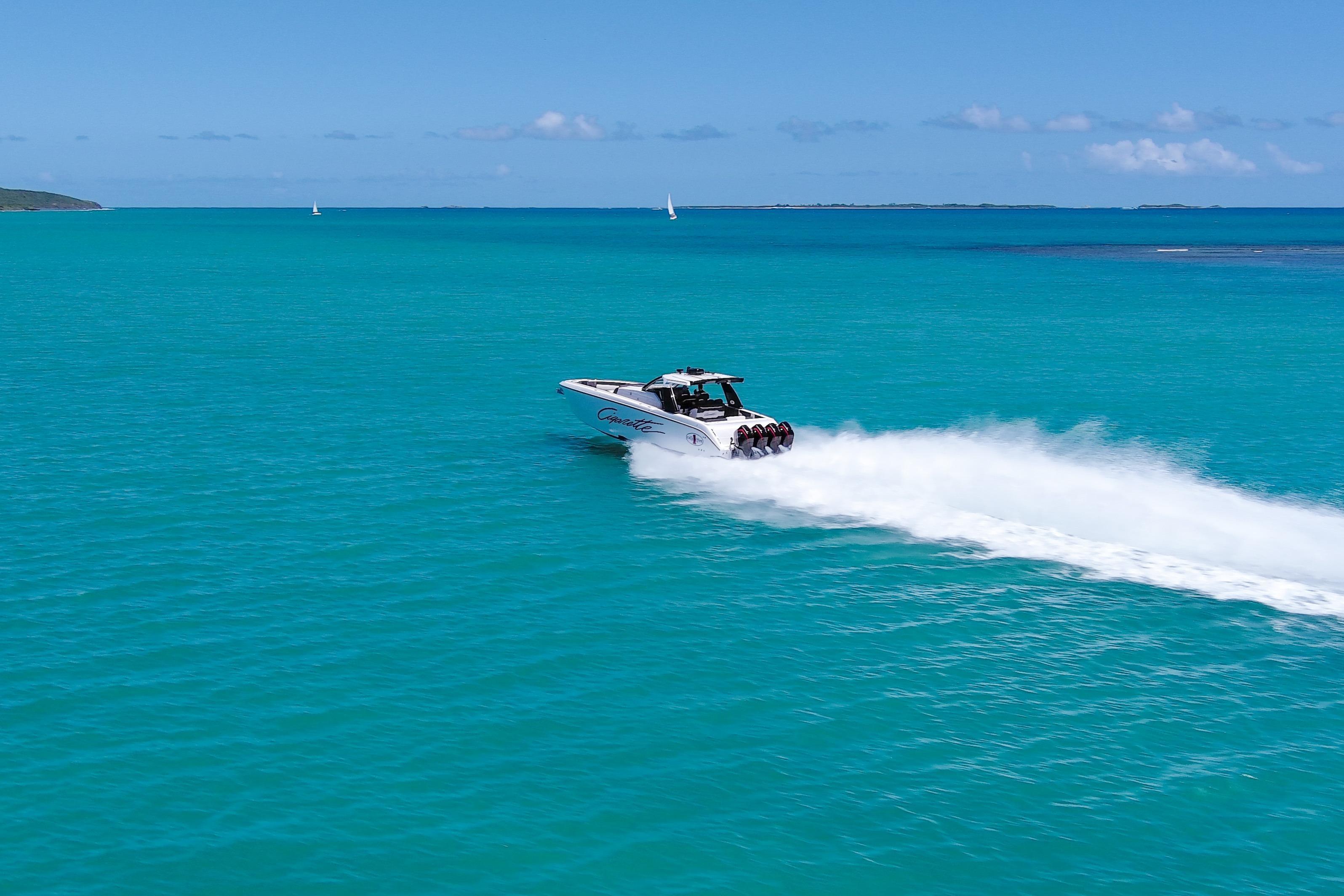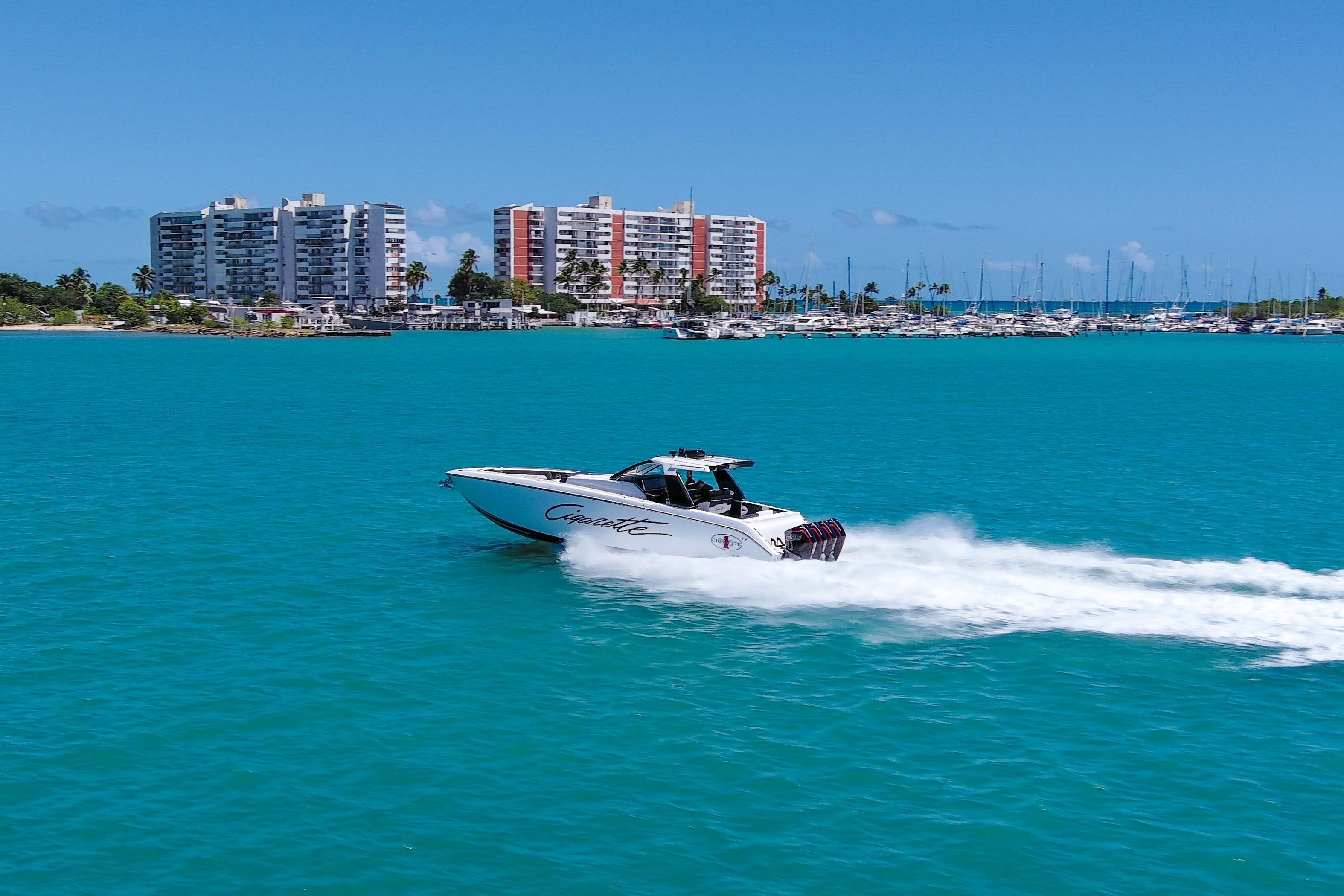 2025 Cigarette 42 AurorisLuxury performance meets offshore capability in the Cigarette 42 Auroris, powered by quad Mercury Racing 500Rs and finished with Cigarette’s signature attention to detail.ExteriorWhite/Jet Black/Sunfast Red two-tone gel coatBlack hardtop with flair wingsStainless steel rub railTelescoping aft sunshadeNon-skid flooringInteriorDual row helm seats with cross-stitch detailCool-touch white & black fabrics with black pipingPower adjustable seatingComfort & ConvenienceBow thruster & windlass systemA/C & diesel generatorPre-wire for SeakeeperQuick release fender holdersFront & rear facing camerasElectronics & EntertainmentGarmin 24 HD radarGarmin autopilotFLIR M232 thermal cameraACR searchlightJL Audio Pure Plus sound systemEnginesQuad Mercury Racing 500Rs (black with red decals)