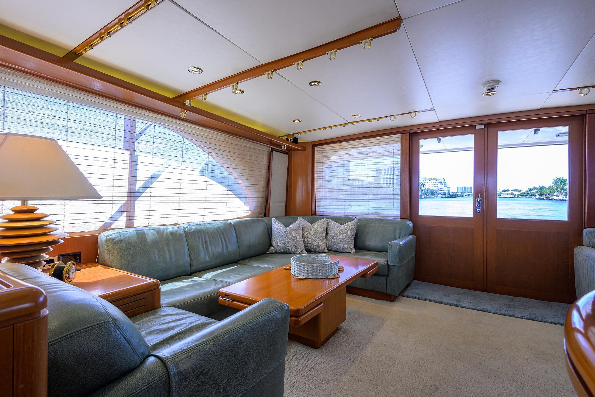 Immediately to starboard upon entering is a large U-shaped leather settee to seat six people. The forward corner has a built-in end table with a decorative wood table lamp above. In front of the sofa is a high-low cocktail/dining table with two hinged leaves at the ends.