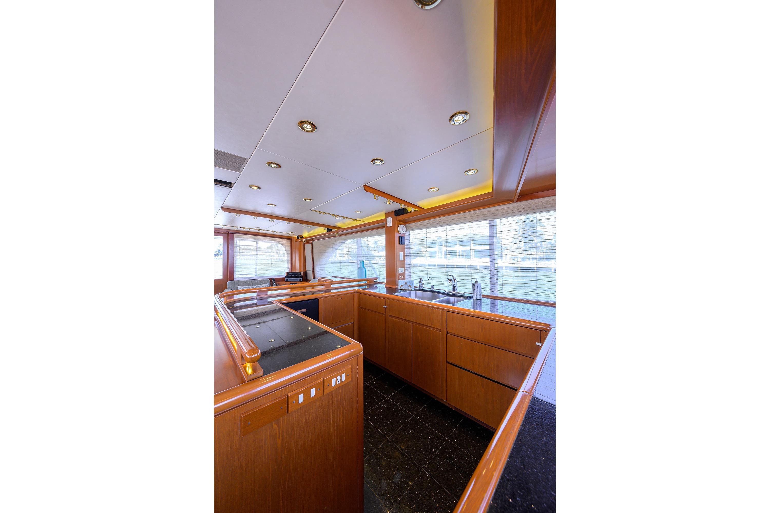 The Galley is next forward to port but very much open to the Salon. The shape is a rectangle, making the best use of the available space. The countertops and sole are in Black Galaxy granite. A timber sea rail surrounds the countertop and is the only separation between the Galley and the Salon.