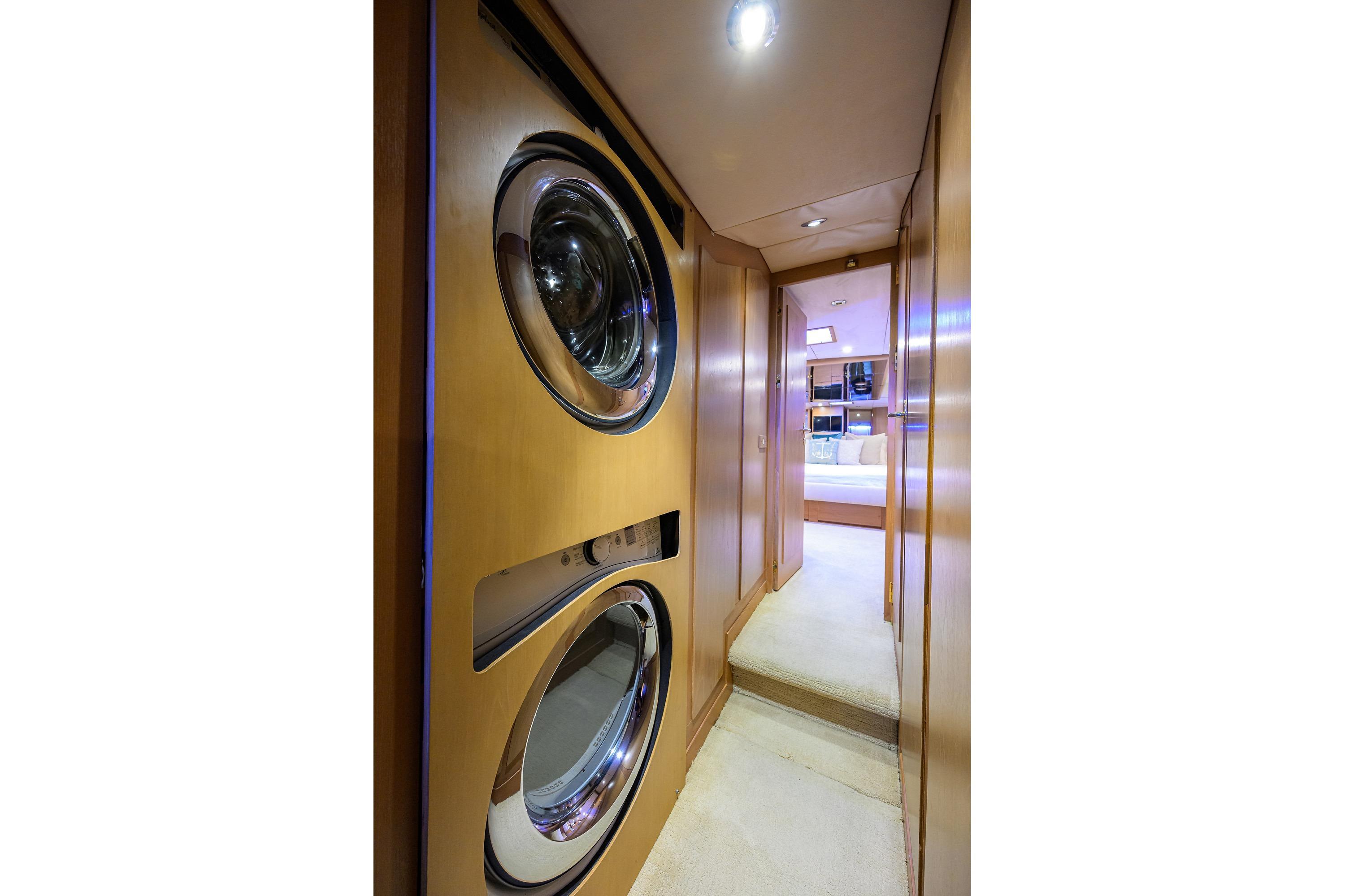 The counterbalanced doors open to a large Salon with seating groups both port and starboard. An updated LED TV faces the starboard side sofa area. The Galley is to port forward and discreetly masked by the fine joinery. To starboard is additional concealed freezer space. Centerline steps lead to the four cabins below. All four cabins are en suite. First to port is a twin lower bunk cabin with oversized berths. Opposite to starboard is an over/under cabin with two outboard berths. Next forward is the companionway laundry center with an updated Whirlpool washer and separate dryer.