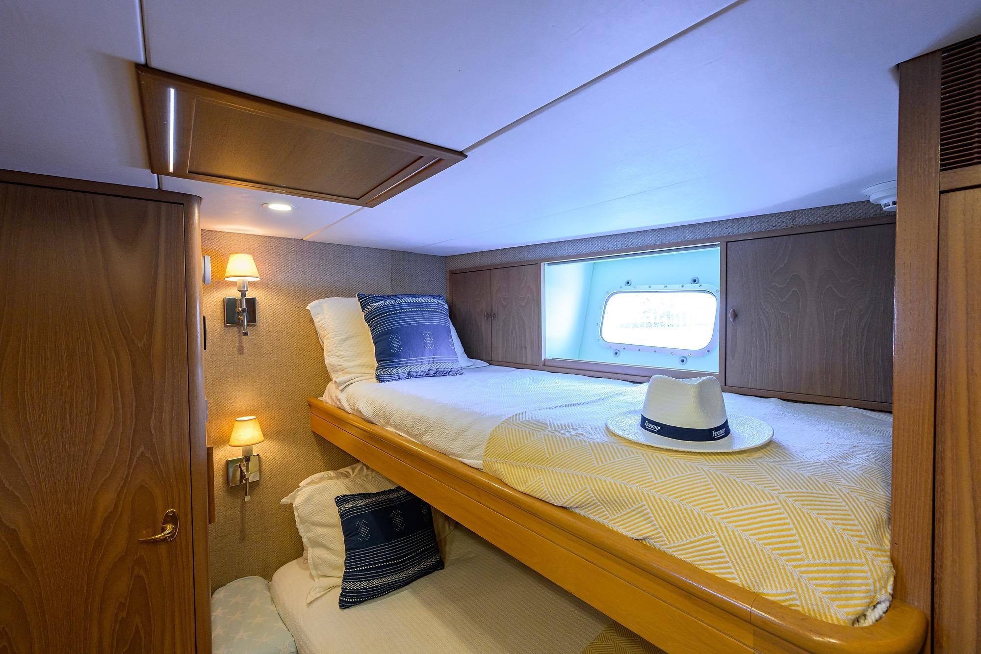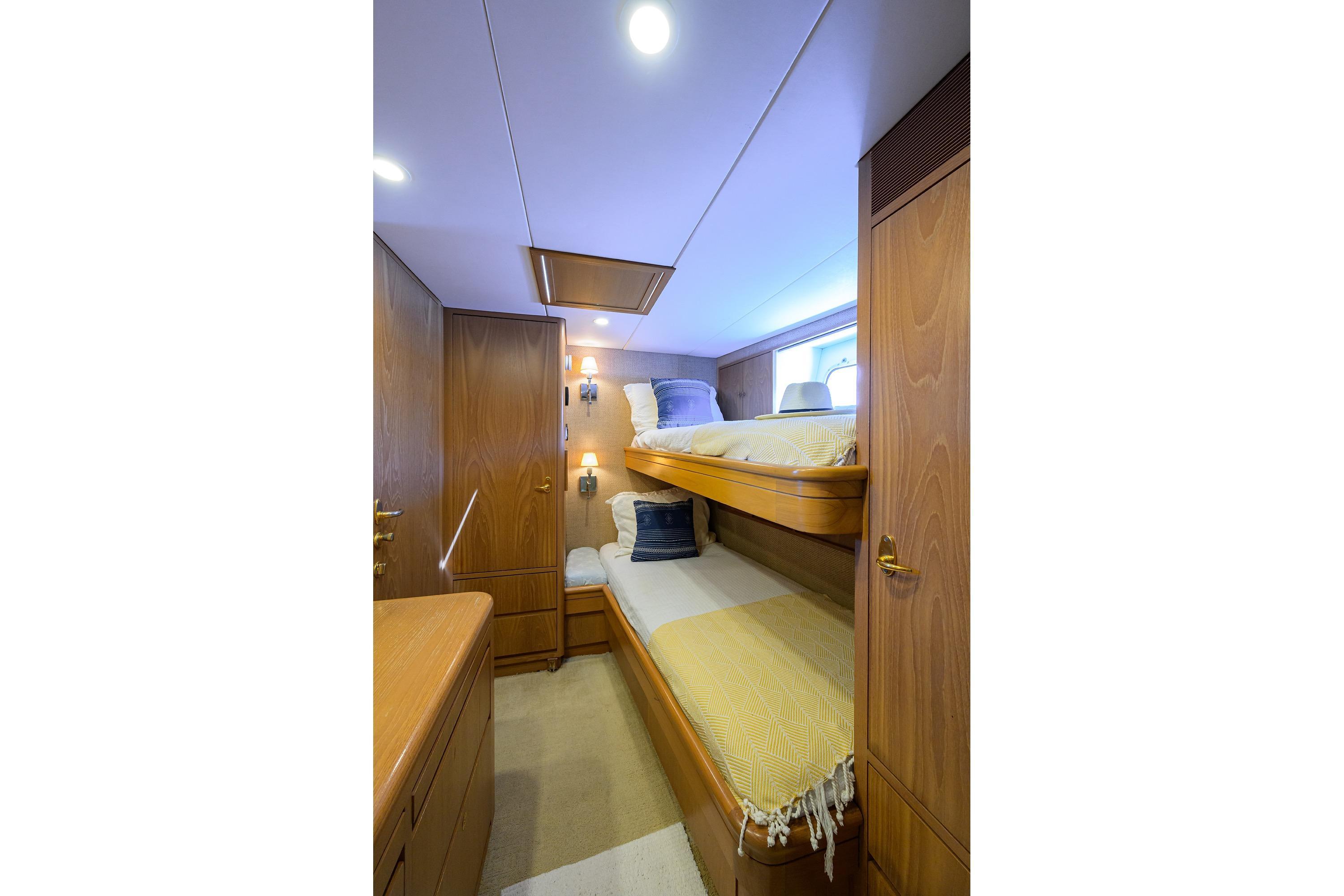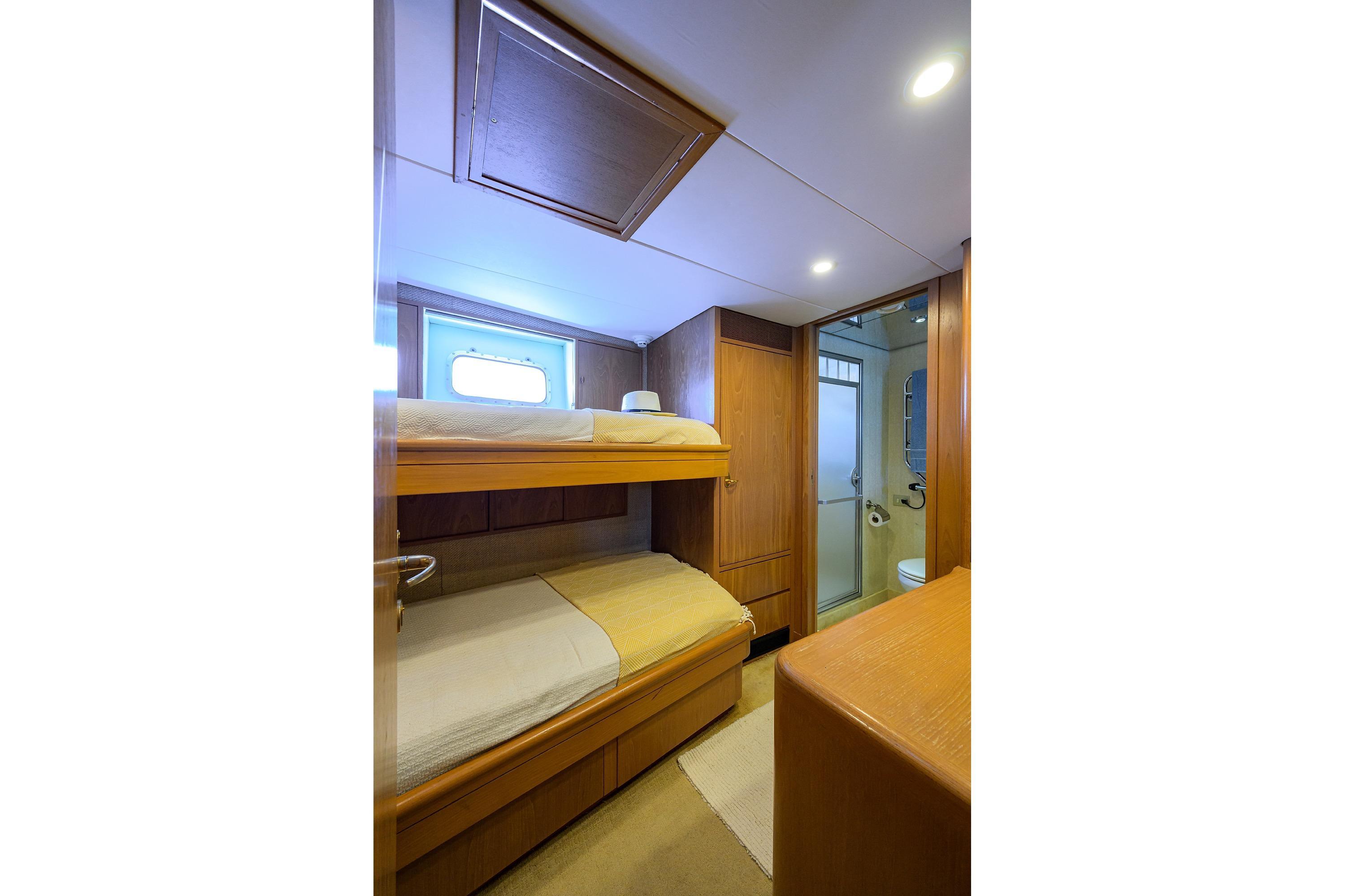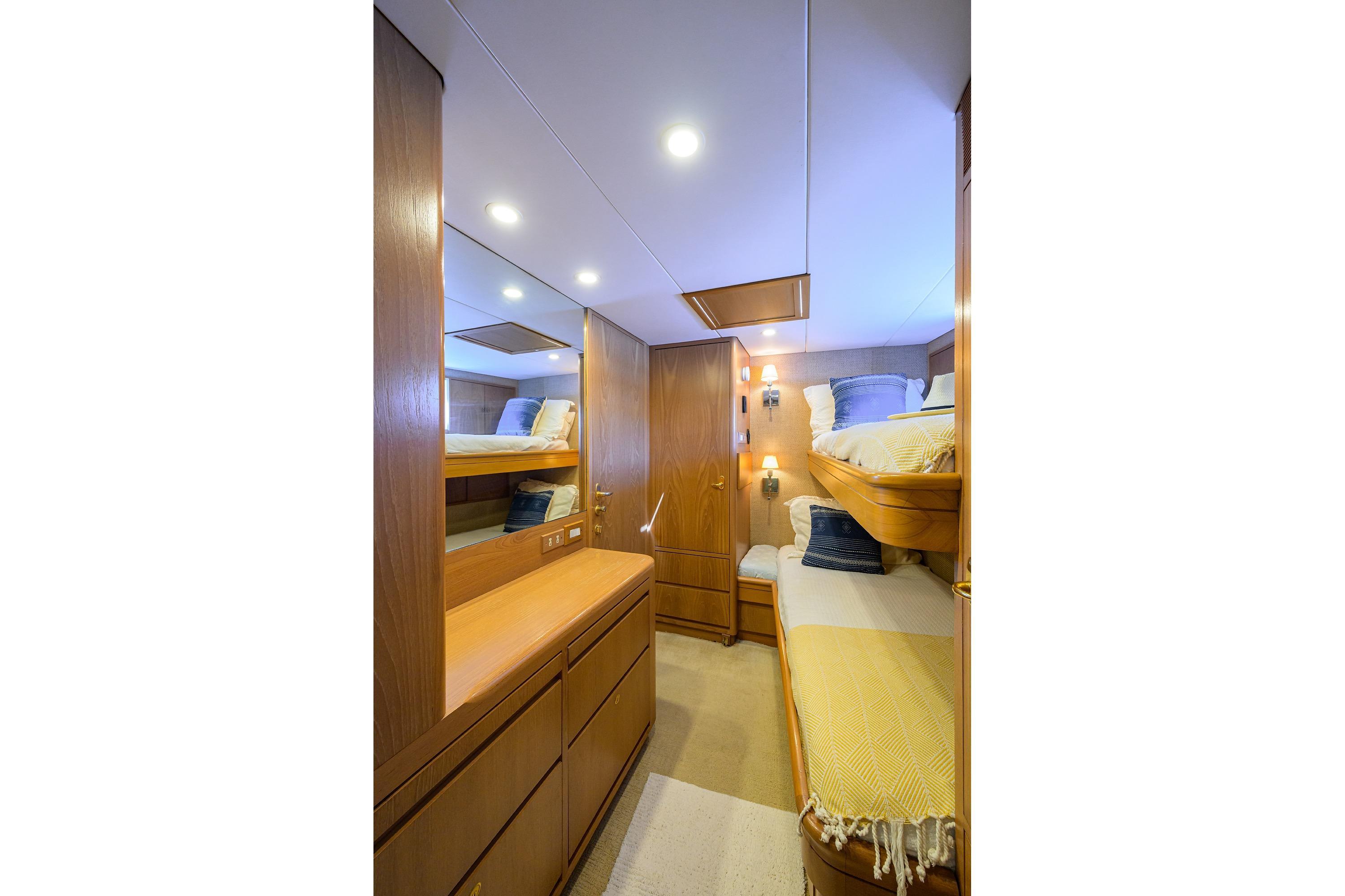 Next forward is the Crew Cabin with twin upper and lower berths along the outboard hull side. Each berth has a reading light. Just inboard is an auto-lit cedar-lined hanging locker with three drawers below. Below the lower berth is a single drawer. Above the upper berth is a fixed dead light with a removable weather cover.