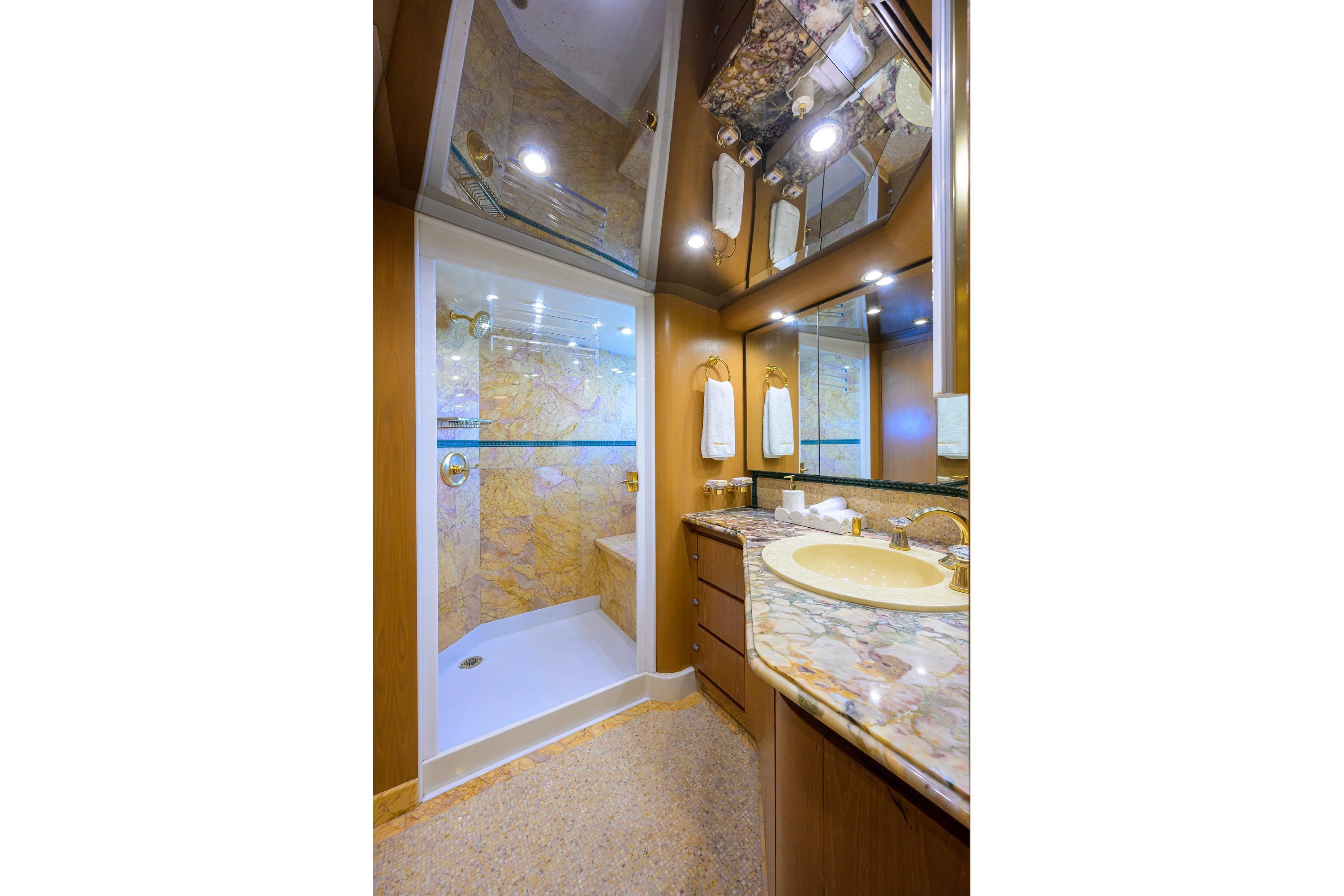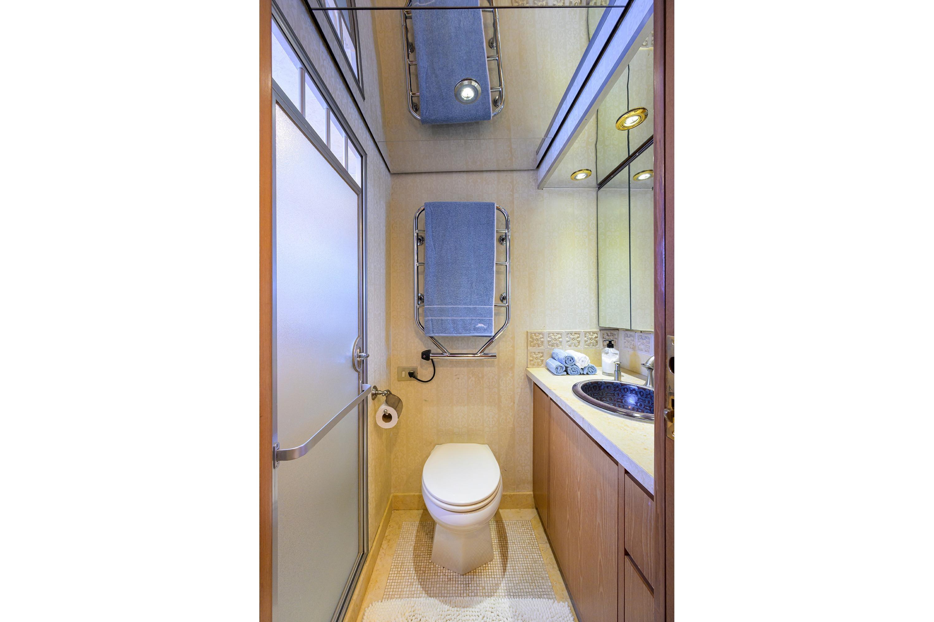 All the way forward is the Master Cabin with a centerline king berth, small settee, and a very large head and shower not usually found on yachts of this size, let alone a Convertible Sportfisherman.