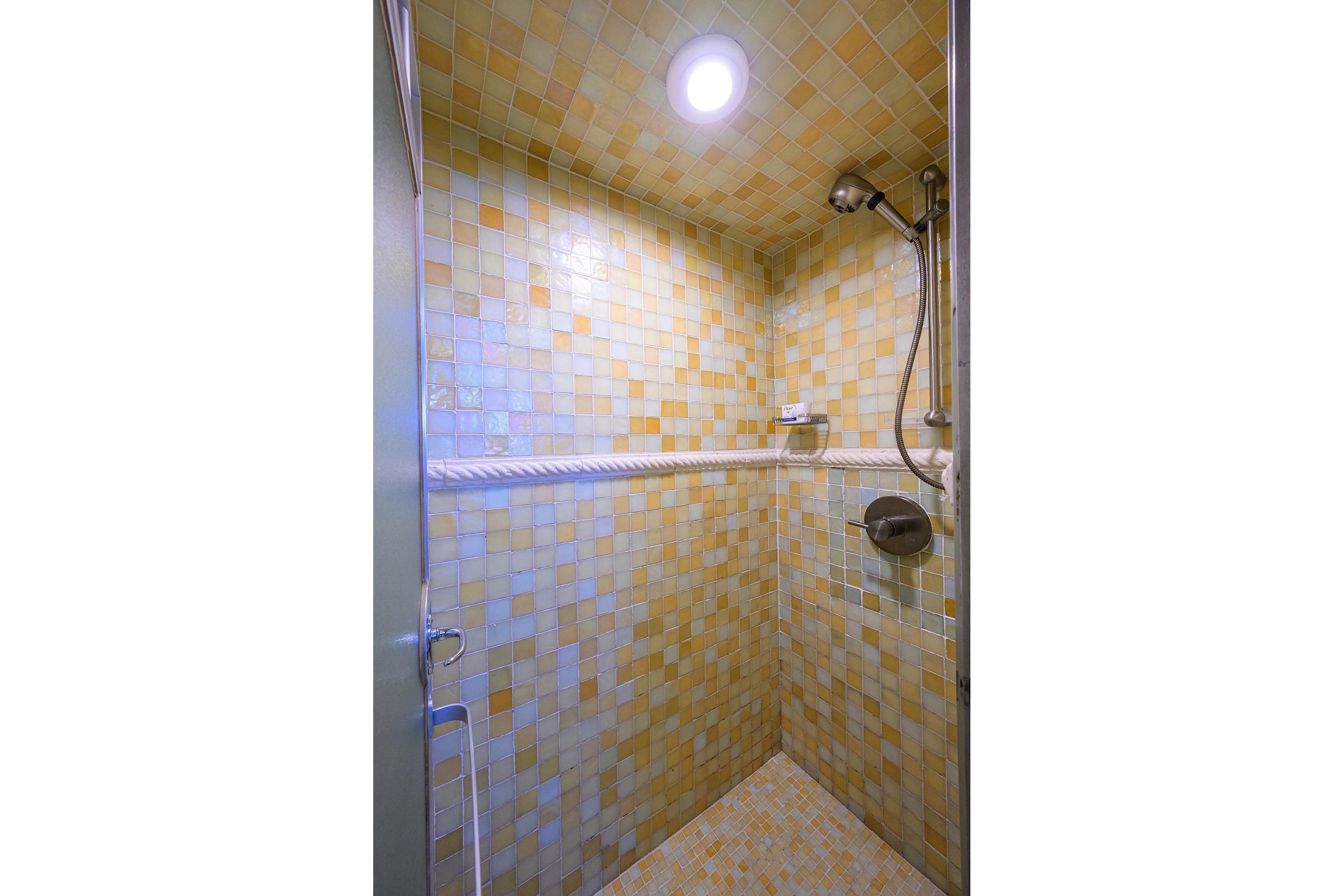 The shower has a hinged obscured glass door, 12” marble tiles to match the countertop, an obscured glass dead light with a removable storm cover, a handheld or wall mountable fixture, a light, and an exhaust fan.