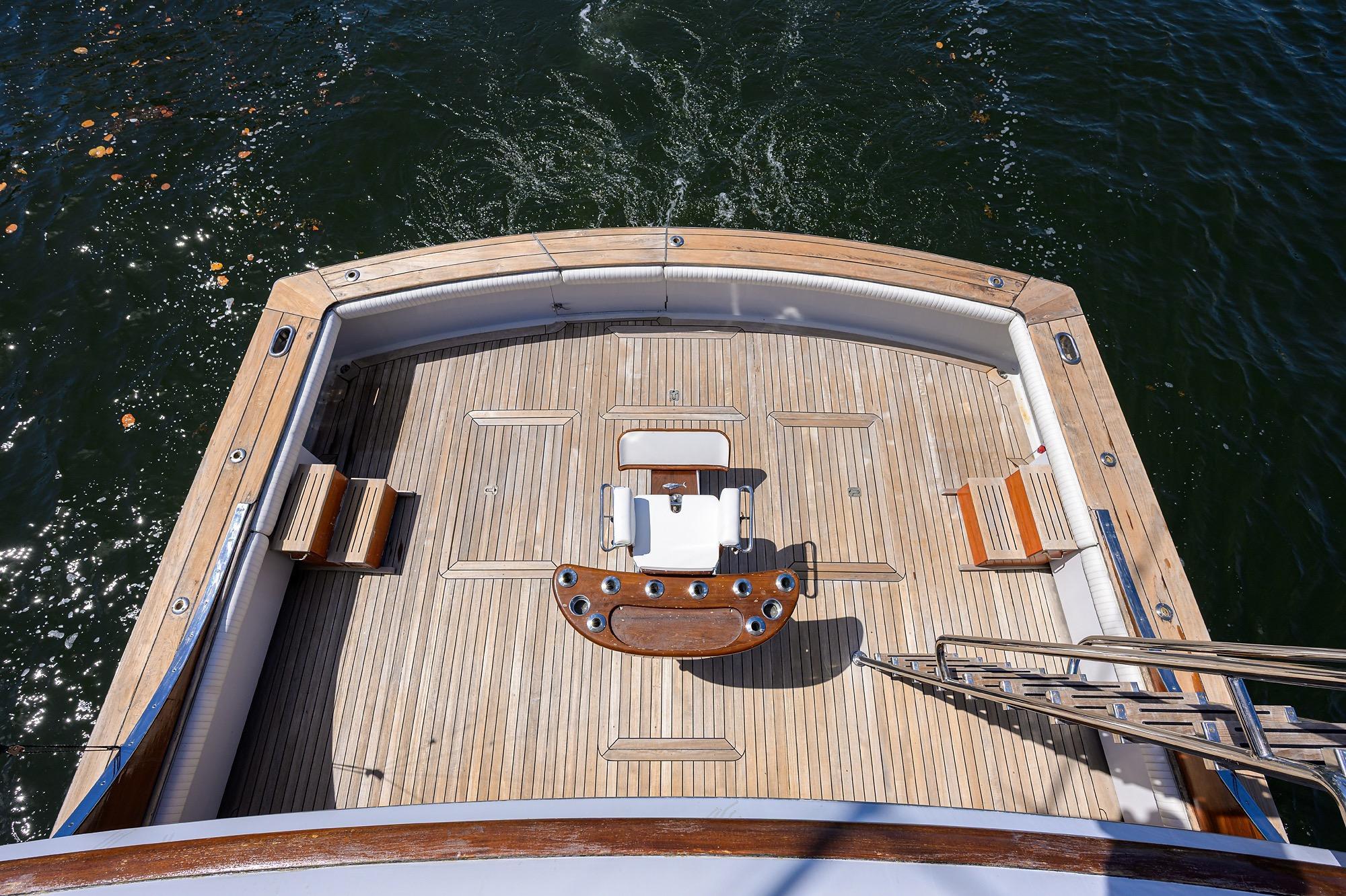 Boarding THANKS BUDS is over the covering boards from a fixed dock or through the transom door from a floating dock.