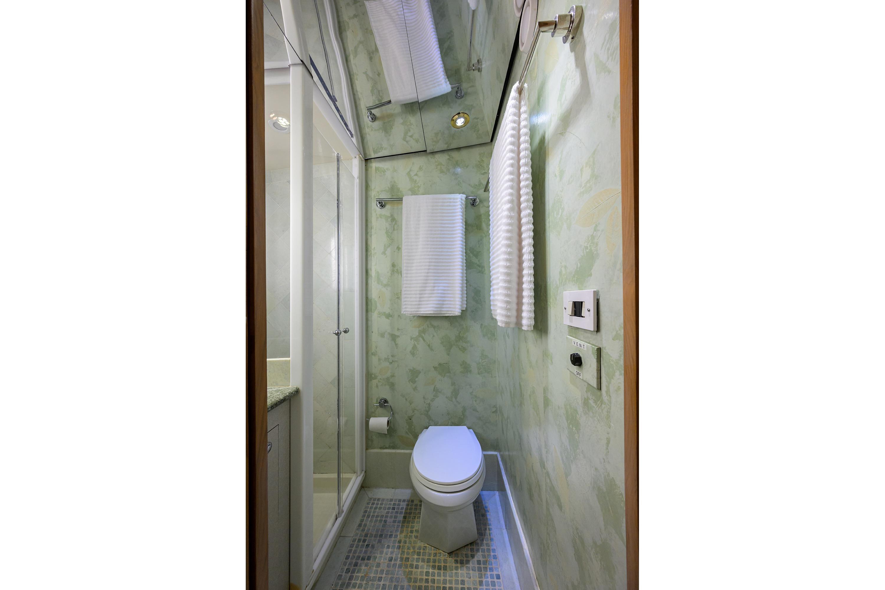 Also in this cabin is a Headhunter full-size toilet, an A/C vent, a heated towel bar, and a fixed obscure glass dead light with weather cover. Pleated shades cover the dead light. The overhead is mirrored and has six LED lights.
