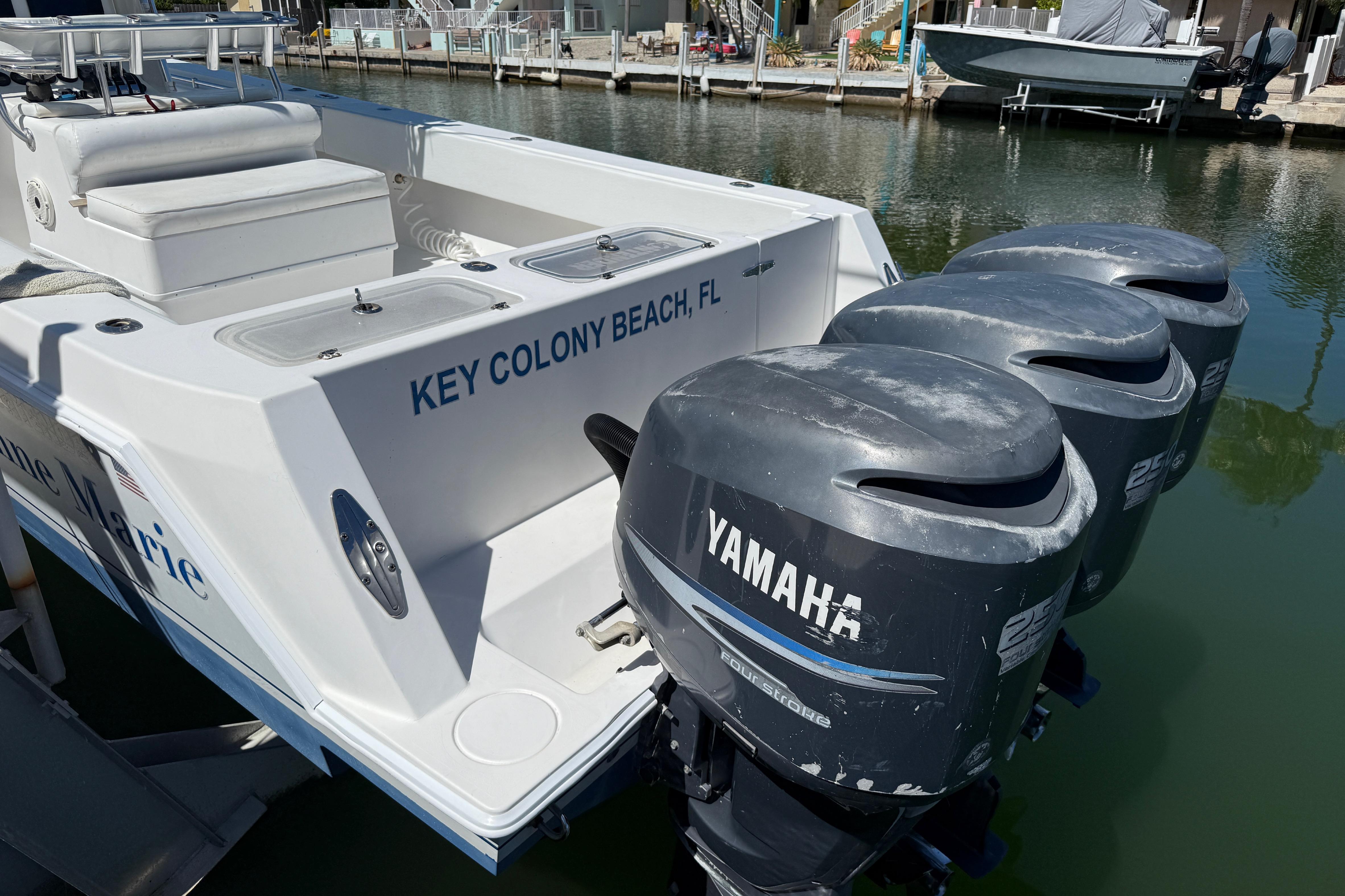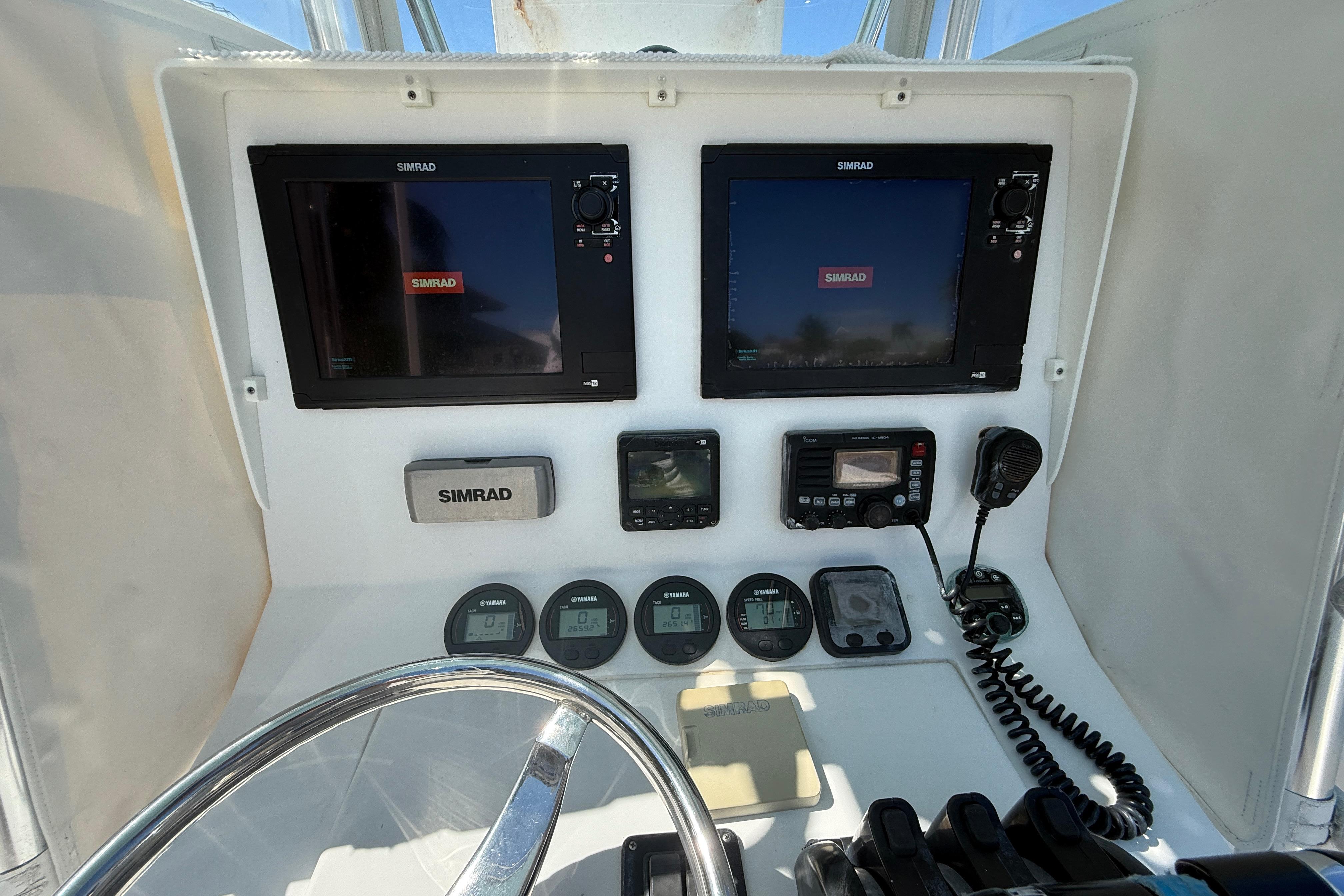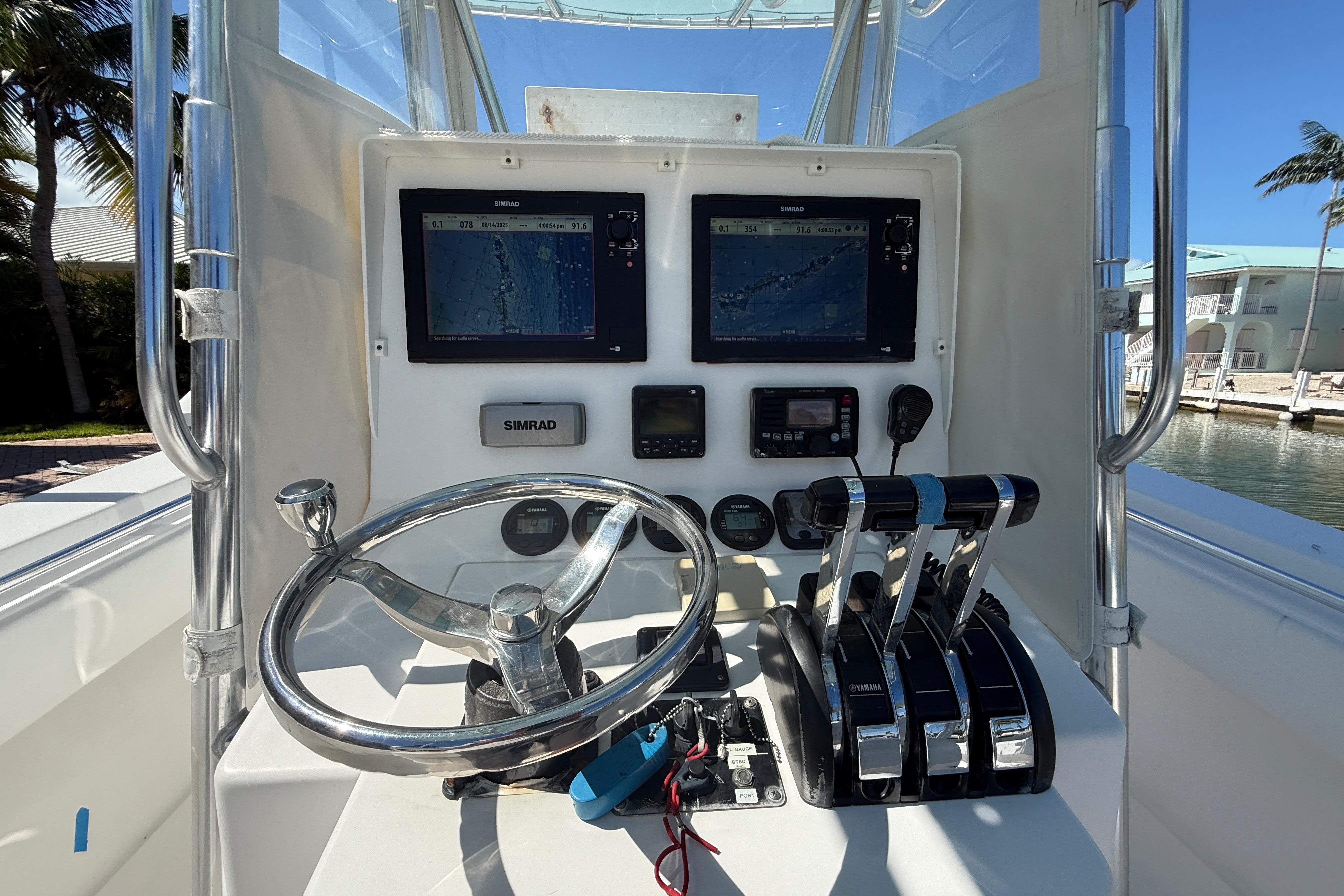 This one owner 100% Original 33T has seen some a lot of fish and has travelled most of South Florida and BahamasCosmetically not but, This boat would go 40 miles offshore tomorrow with confidence and comfort. (3) 250hp Yamahas 2500hrs(2) Simrad NSS 12" (3) plumbed and operational Livewells JL audio amp and speakers.****Needs: Auto Pilot Display, VHF and Head Unit.***