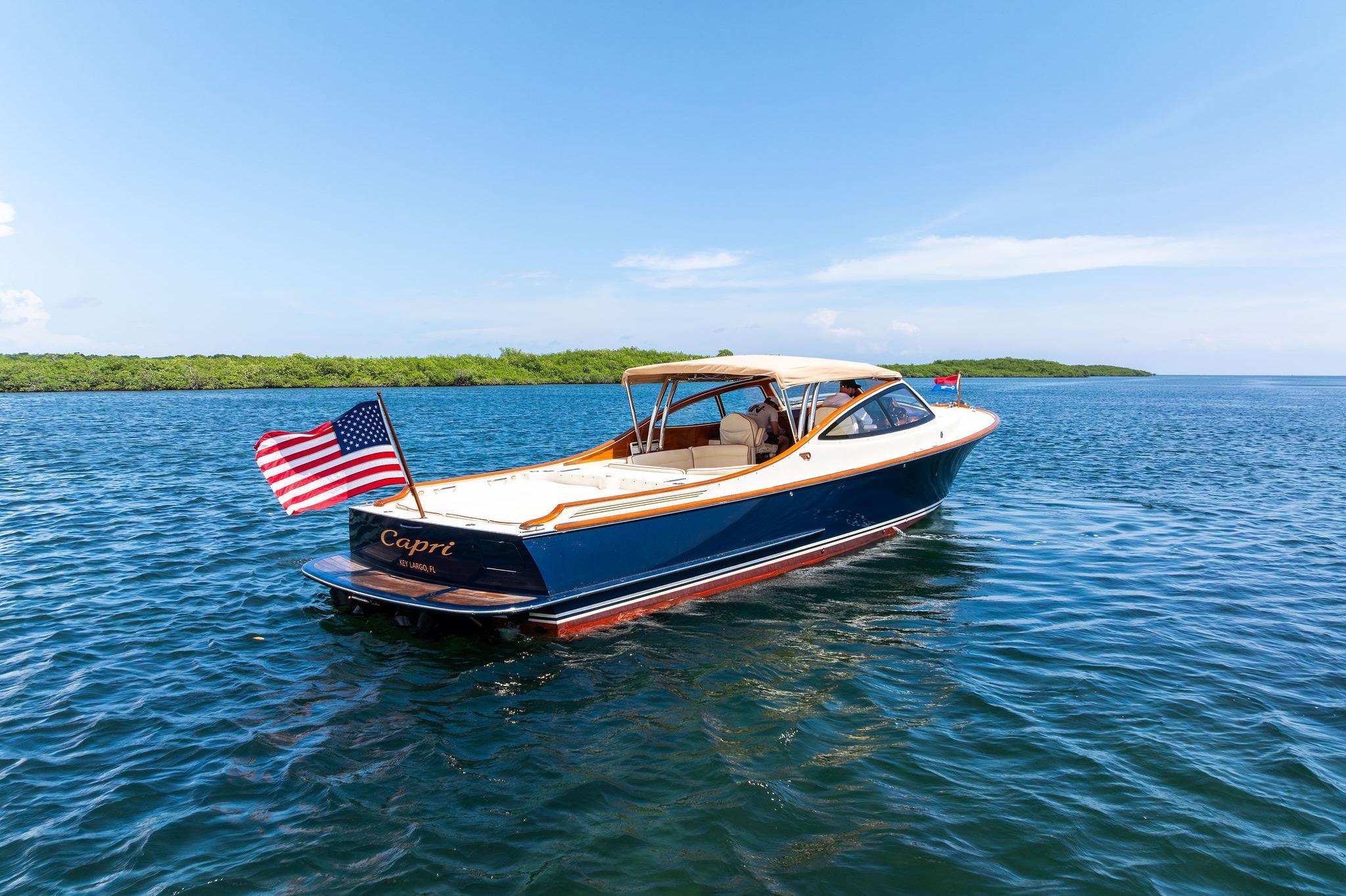 The 2008 Hinckley Talaria 38R Convertible is a high-end luxury runabout known for its classic design, meticulous craftsmanship, and advanced features. CAPRI is a well-regarded vessel, combining classic style with modern technology, making it a "serious candidate for yachting's ultimate day boat" with the added convenience of overnight cruising.HIGHLIGHTSDiesel Waterjet picnic boat with hydraulic-electric convertible top (fail proof)Professionally maintained.Dual Volvo D-6 Diesel 435 HP inboardsTwin Hamilton 274 Jet drivesBow ThrusterIntegrated Jetstick control; integrated steering and control of steering, forward and aft motion and bow thrusterNorthern Lights GeneratorReverse Cycle air conditioning for forward cabin and cockpit2024 Garmin Color Chart plotter at helmCustom upholstered Helm and Companion seatsMatching custom upholstered cockpit seating and aft sun padHydraulically controlled helm seatFull canvas coversCanvas Side and aft curtainsInterior cabin with V-settee, side galley and head with showerVarnished teak toe railsSwim platform and ladderTeak cockpit soleSCRIMP construction with Awlgrip Hull finish completed August 2025.