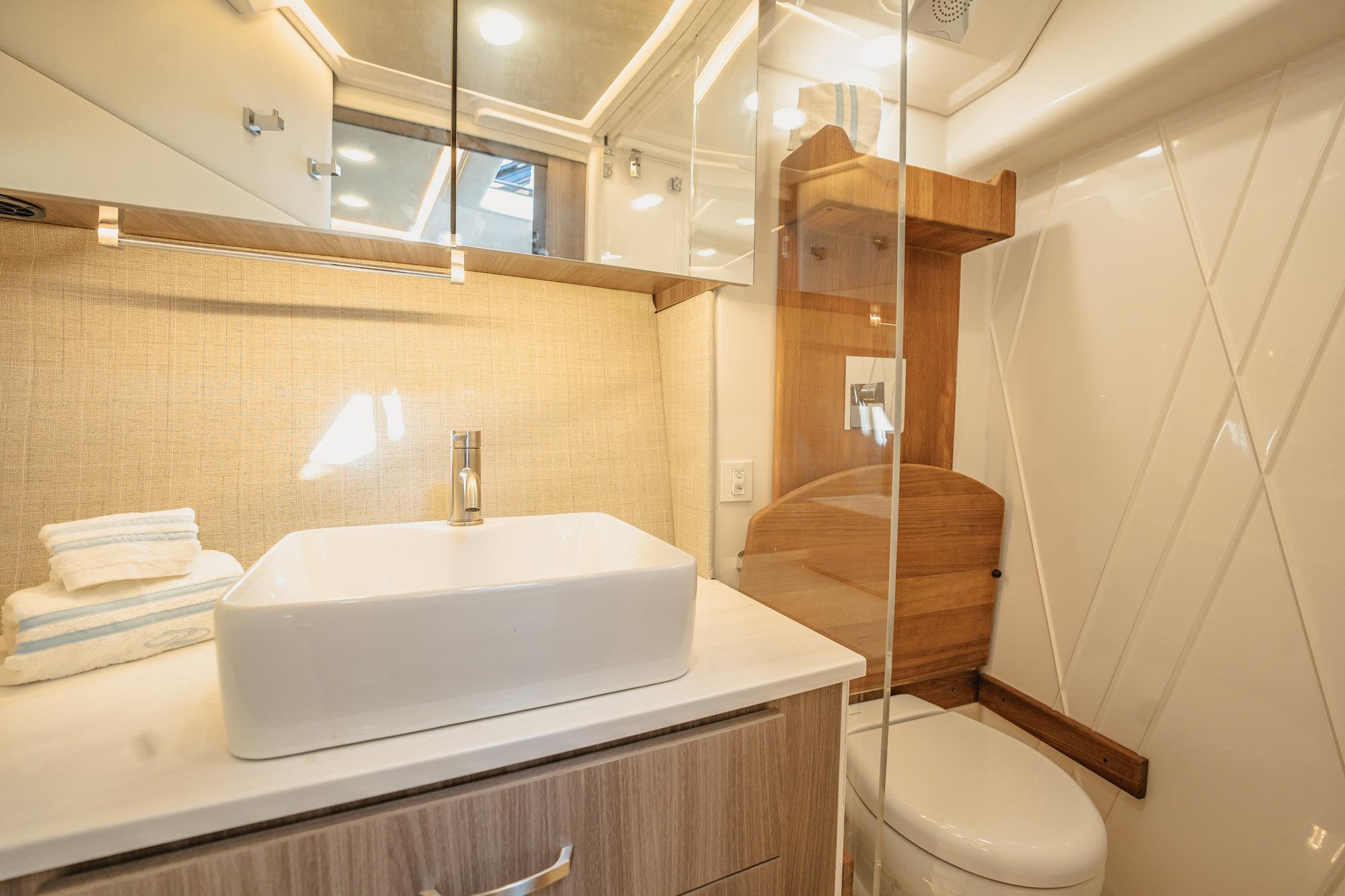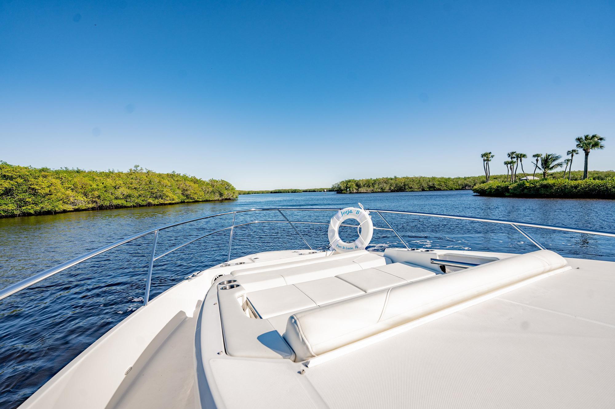 Portside fwd on the helm deck, there is a passthrough doorway to the amazing bow seating area with adjustable back rests. It is the perfect place to relax and enjoy the scenery while underway or at anchor. Large storage area hatch and a neatly tucked away electric windlass. The cabin sliding door is on the centerline and opens up to a small set of stairs to the lower accommodations.